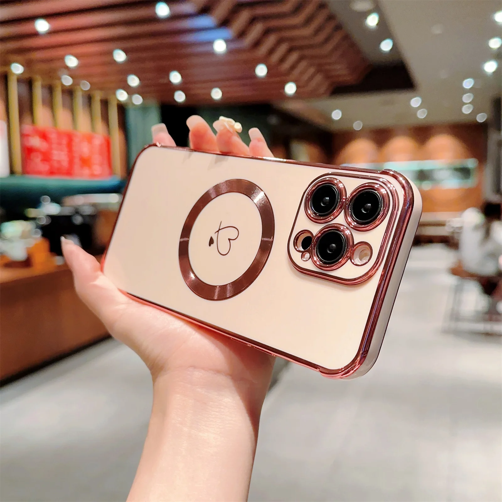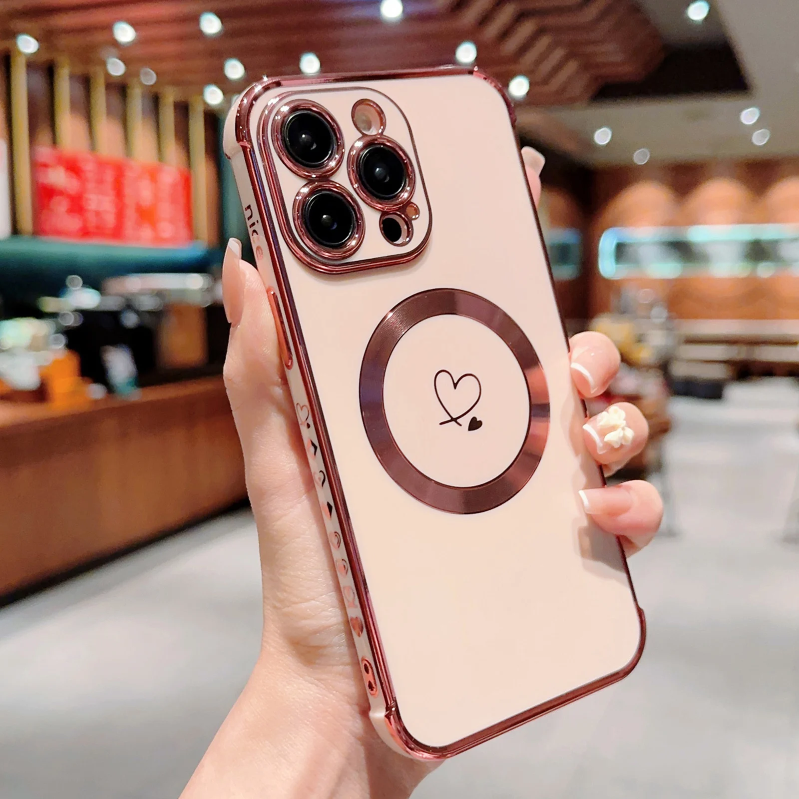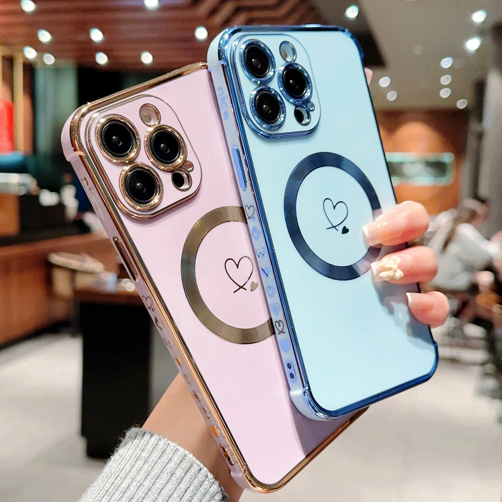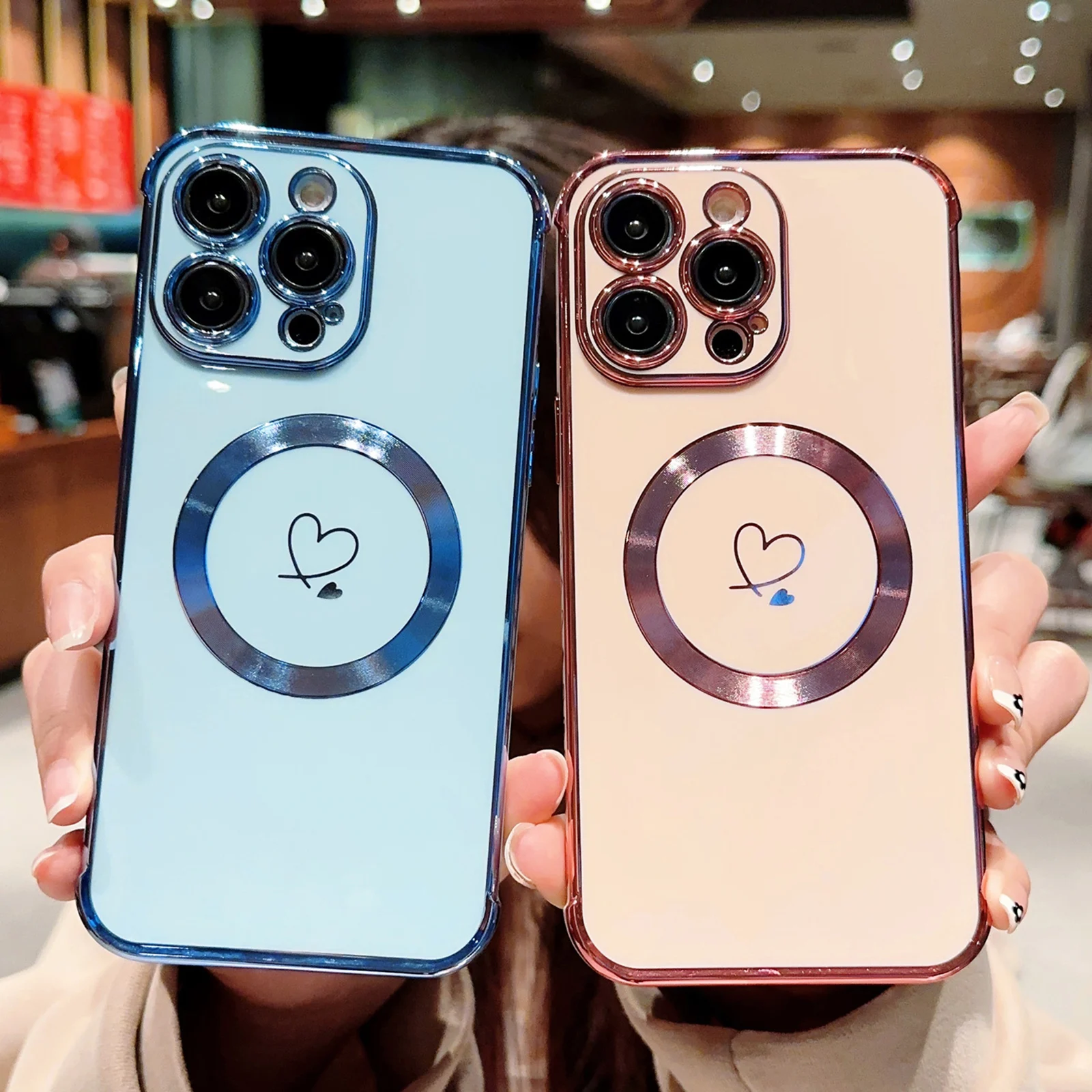 Comprar Funda magnética de corazón chapado para iPhone, 15, 14, 13, 12, 11 Pro Max, 14 Plus, Magsafe, carga inalámbrica, parachoques suave, cubierta a prueba de golpes