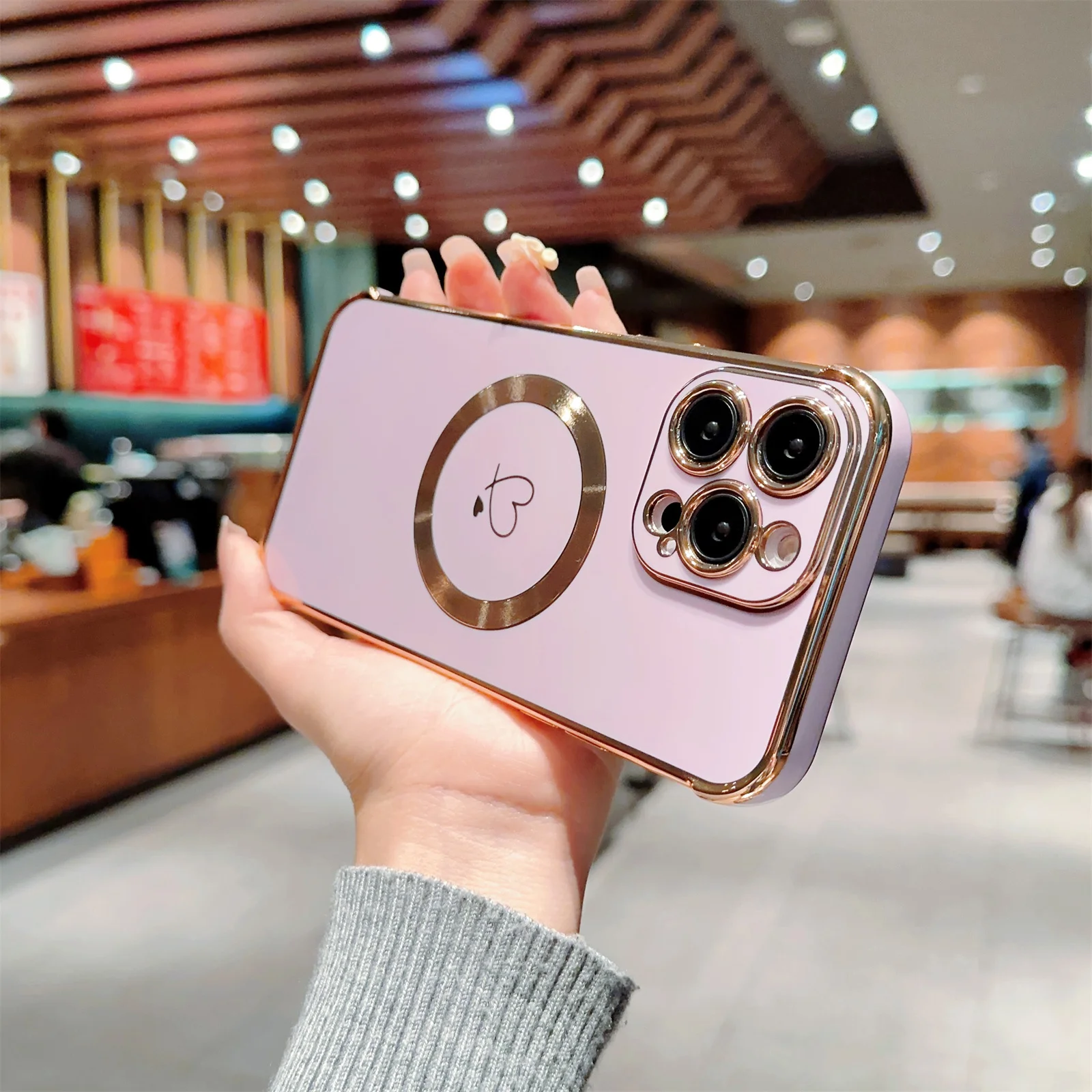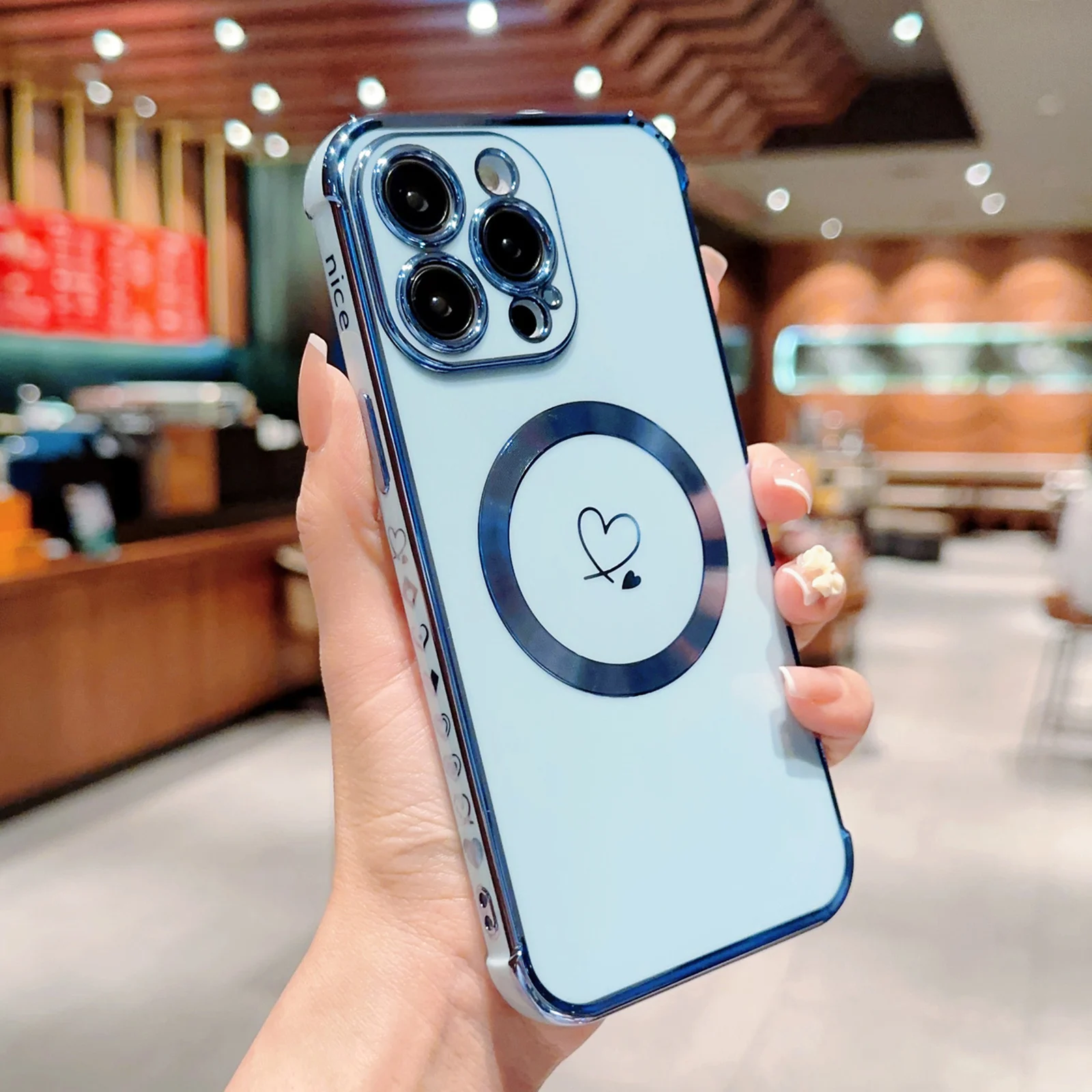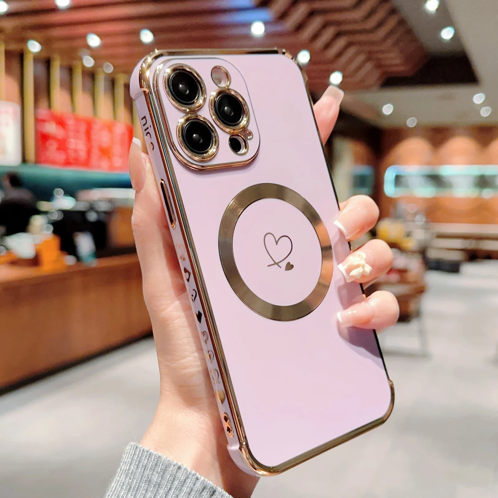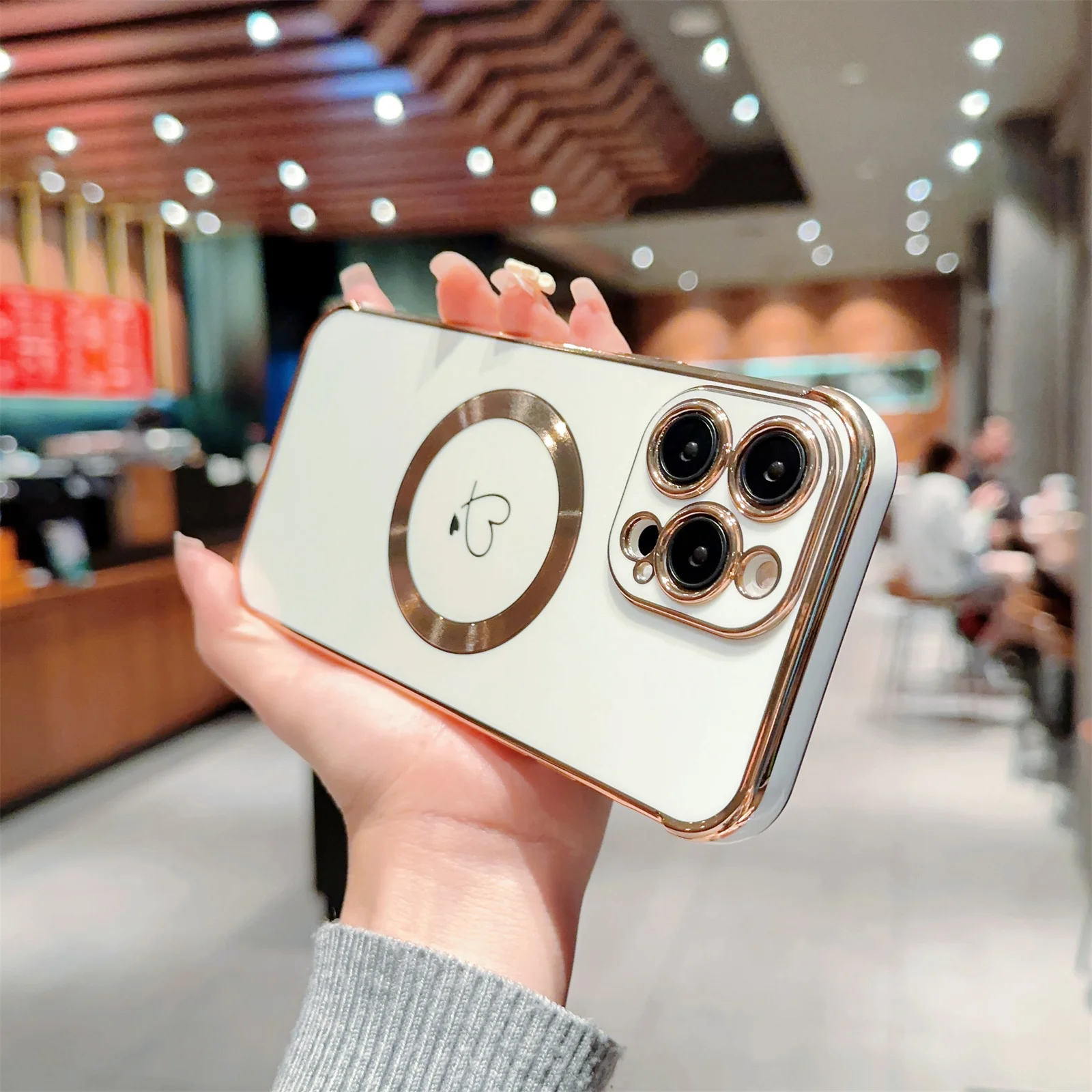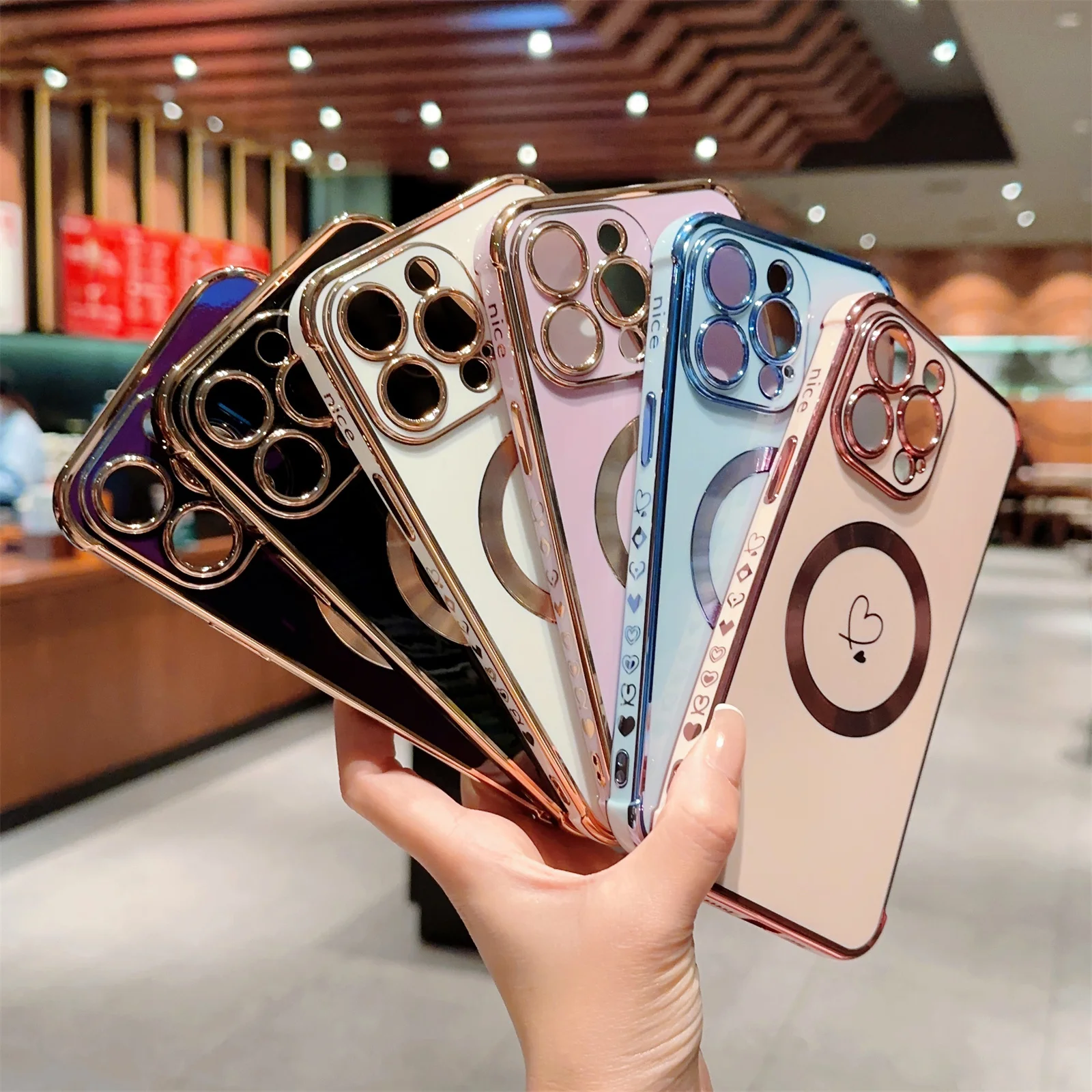 Comprar Funda magnética de corazón chapado para iPhone, 15, 14, 13, 12, 11 Pro Max, 14 Plus, Magsafe, carga inalámbrica, parachoques suave, cubierta a prueba de golpes