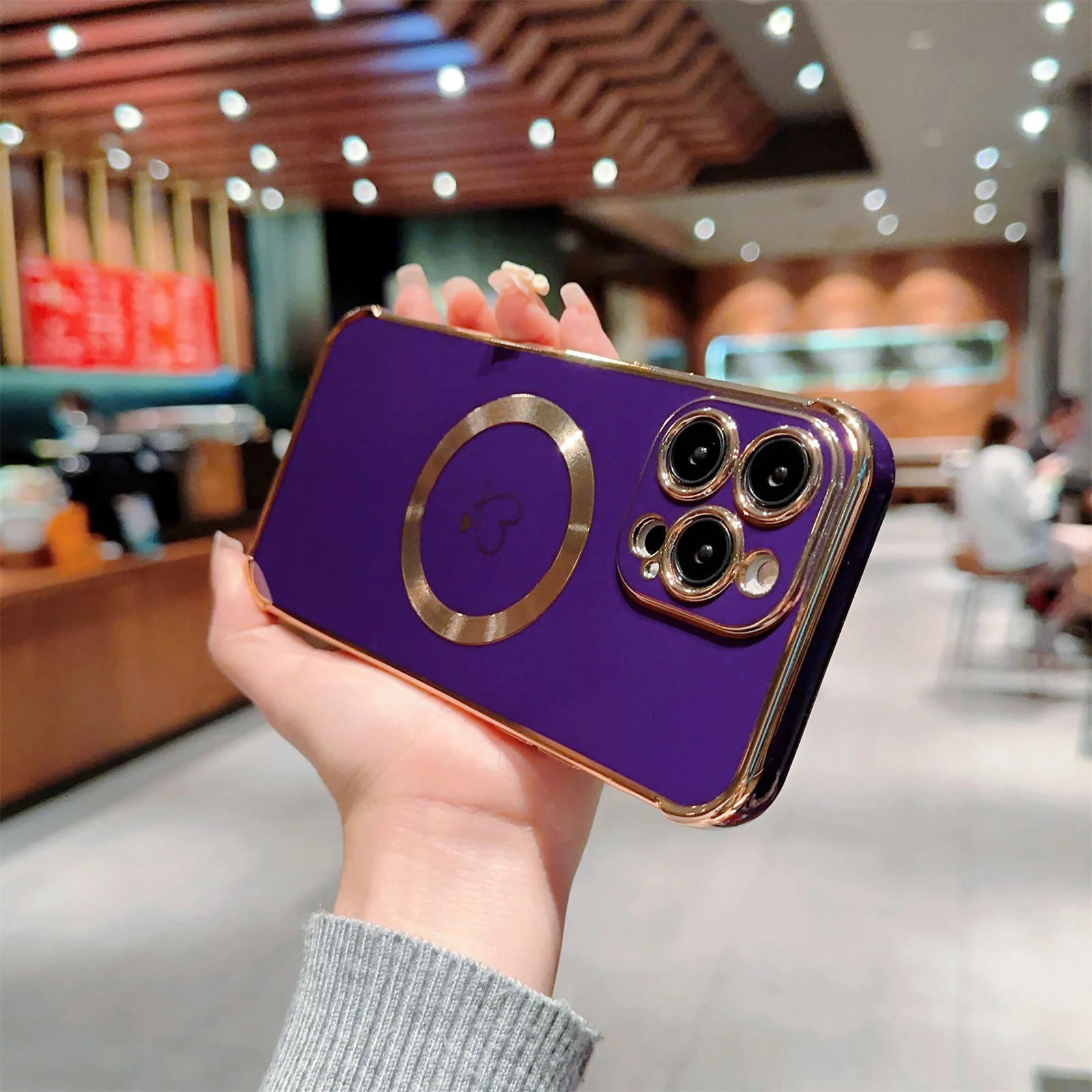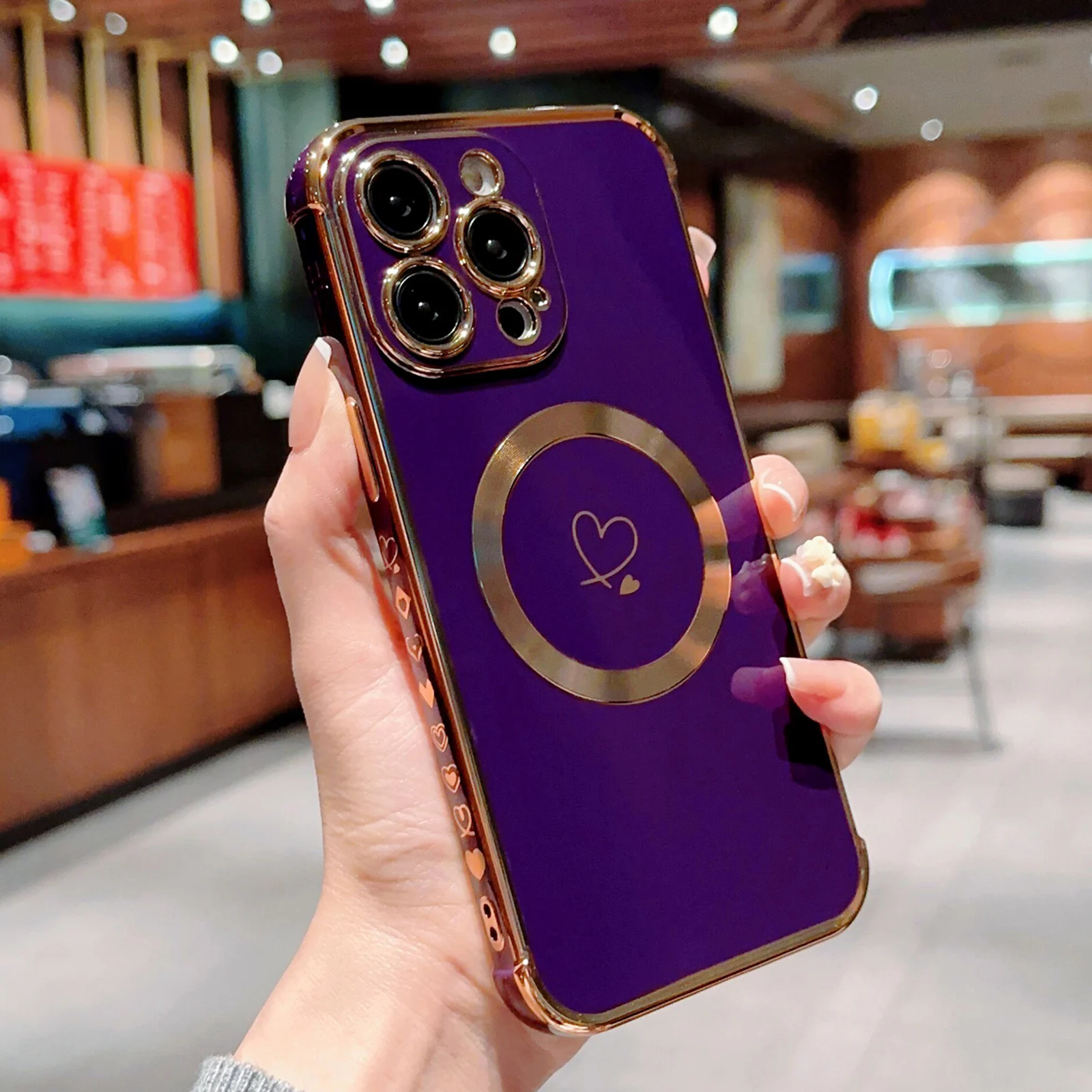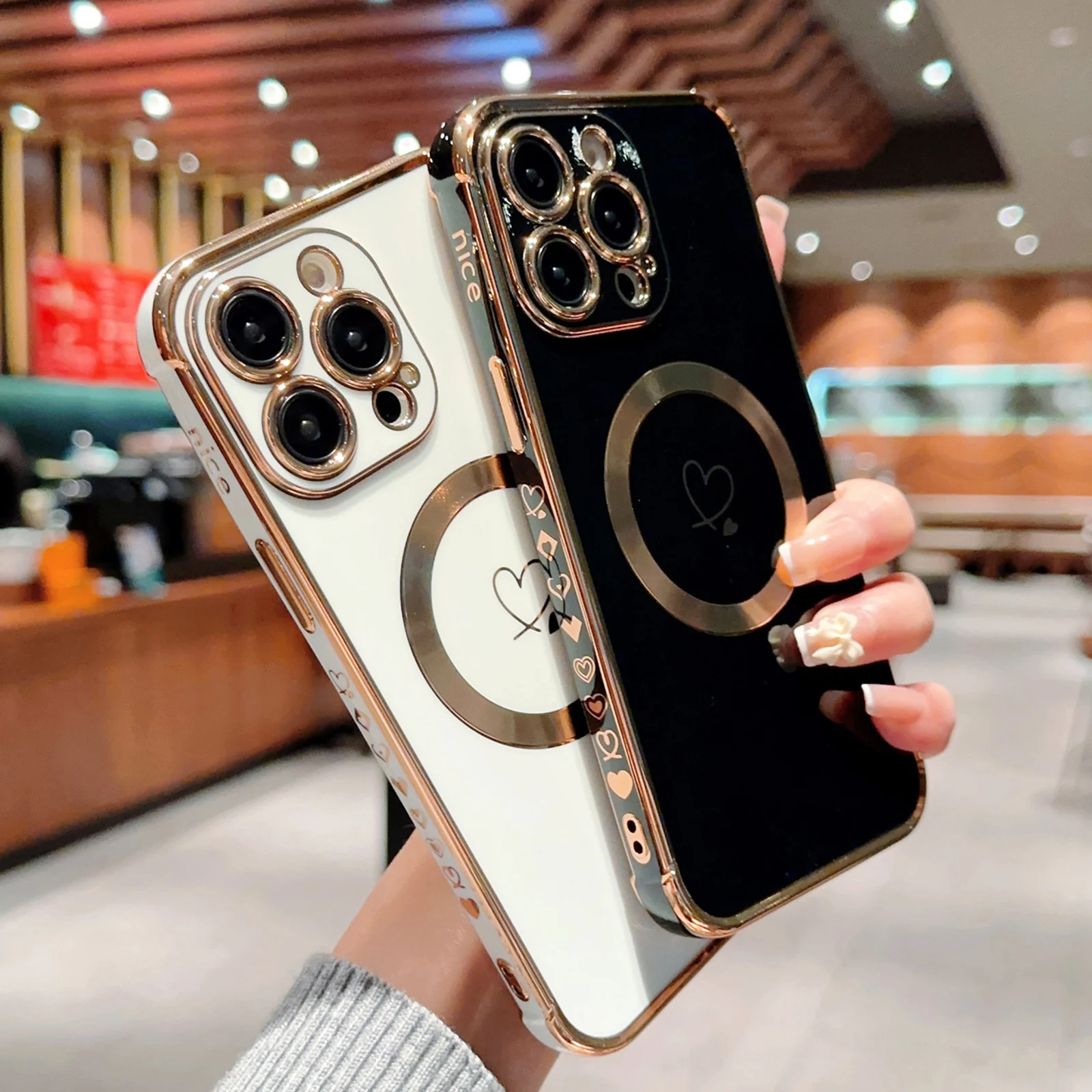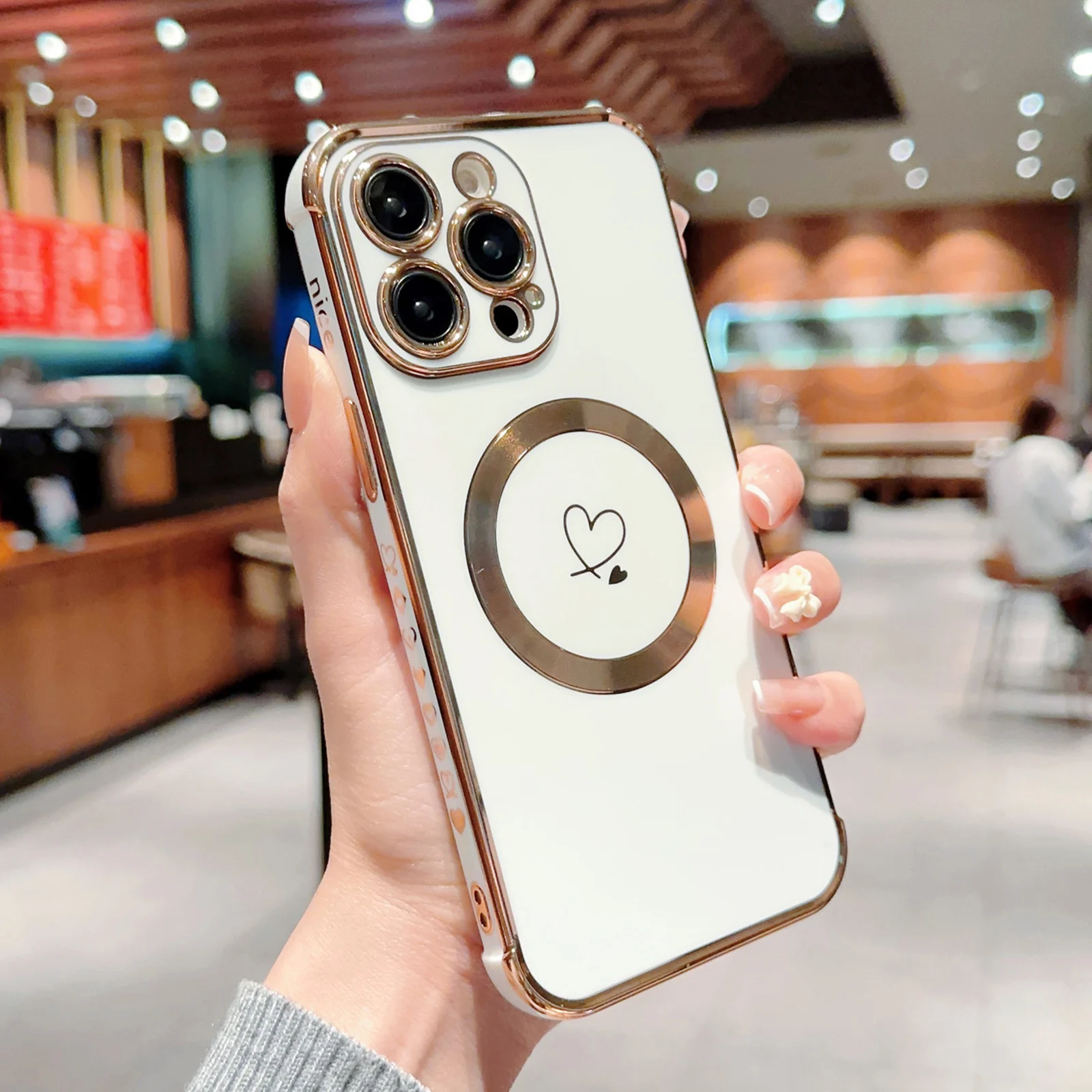 Comprar Funda magnética de corazón chapado para iPhone, 15, 14, 13, 12, 11 Pro Max, 14 Plus, Magsafe, carga inalámbrica, parachoques suave, cubierta a prueba de golpes