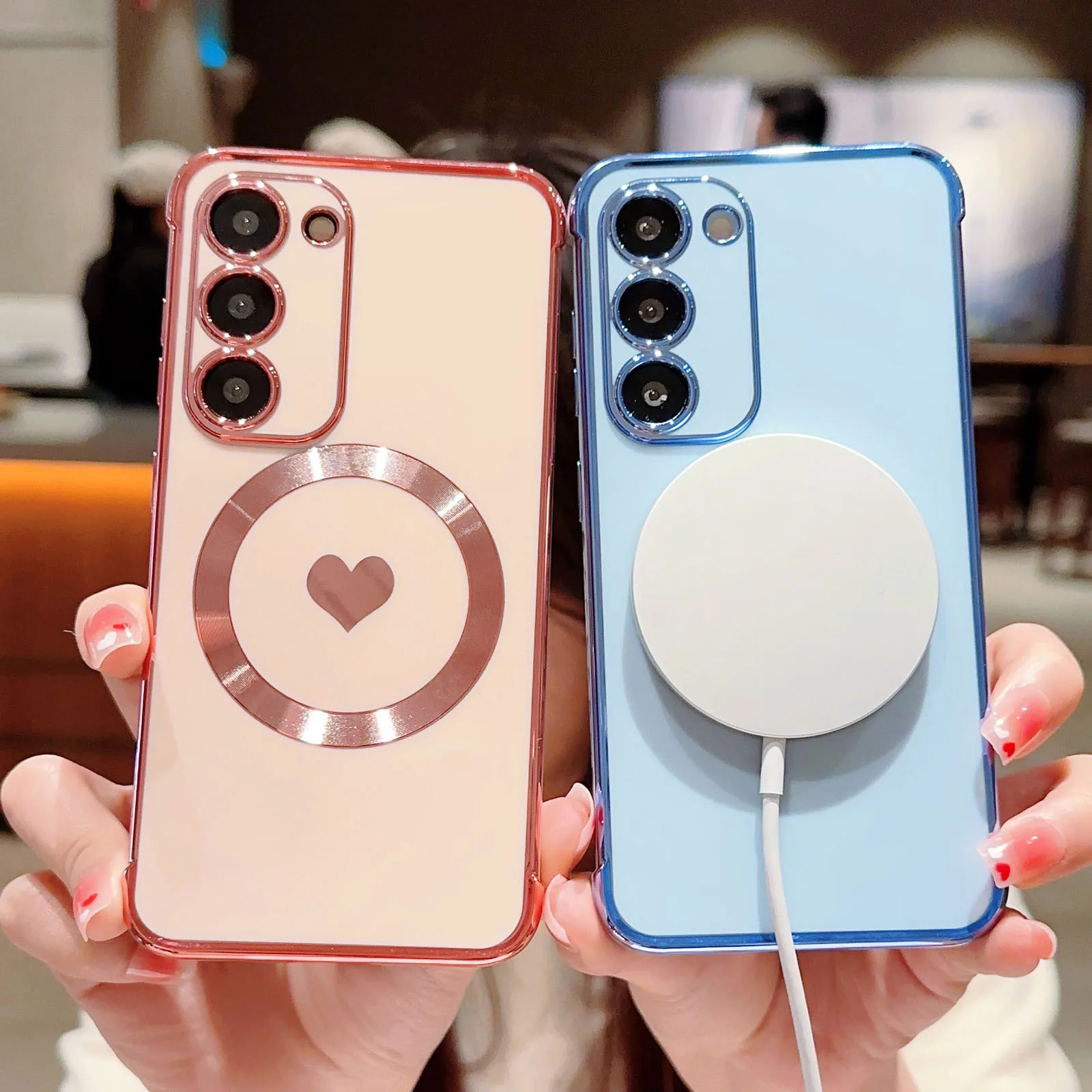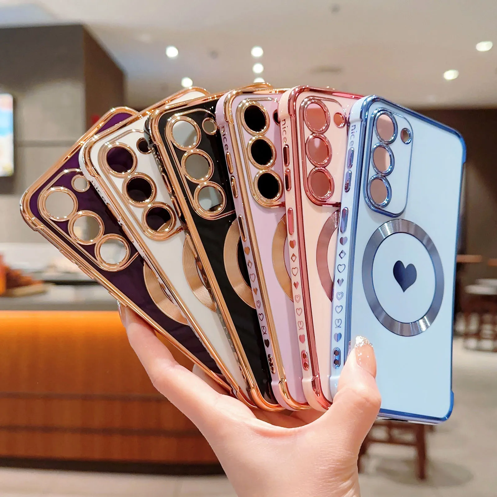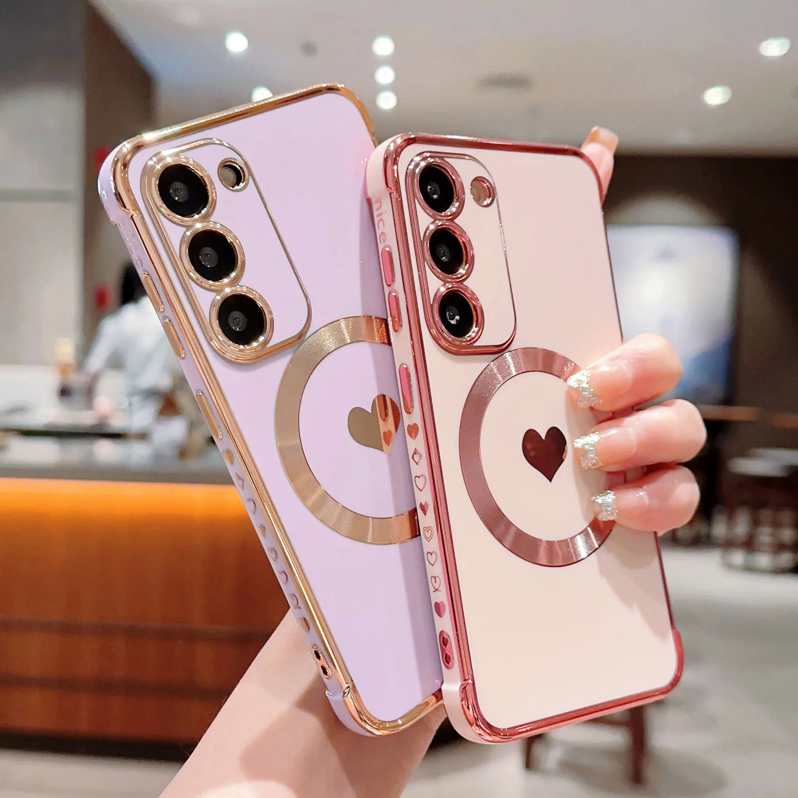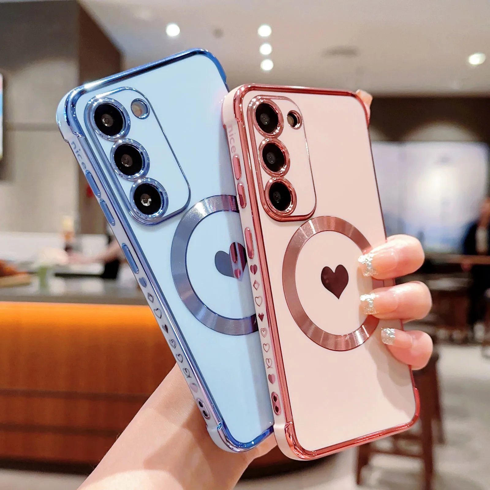 Comprar Funda magnética de corazón chapado para Samsung Galaxy S23 S22 S21 Ultra S21 S20 FE para Magsafe carga inalámbrica cubierta suave a prueba de golpes