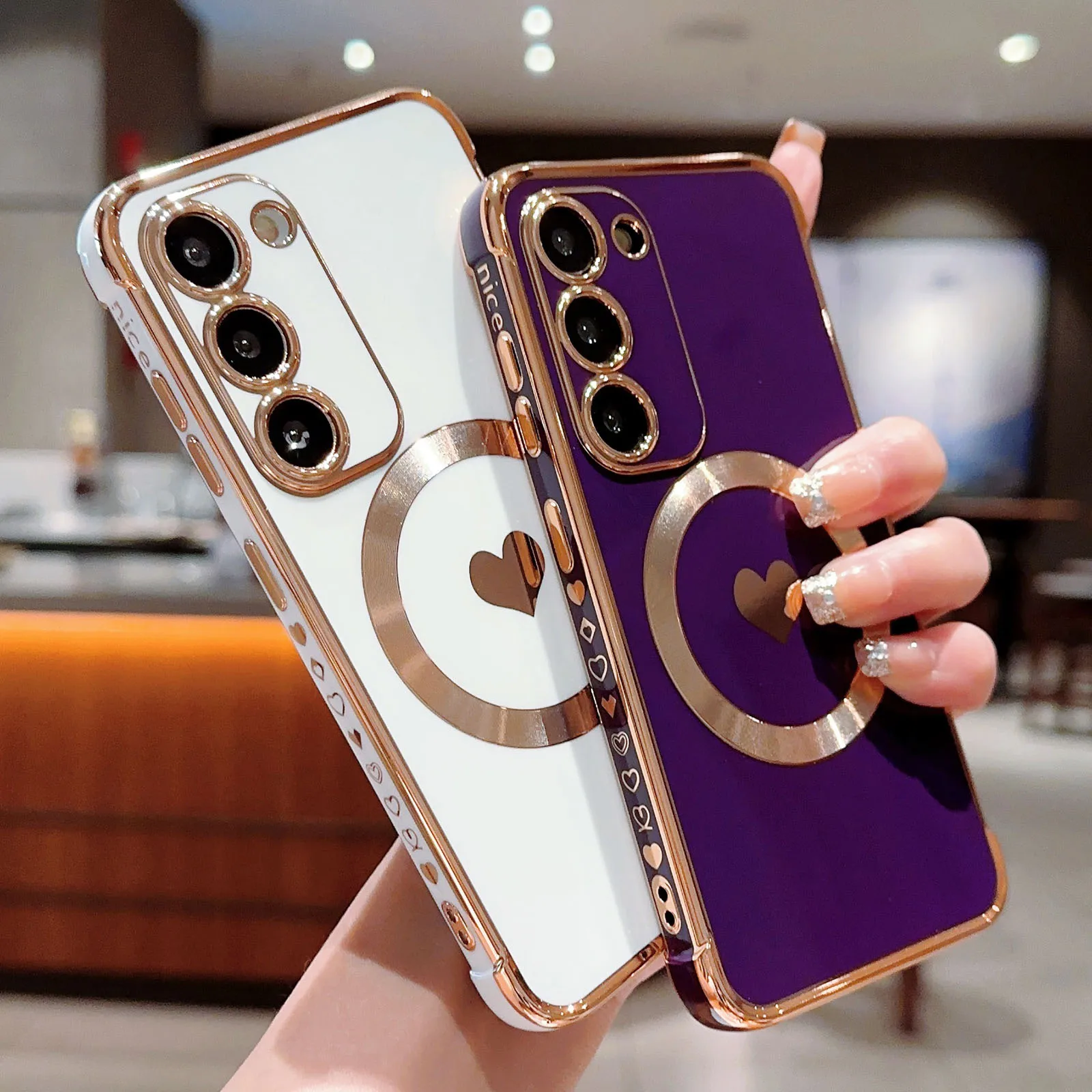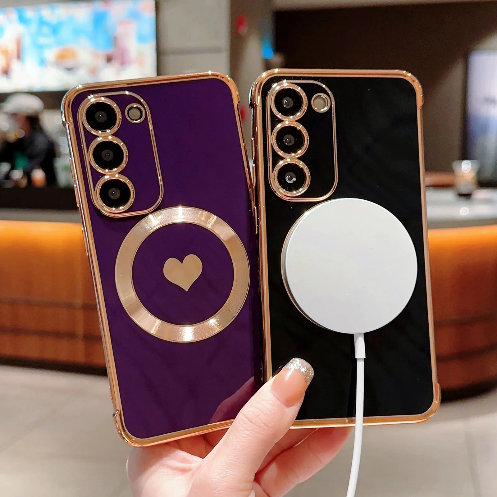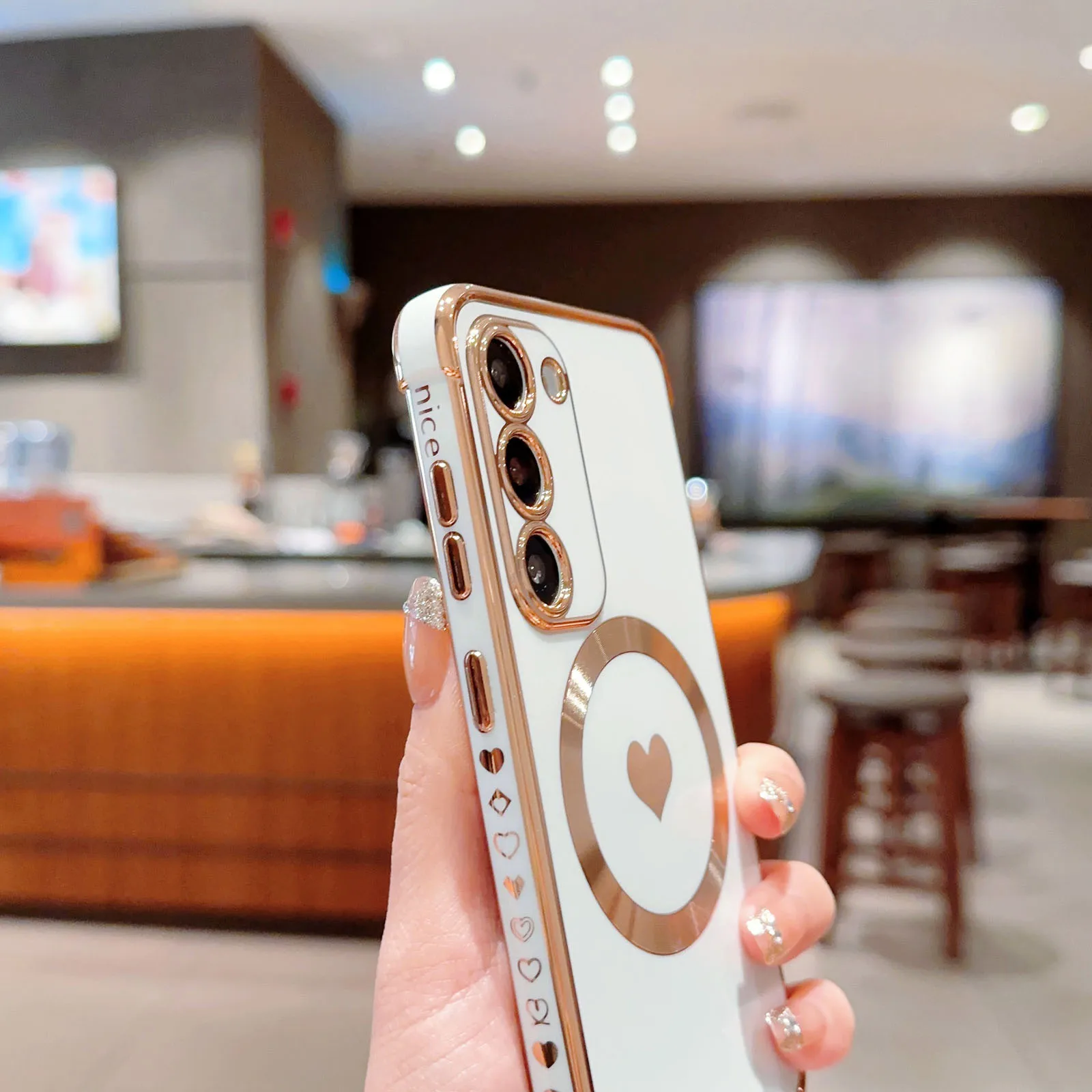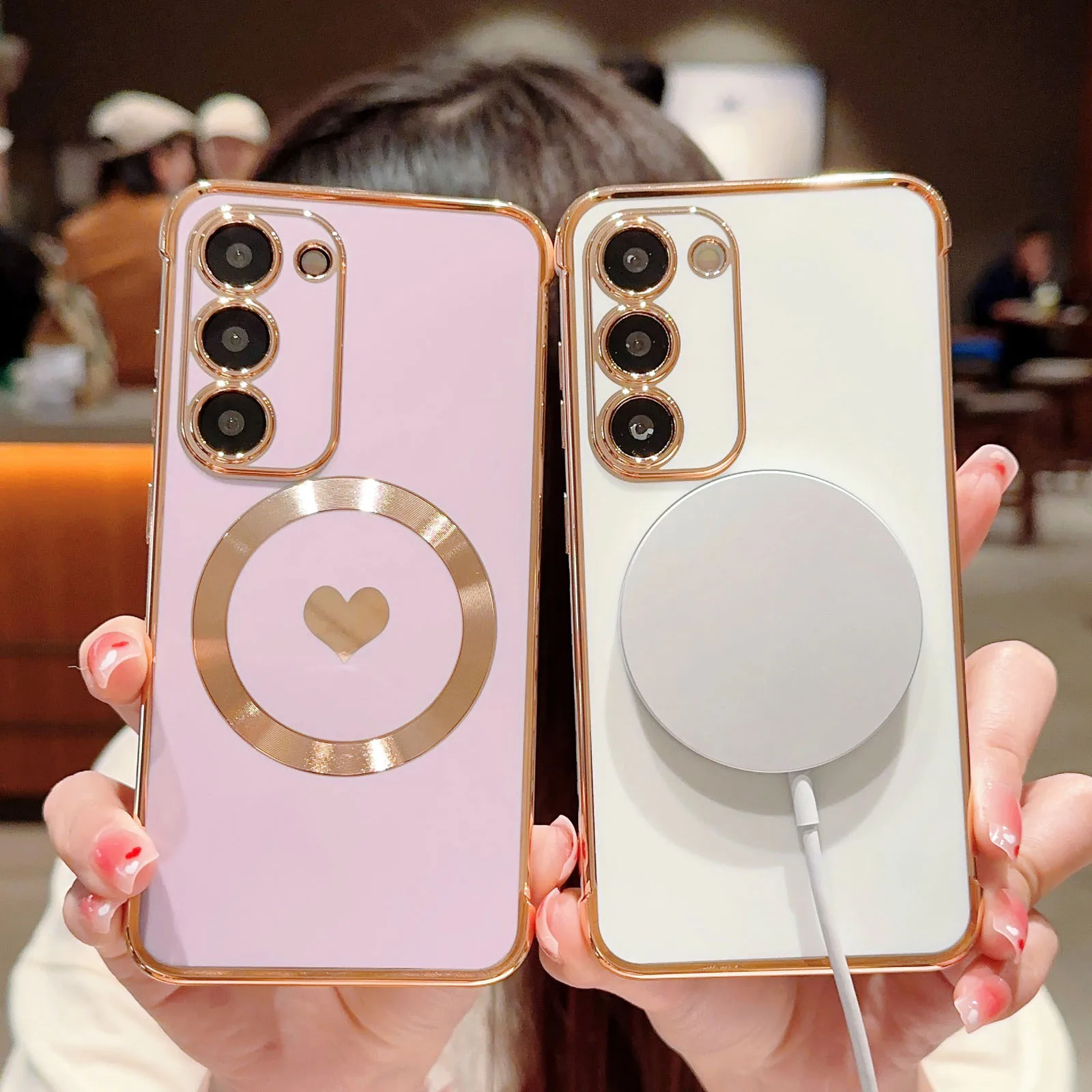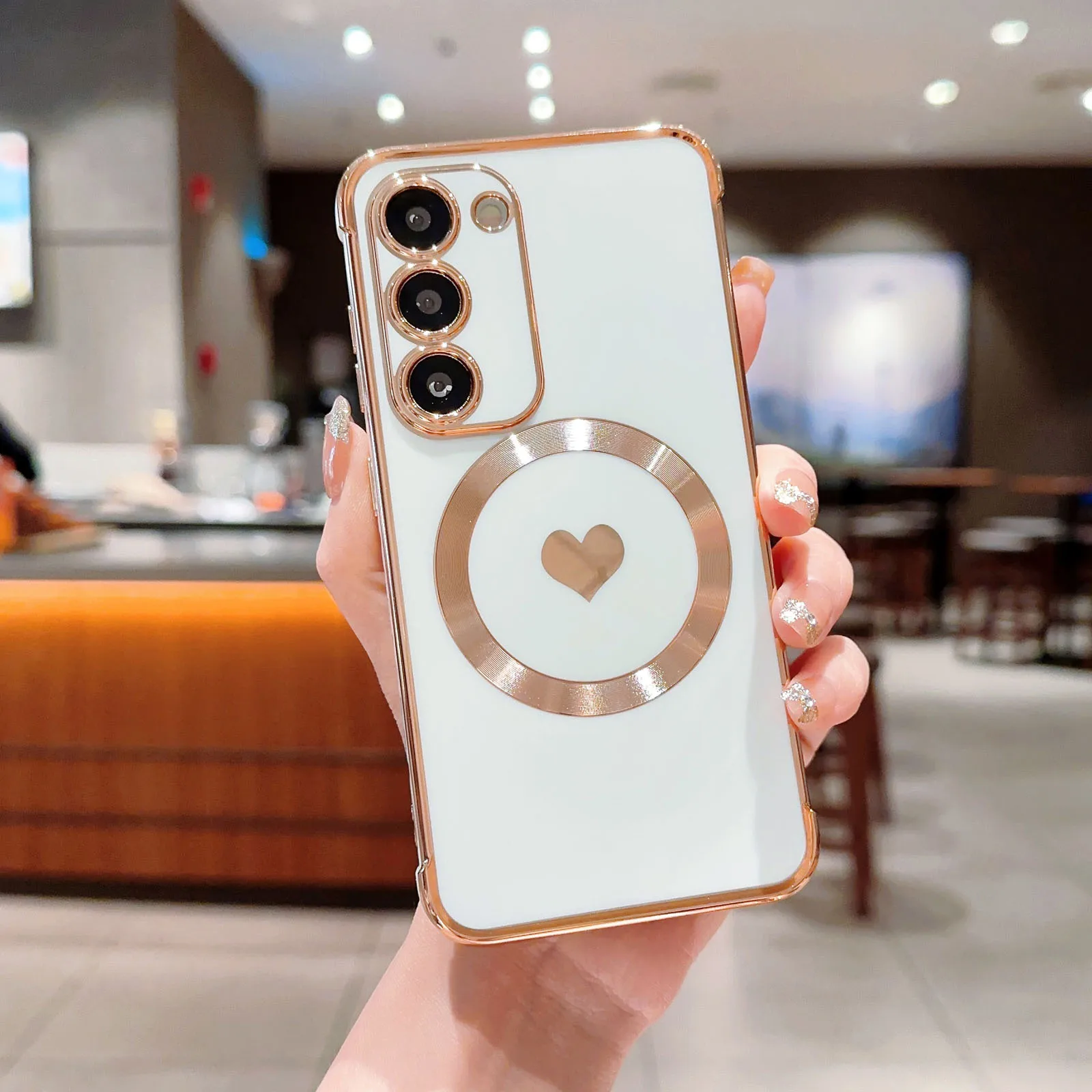 Comprar Funda magnética de corazón chapado para Samsung Galaxy S23 S22 S21 Ultra S21 S20 FE para Magsafe carga inalámbrica cubierta suave a prueba de golpes