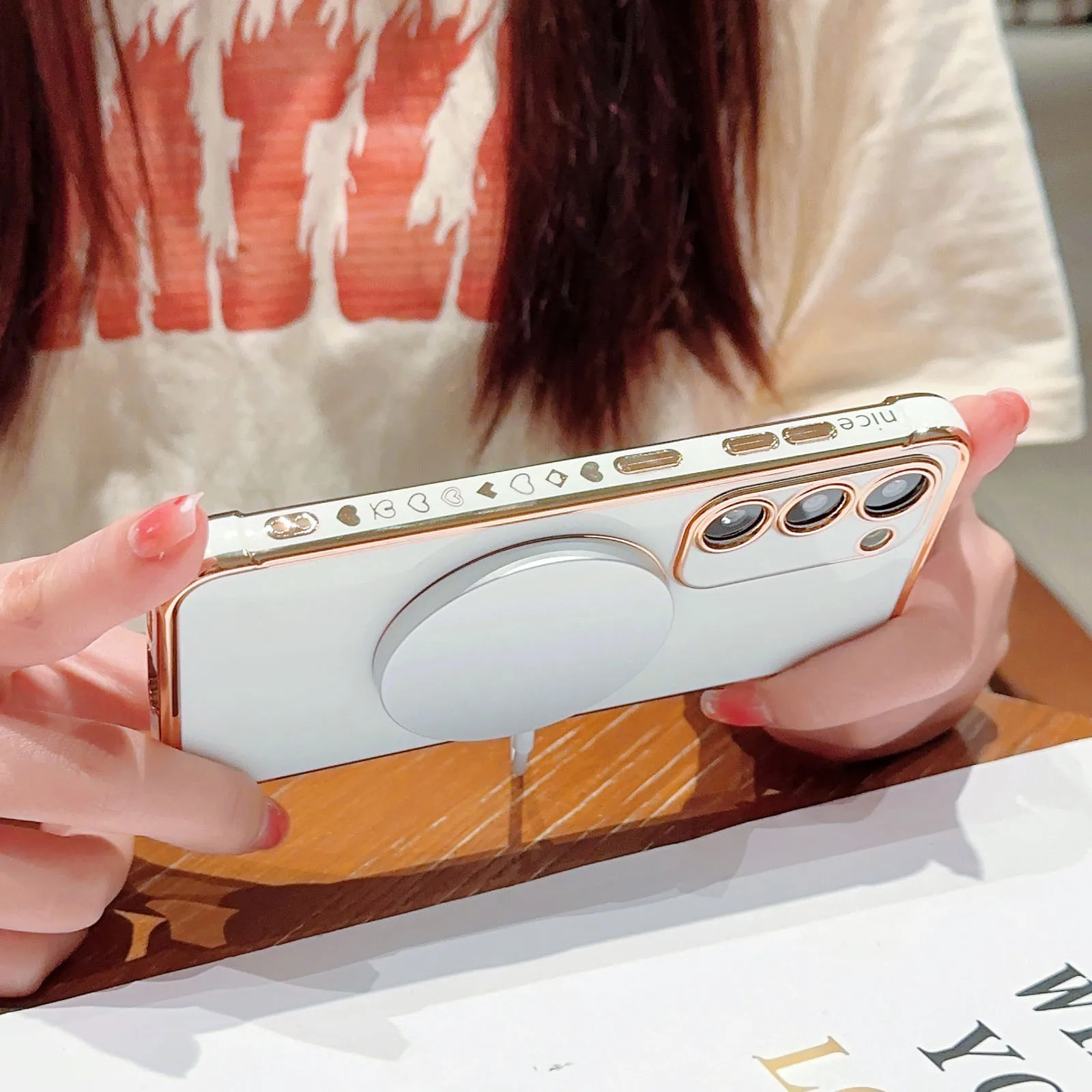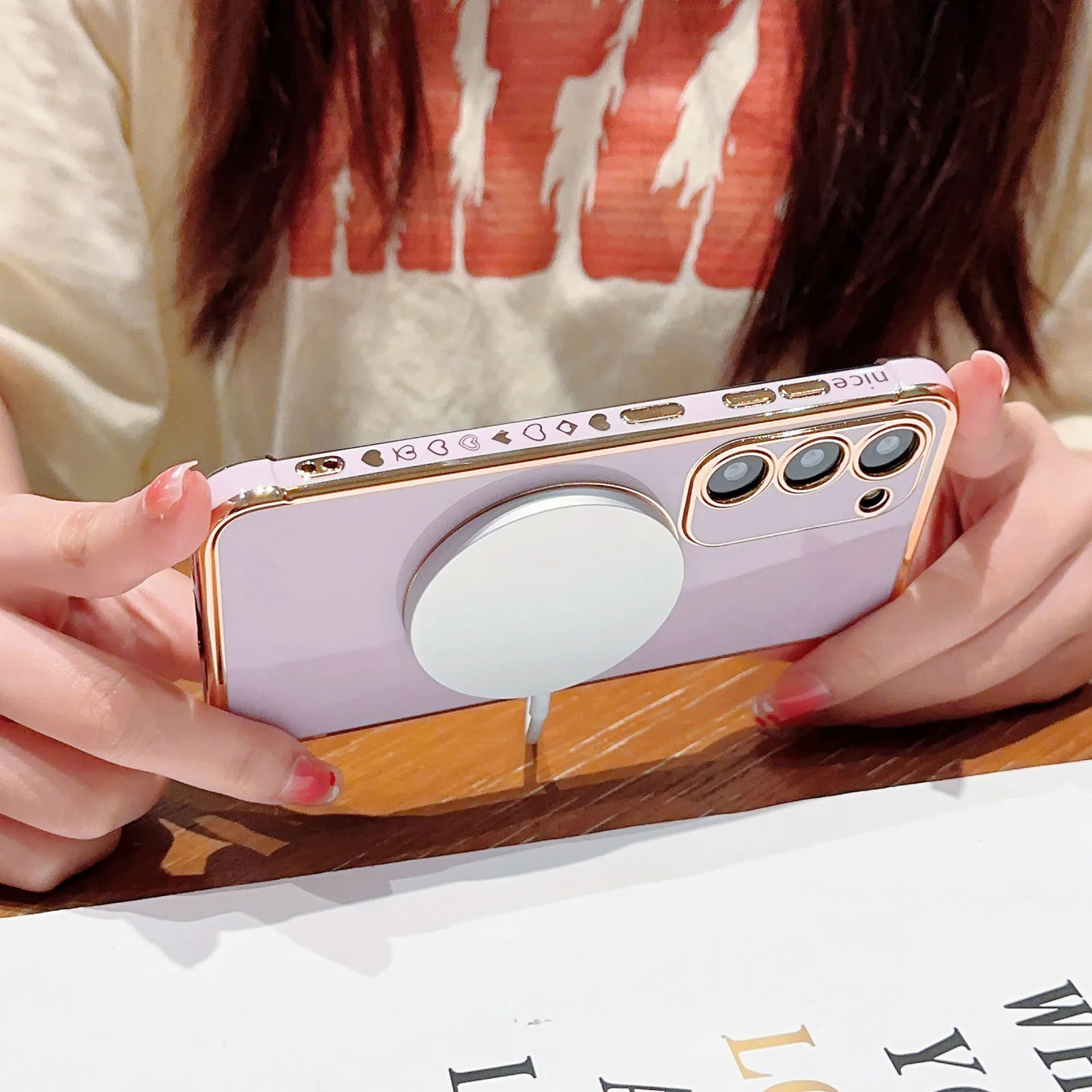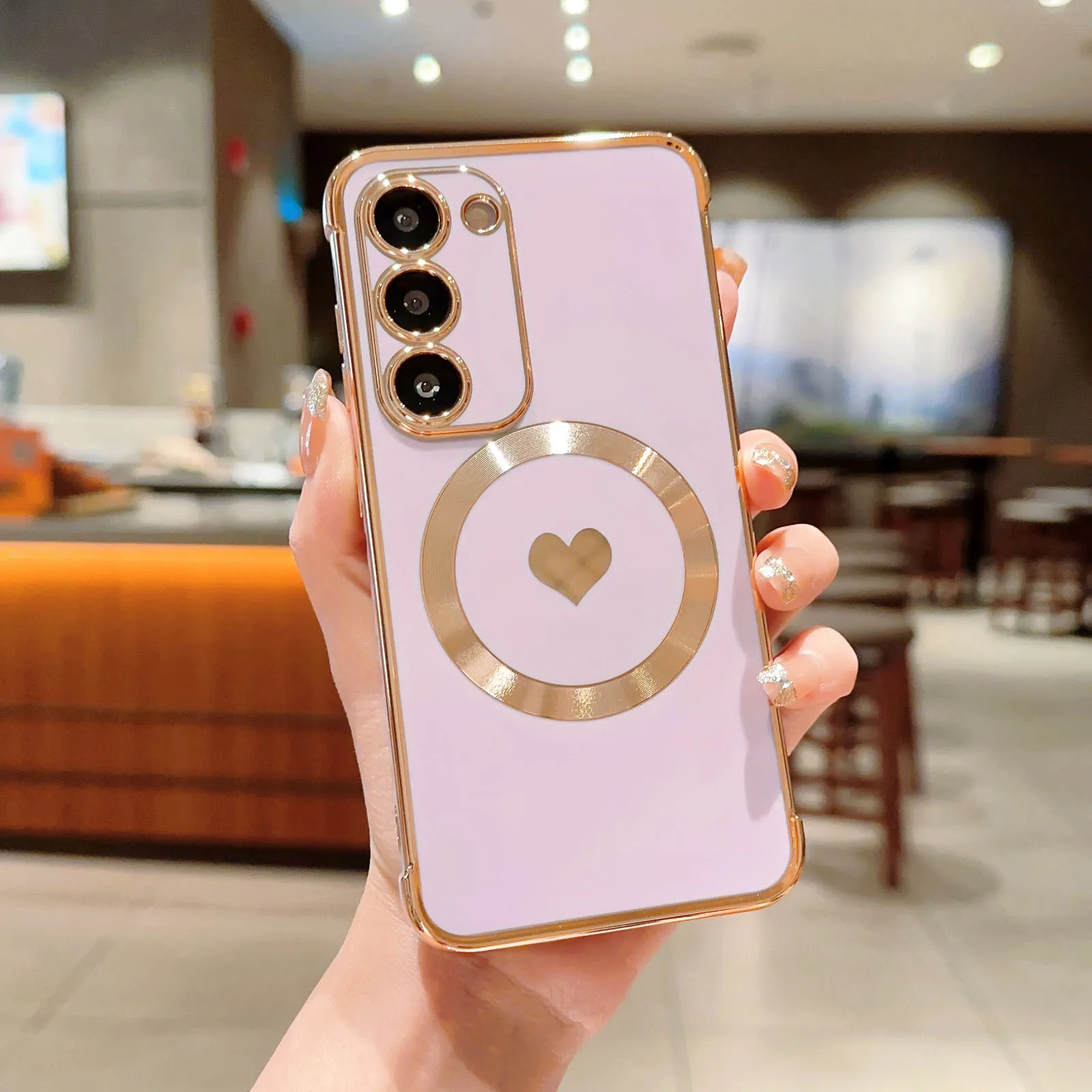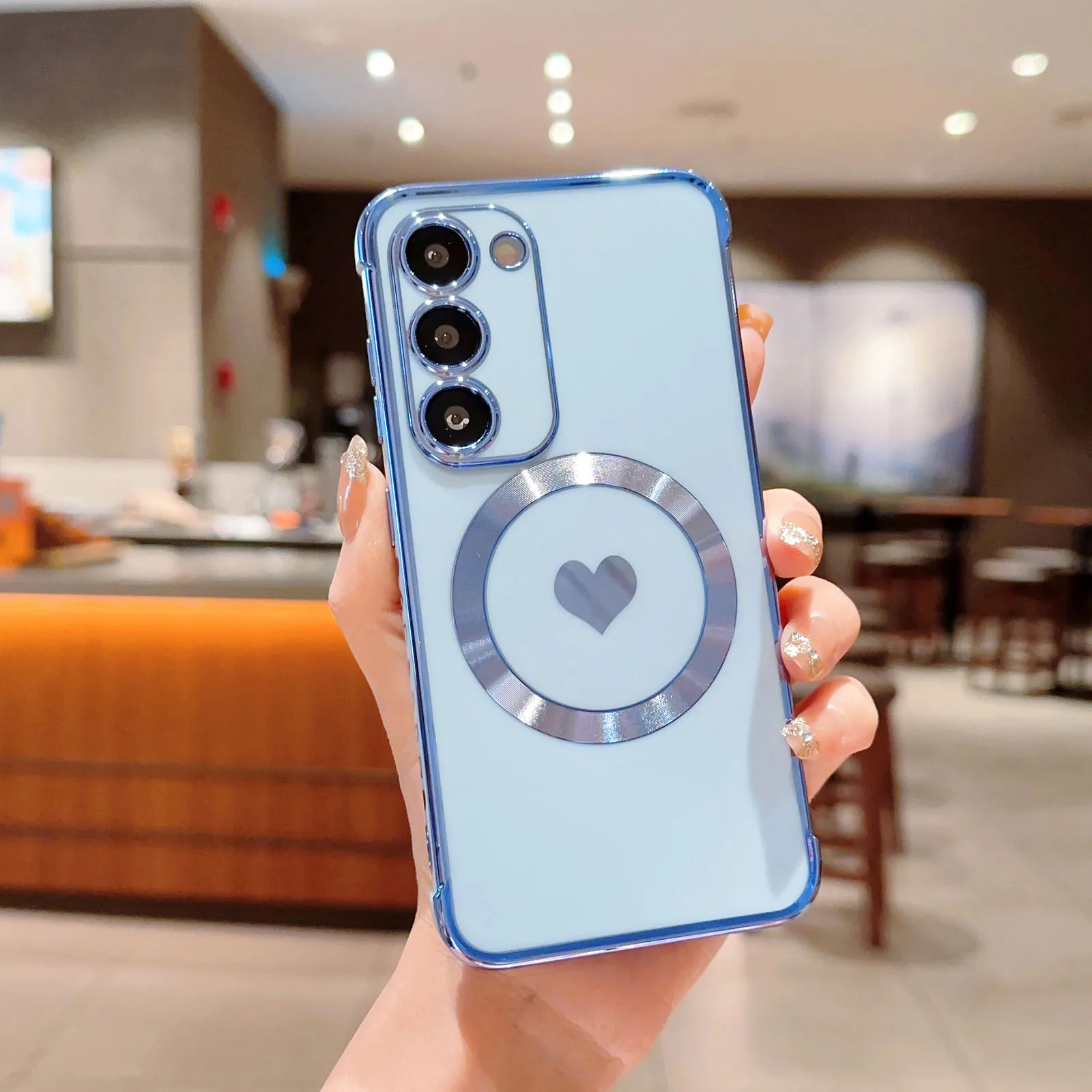 Comprar Funda magnética de corazón chapado para Samsung Galaxy S23 S22 S21 Ultra S21 S20 FE para Magsafe carga inalámbrica cubierta suave a prueba de golpes