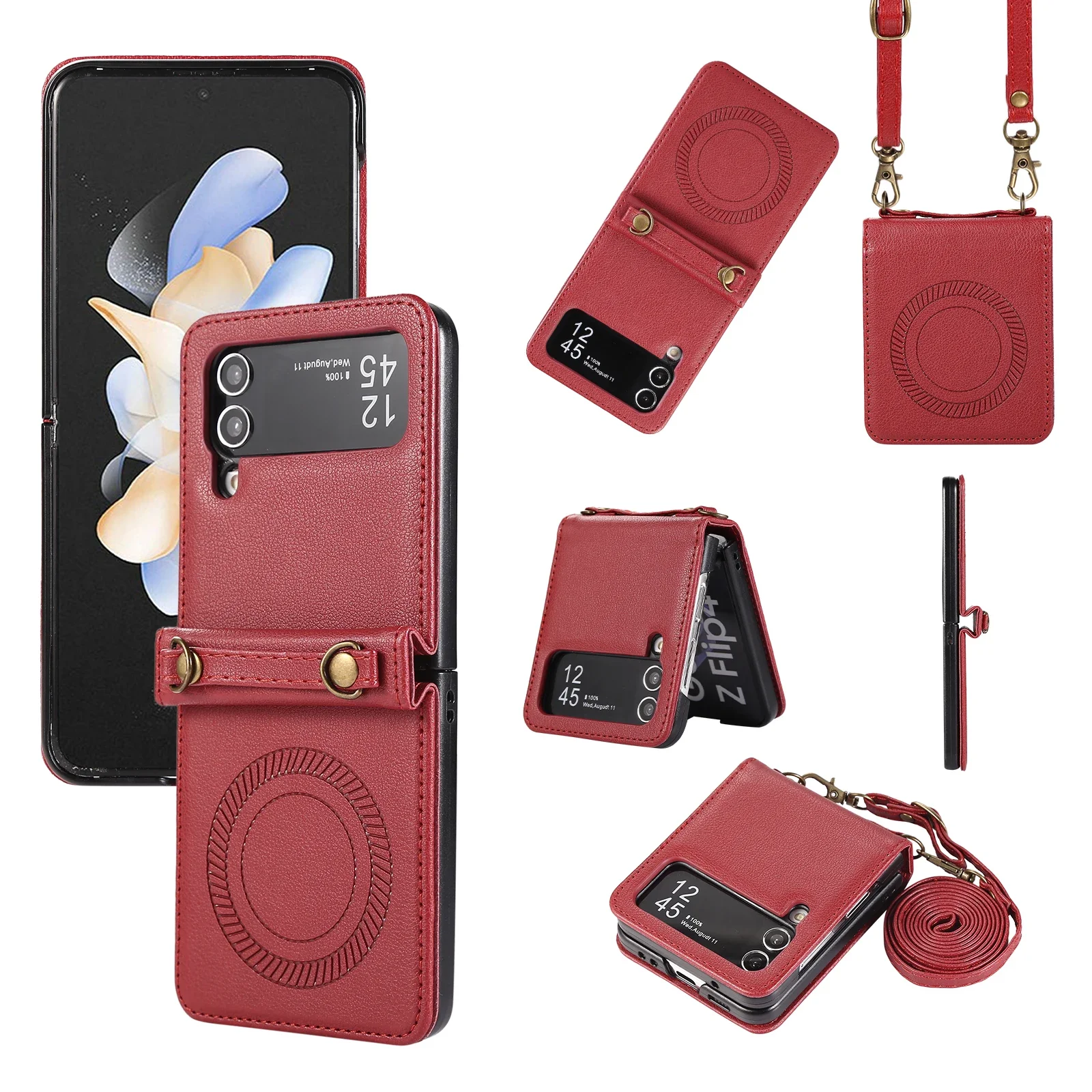 Funda de cuero magnética con carga inalámbrica cruzada para Samsung Galaxy Z Flip 5 4 3 Flip5 Flip4 Cordón de cuerda larga para funda Magsafe