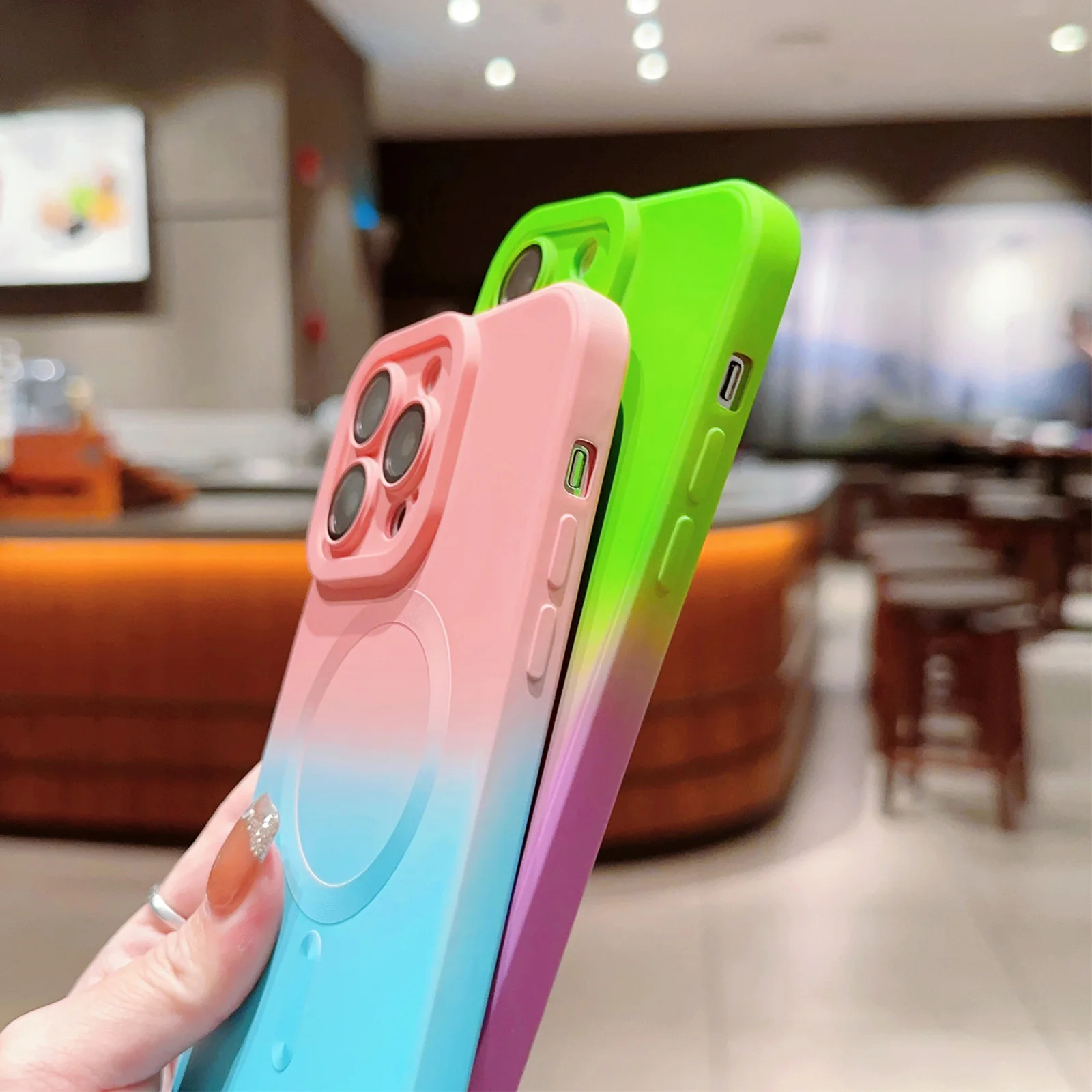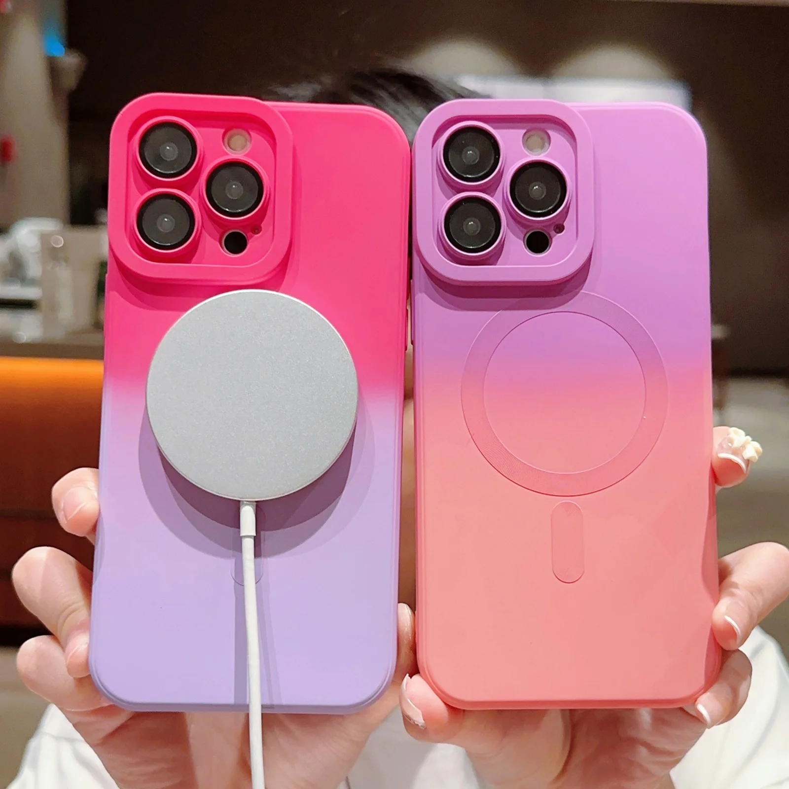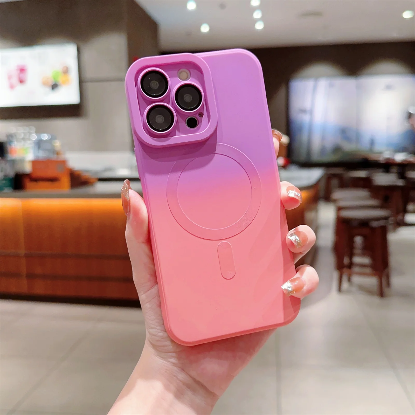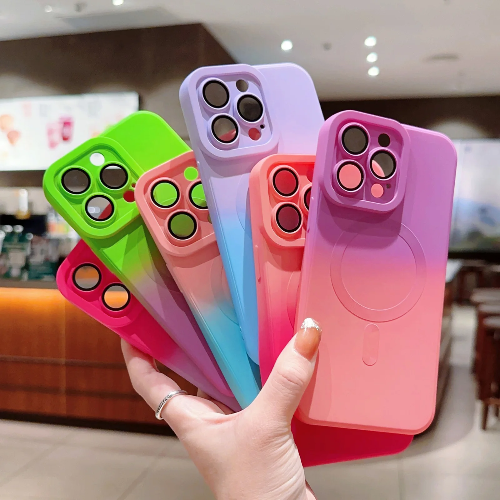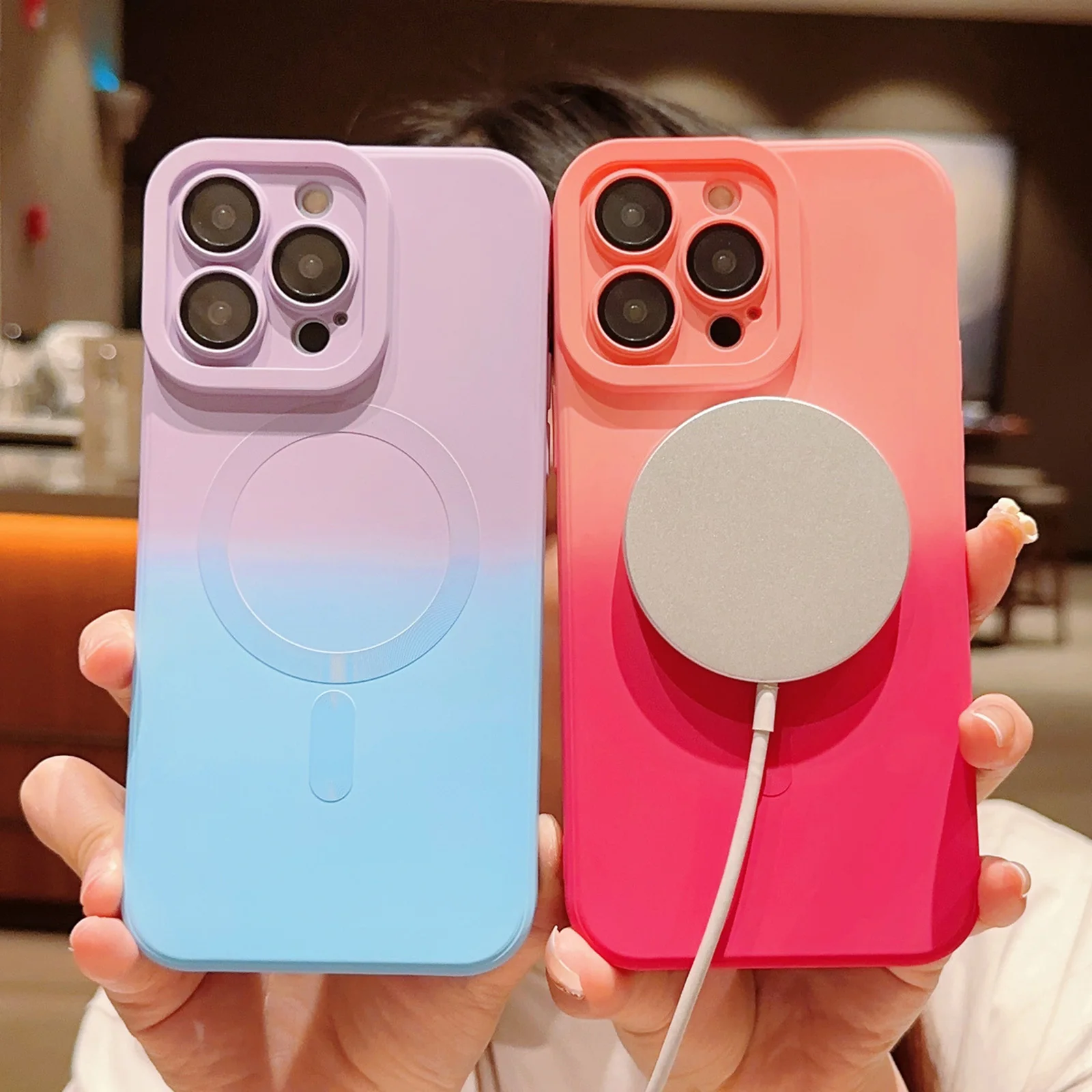 Comprar Funda magnética Magsafe para iPhone 15 Pro, 11, 12, 13, 14 Pro Max, 15 Plus, protector de cámara de Color degradado, silicona suave