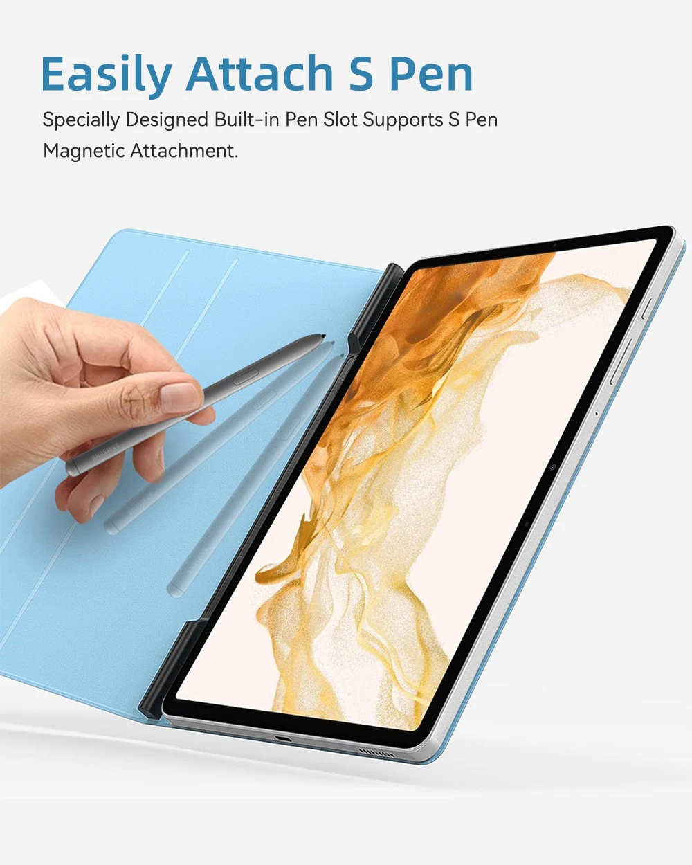 Revisión del caso para Samsung Tab S7 La capa es funcional y cumple con los básicos, pero tiene algunas limitaciones importantes. La tableta se sujeta por un imán que, aunque se mantiene en su lugar la mayor parte del tiempo, puede soltarse fácilmente en ciertos momentos, lo que compromete la seguridad del dispositivo. El bolígrafo tampoco se mantiene firmemente adherido, corriendo el riesgo de caerse y perderse fácilmente. En general, es una funda de tamaño mediano que satisface las necesidades de uso diario, pero esperaba más por el rango de precios.