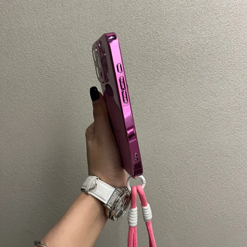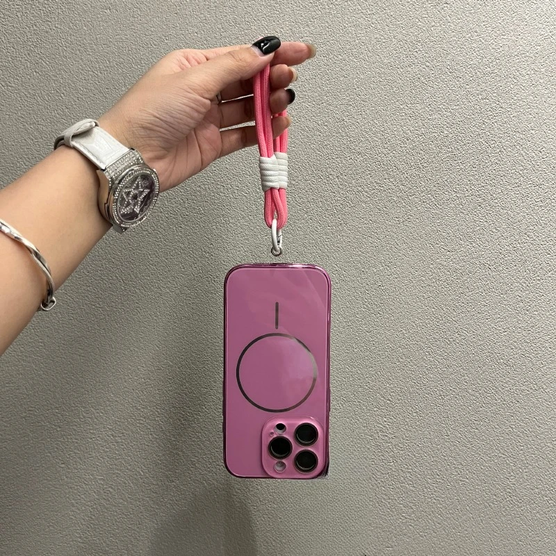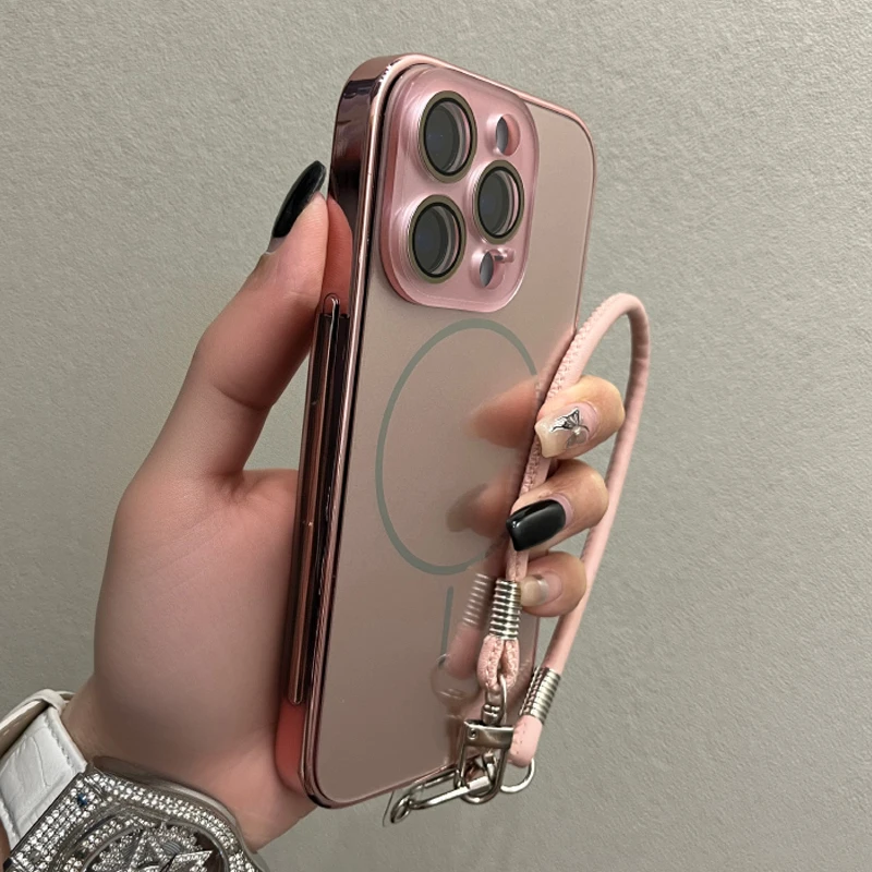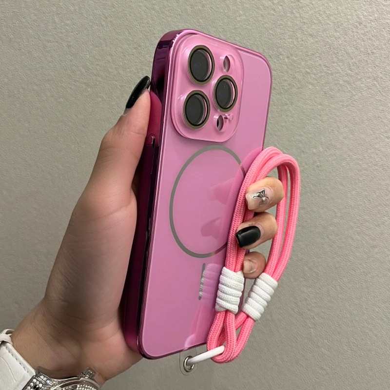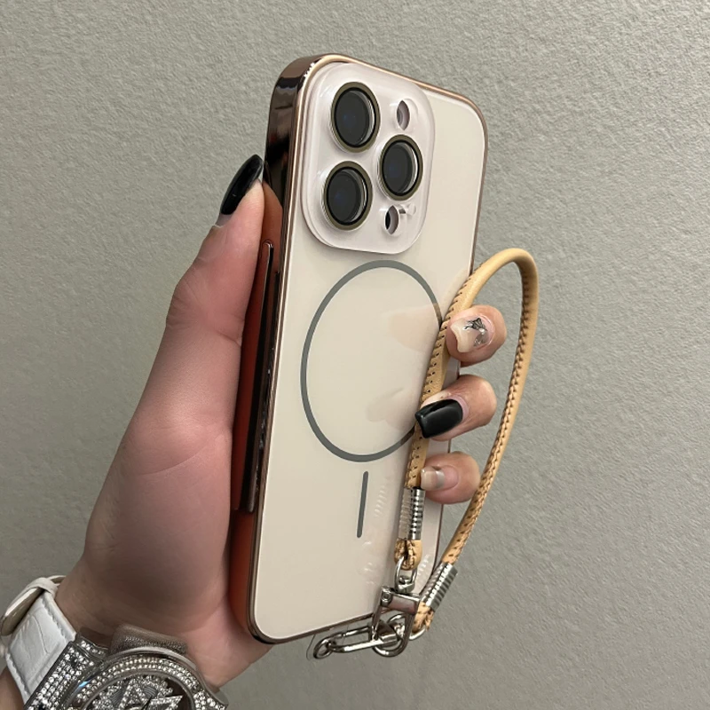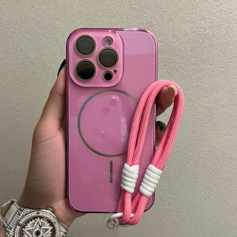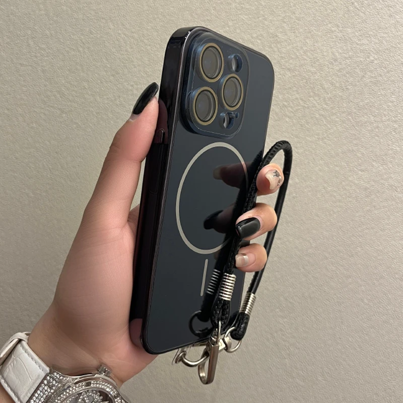 Comprar Funda Magsafe de cristal con correa para la muñeca para iPhone 16 15 14 13 12 11 Pro Max 16Pro, cubierta de carga magnética a prueba de golpes con revestimiento de lujo