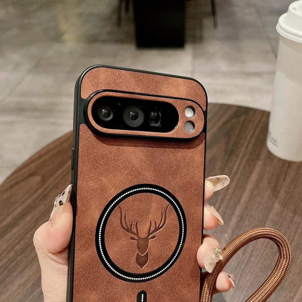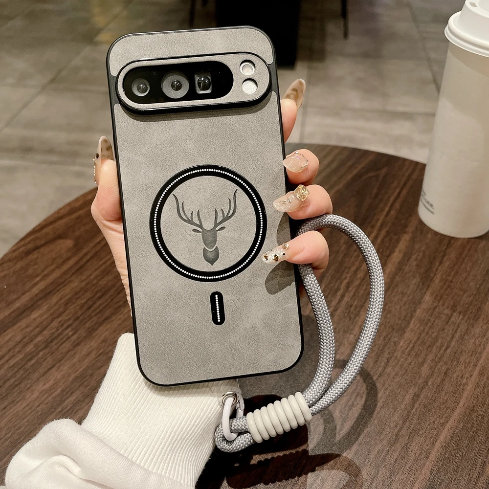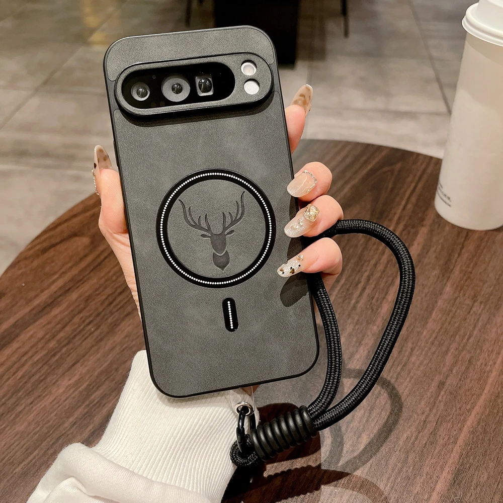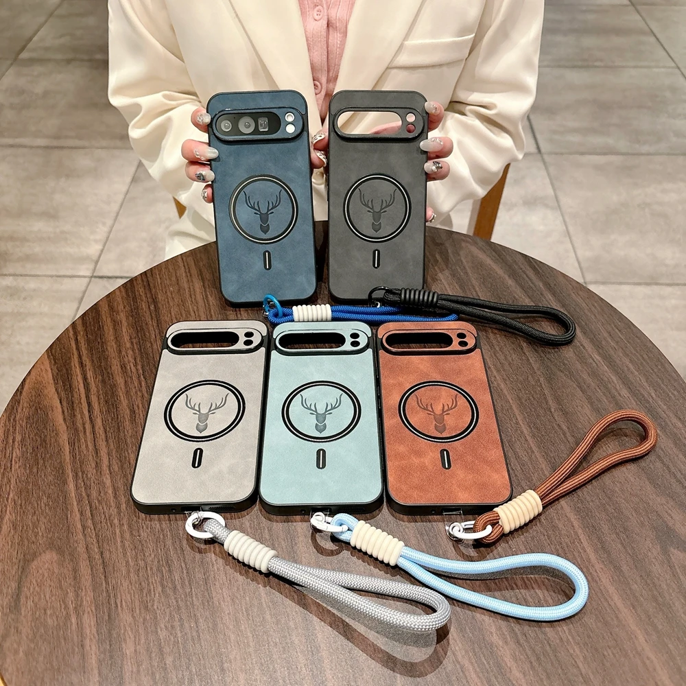 Comprar Funda Magsafe de cuero con ciervo de dibujos animados para Google Pixel 9A 9 Pro XL 8 7 Pro, funda de carga inalámbrica con cordón para pulsera para Pixel 8A 7A