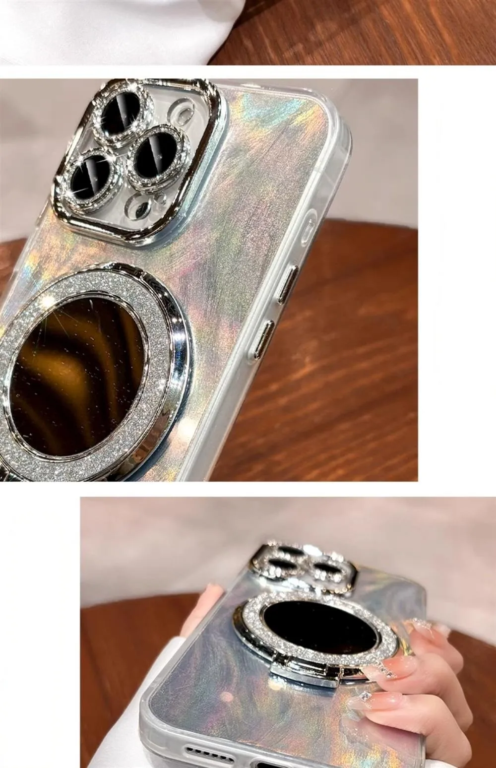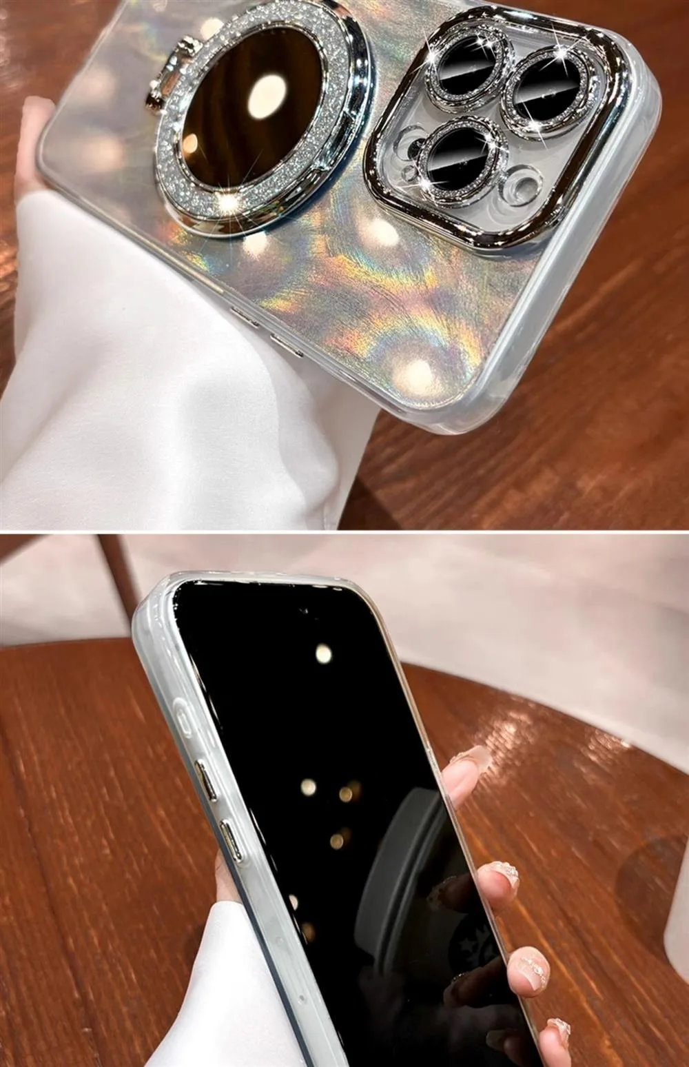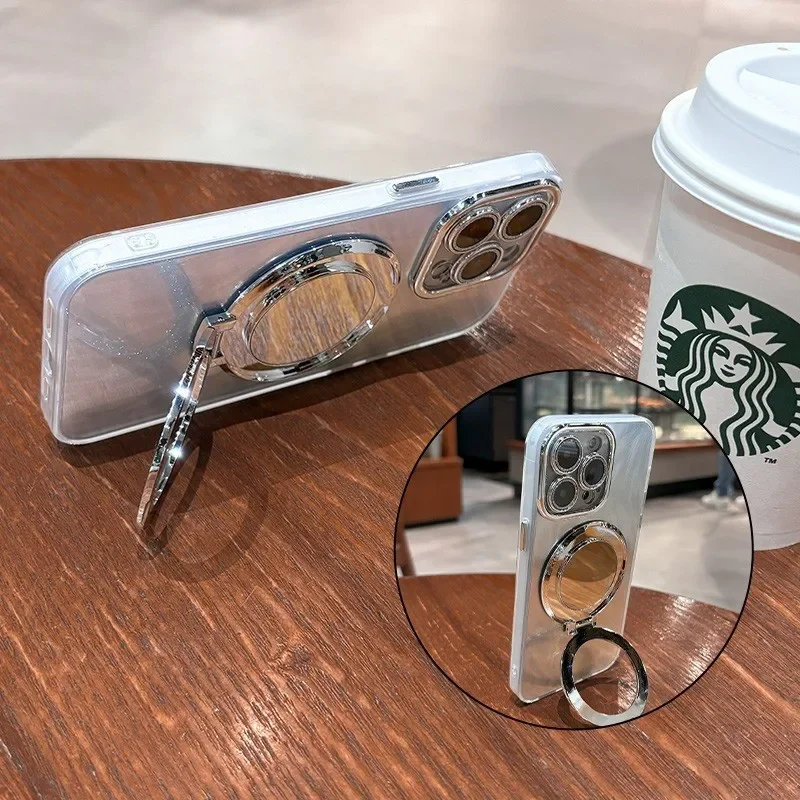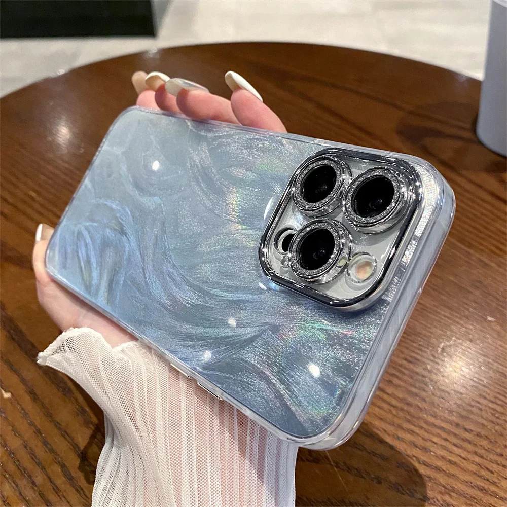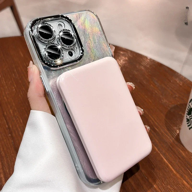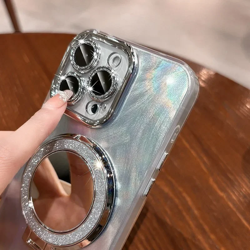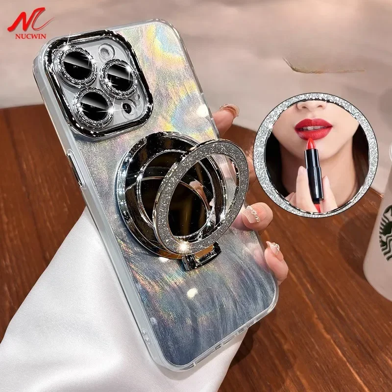 Comprar Funda Magsafe con espejo láser de plumas de lujo para iPhone 11 12 13 14 15 16 Pro Max 16 Plus, Protector de cámara con purpurina, cubierta magnética para PC