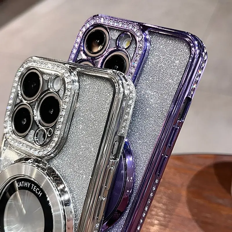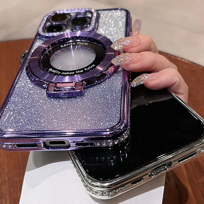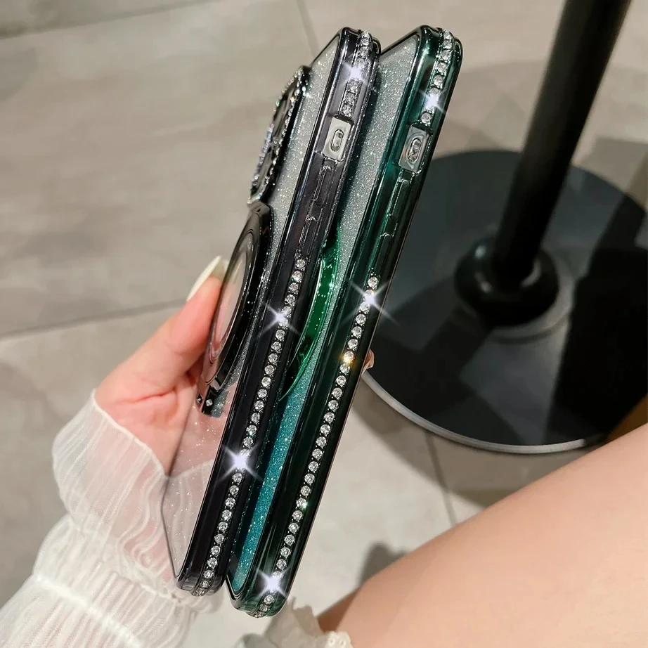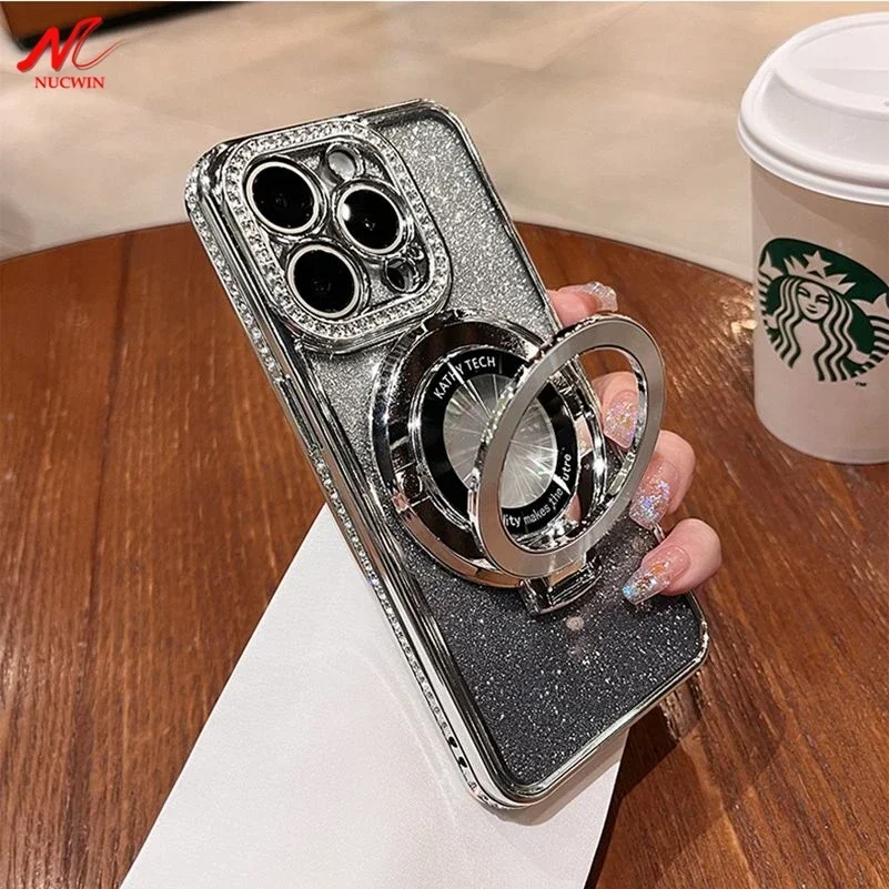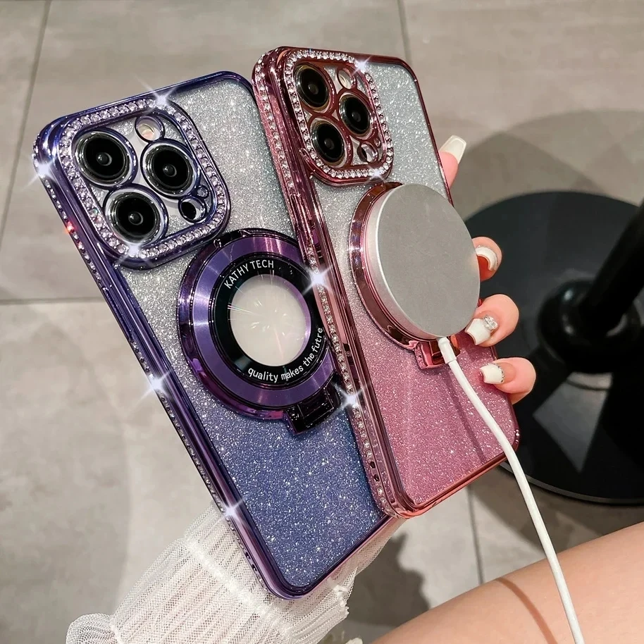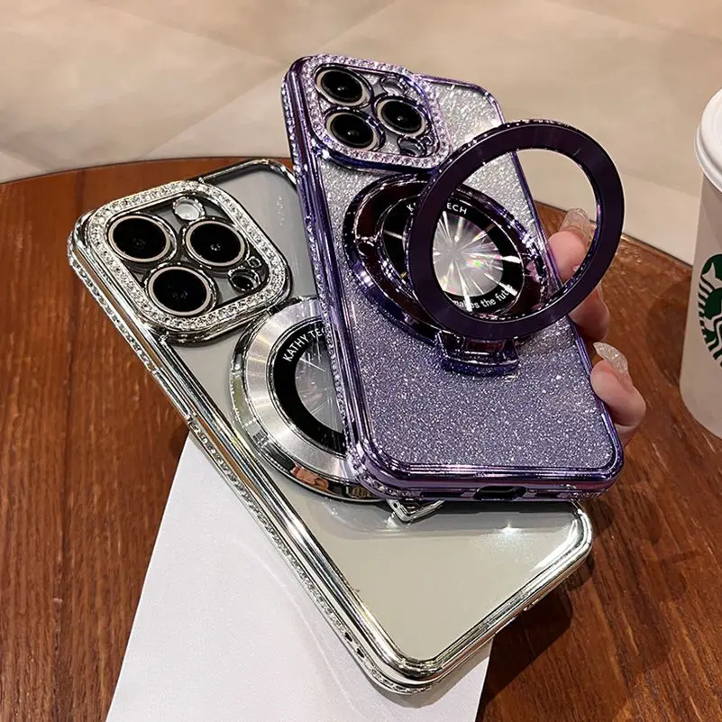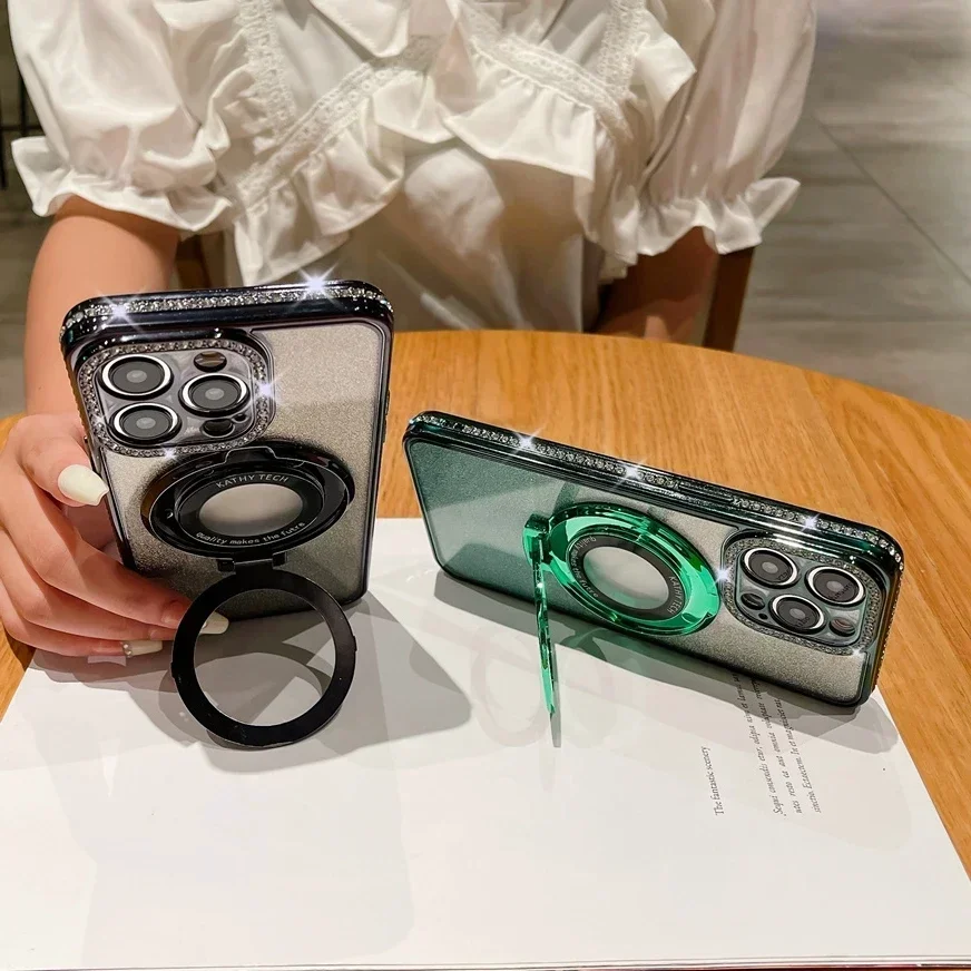 Funda Magsafe de lujo con diamantes brillantes para iPhone, carcasa de silicona suave con soporte magnético para iPhone 16, 15, 14, 13, 12, 11 Pro Max Plus