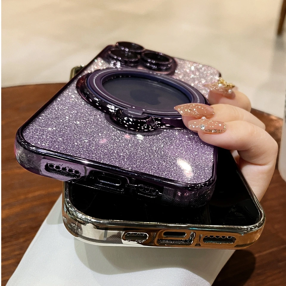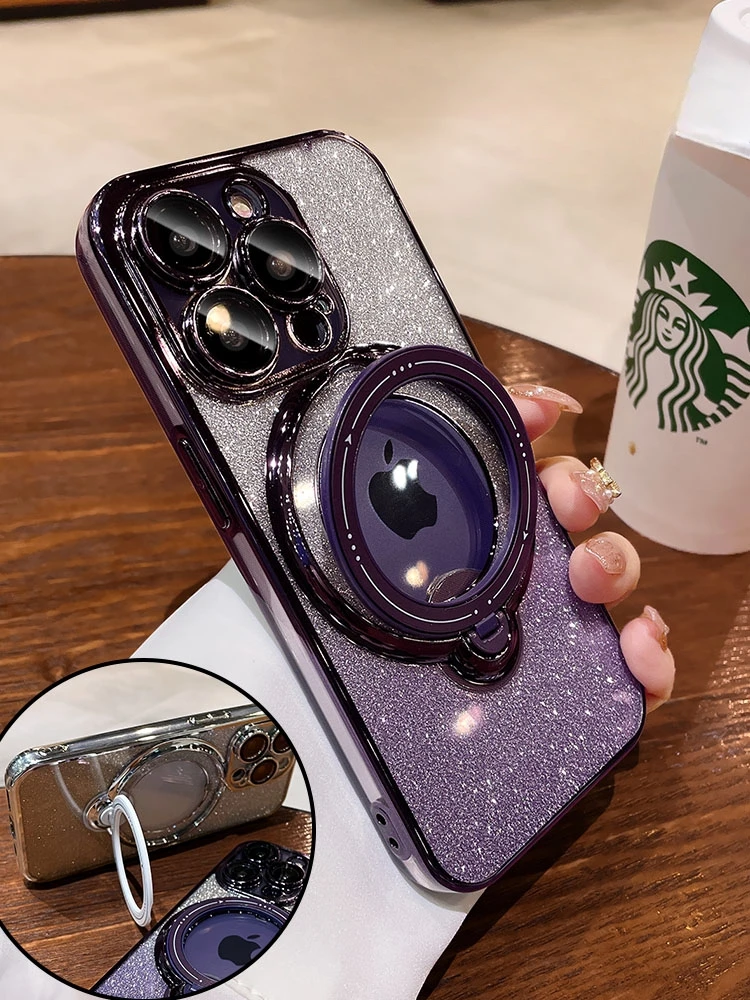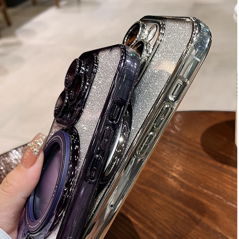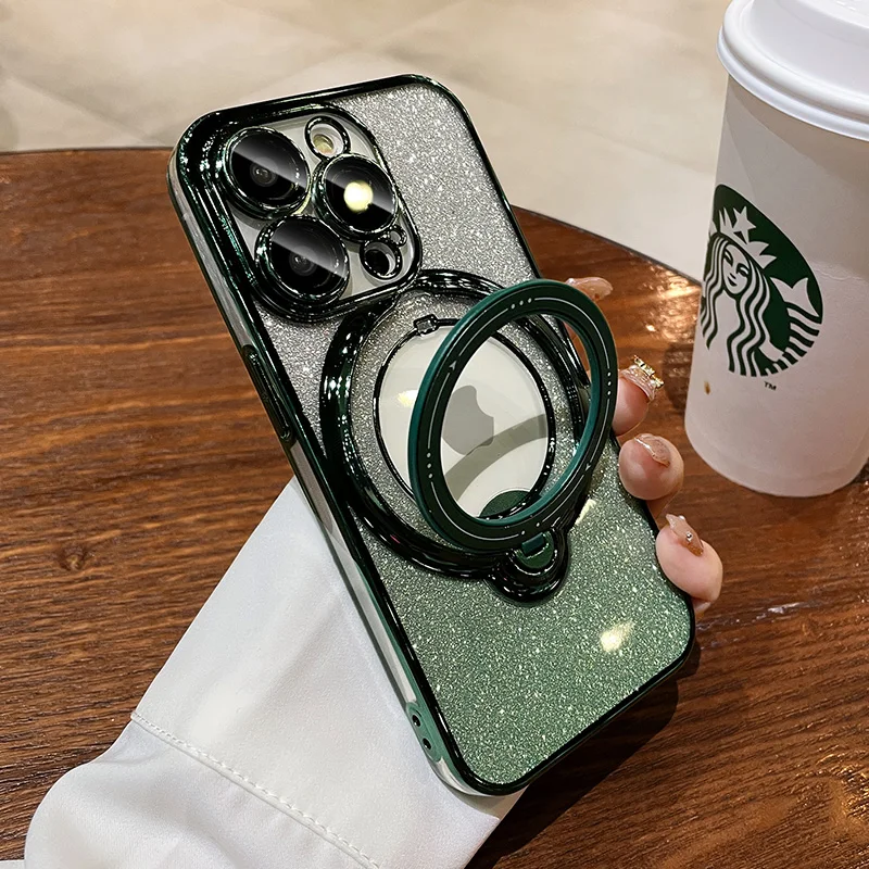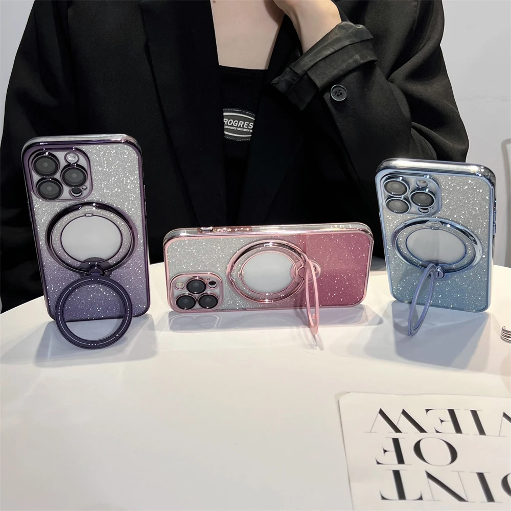 Comprar Funda Magsafe con soporte Chapado en purpurina de lujo para iPhone 16, 15, 14, 13, 12, 11 Pro Max, 14, 15, 16 Plus, imán brillante para niña, nueva cubierta