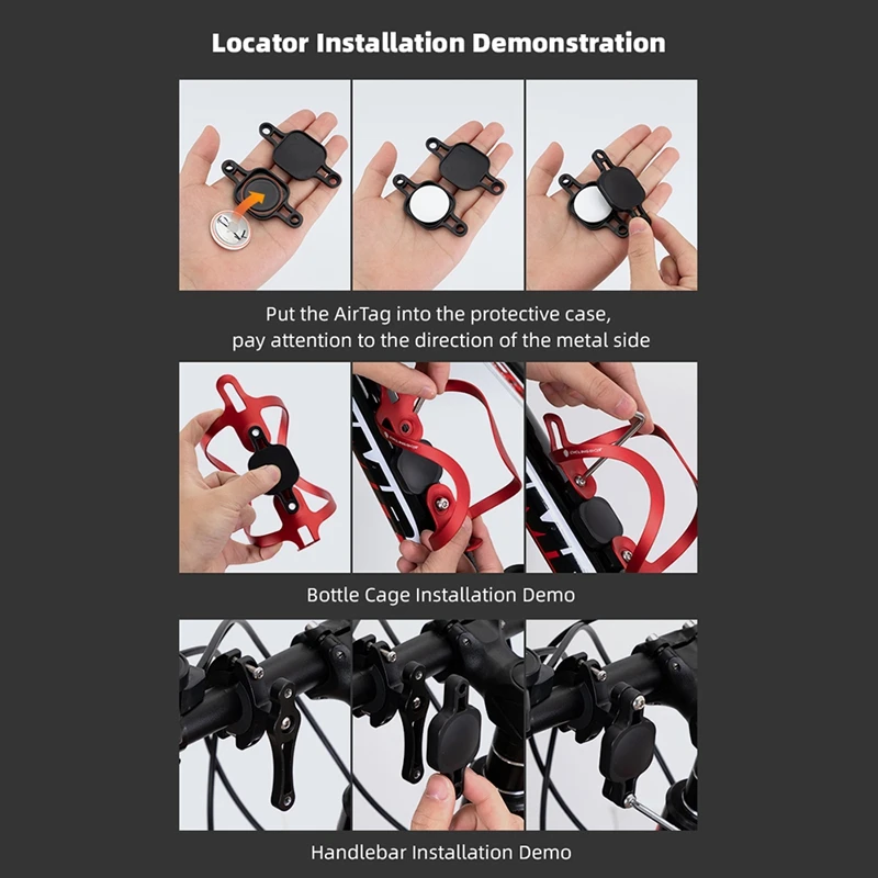 Para el airtag el montaje se fija debajo de la jaula de la botella de la bicicleta, o se fija en el manillar de bicicletas eléctricas y motocicletas, y es de tamaño pequeño, para que otros no lo encuentren fácilmente.