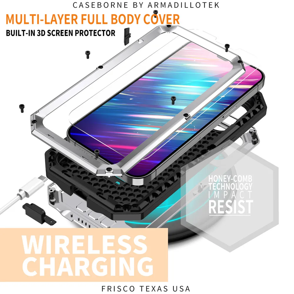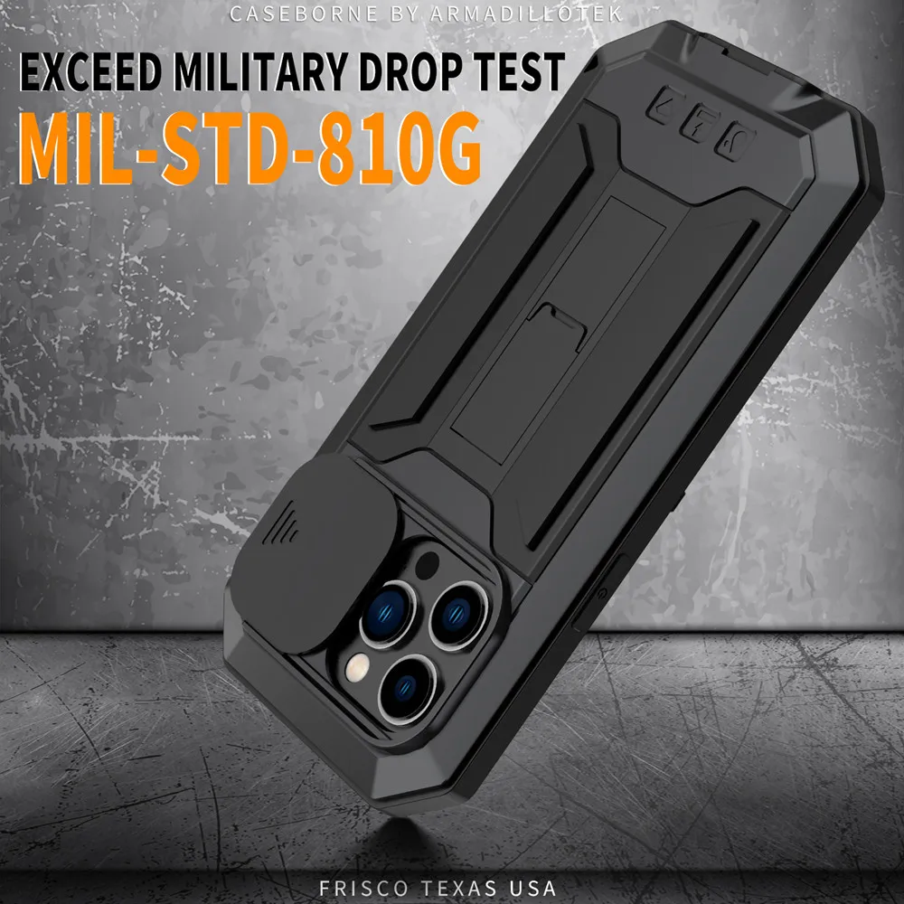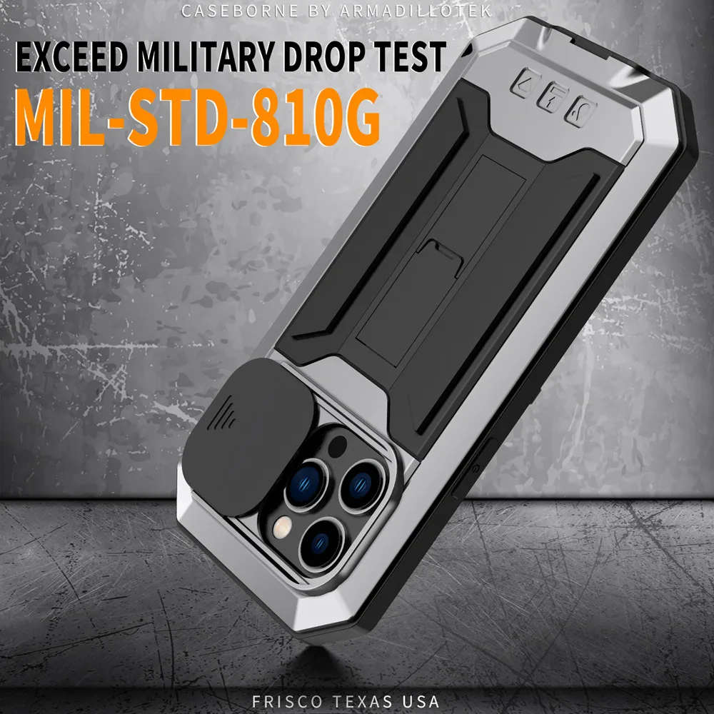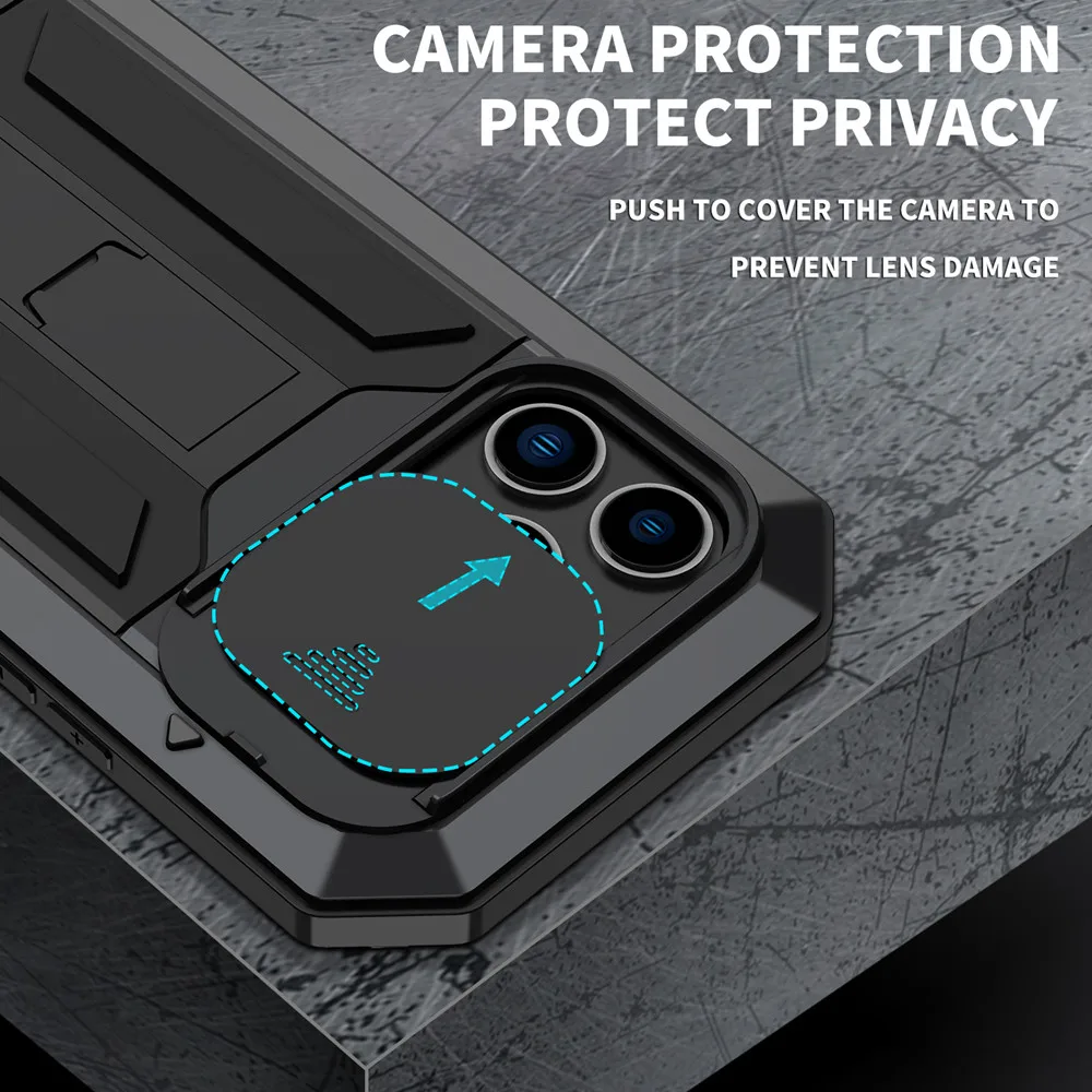 Comprar Funda de Metal resistente a prueba de golpes para iPhone 14, cubierta de protección completa de vidrio templado 360 para iPhone 13 15 Pro Max, protección de cámara deslizante