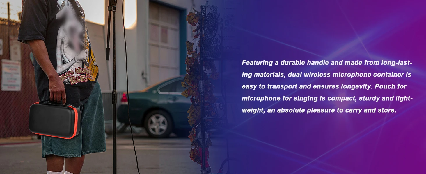 Funda de Micrófono dual de mano fácil de llevar: con un asa y hecho de materiales duraderos, el contenedor de micrófono inalámbrico dual es fácil de transportar y garantiza la longevidad. La bolsa de micrófono inalámbrico es adecuada tanto para uso profesional en eventos como para uso recreativo en el hogar, atendiendo a una amplia gama de usuarios que buscan una solución organizada y confiable.