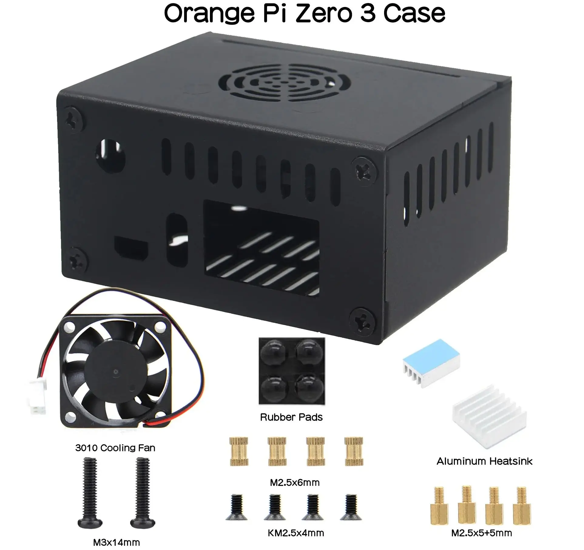 Esta es una carcasa de metal especialmente diseñada para Orange Pi Zero 3, el modelo es N502. Se reserva todas las interfaces de la placa base Orange Pi Zero 3, admite el ventilador de refrigeración 3010 5V, admite la extracción del cable GPIO, Y también reserva el orificio de la antena para facilitar la instalación de la antena.