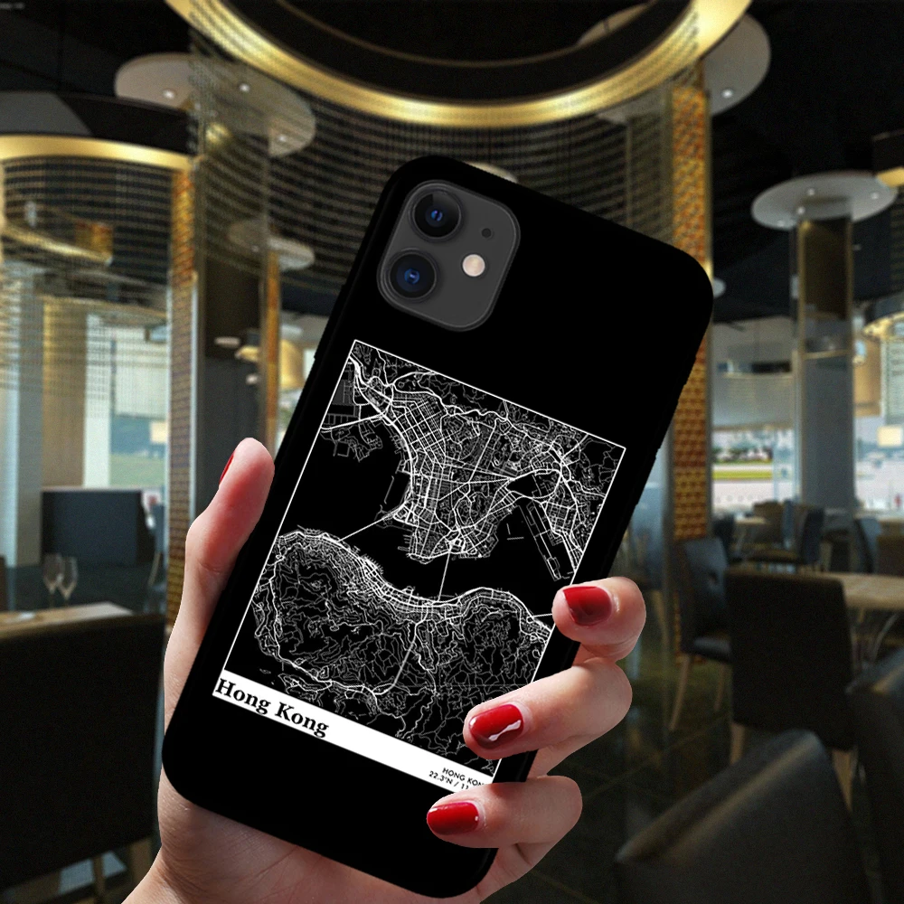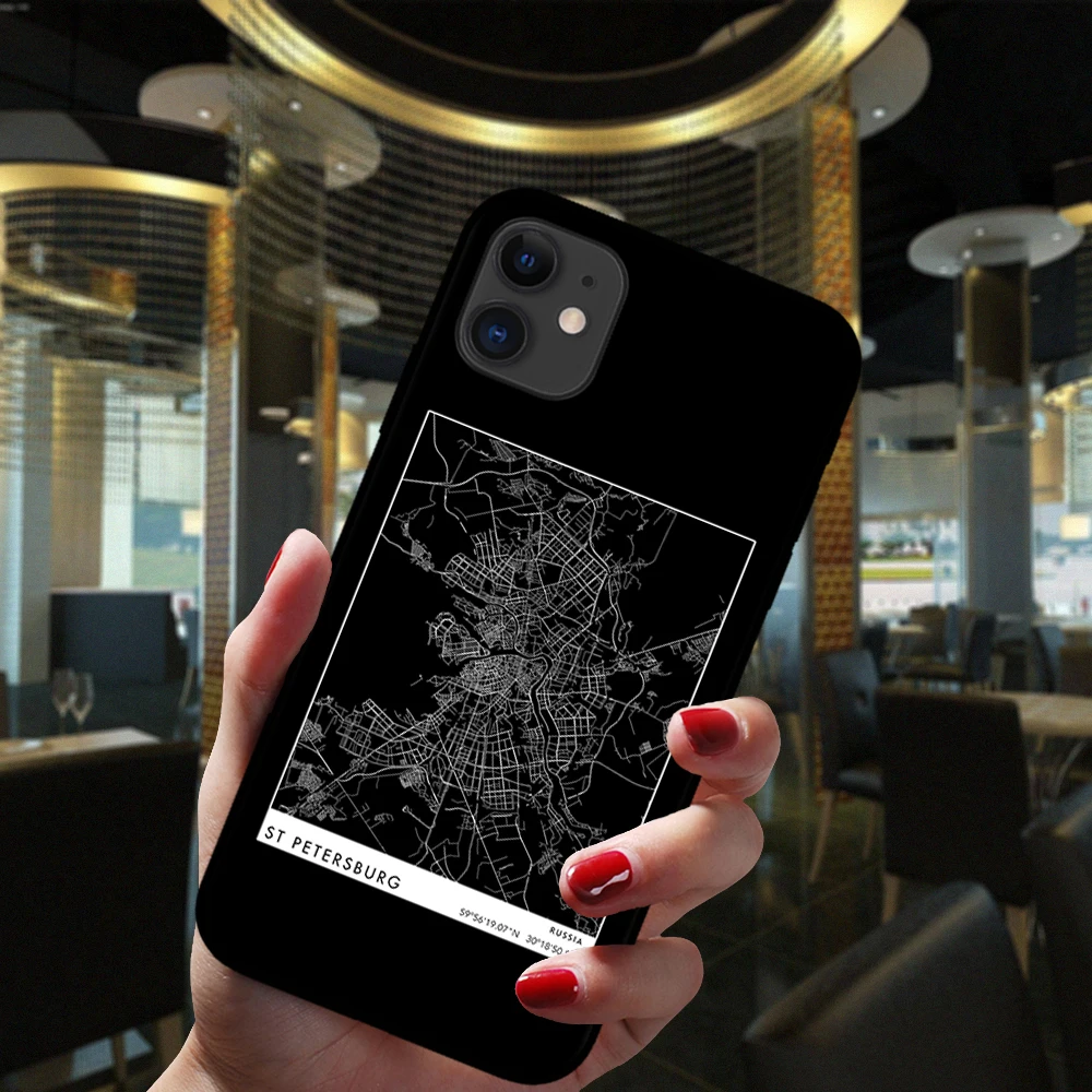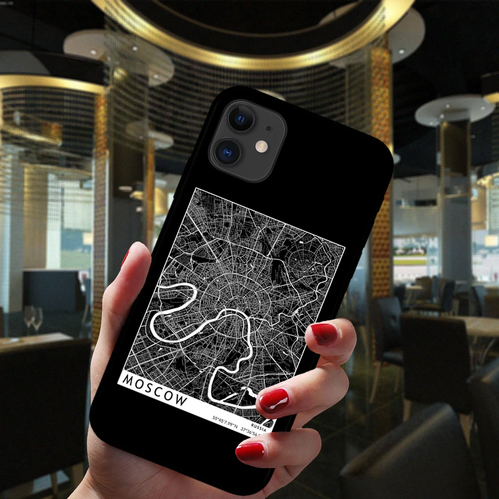 Comprar Funda negra para iPhone 13, 12, 11, 14 Pro Max, Mini, XS, XR, 14Plus, Moscú, viaje, país, ciudad, boceto, mapa, silicona suave, cubierta mate