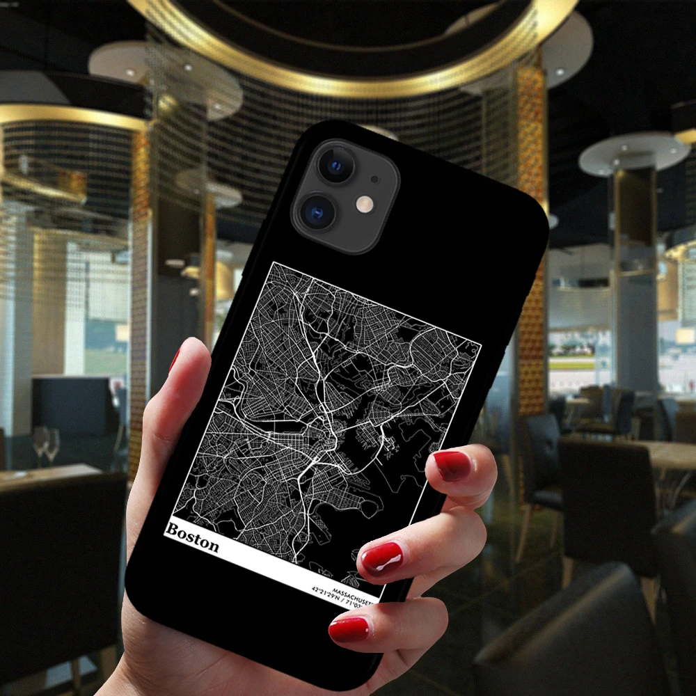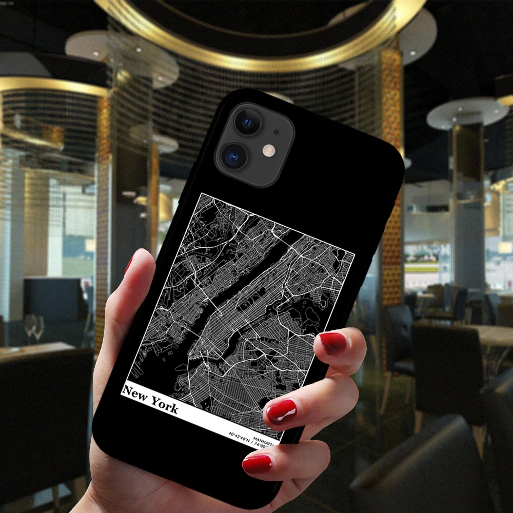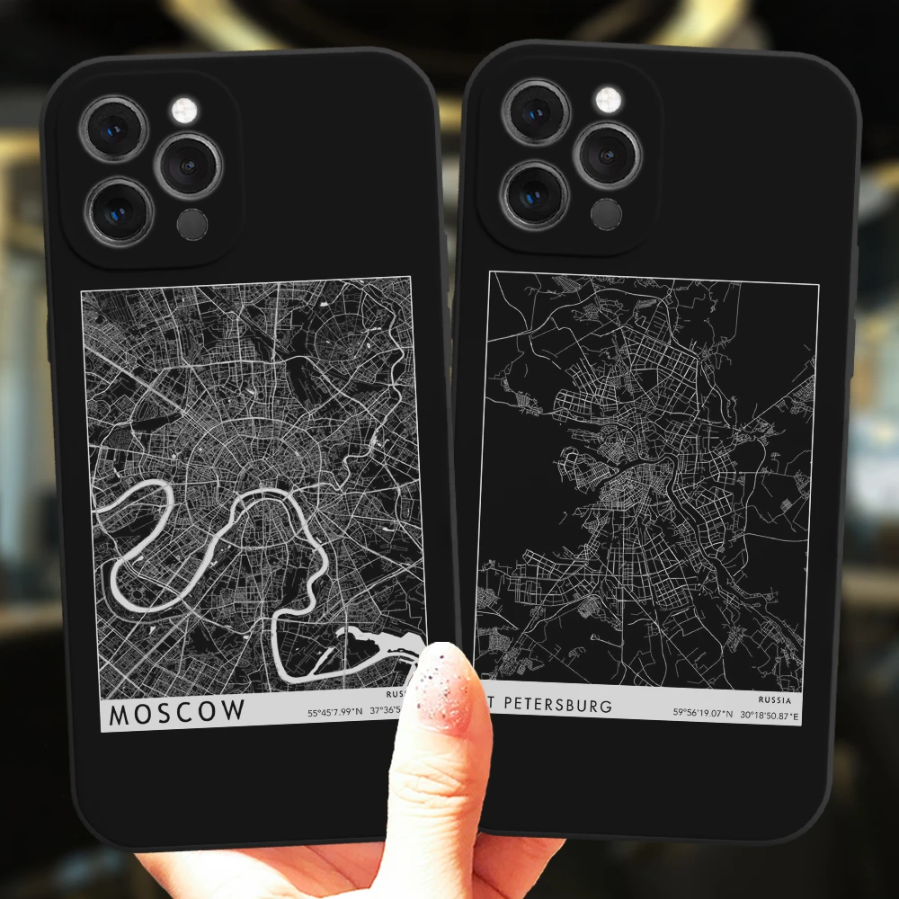 Comprar Funda negra para iPhone 13, 12, 11, 14 Pro Max, Mini, 15 Plus, mapa de bocetos de la ciudad del país de viaje Popular de Moscú, cubierta mate de silicona