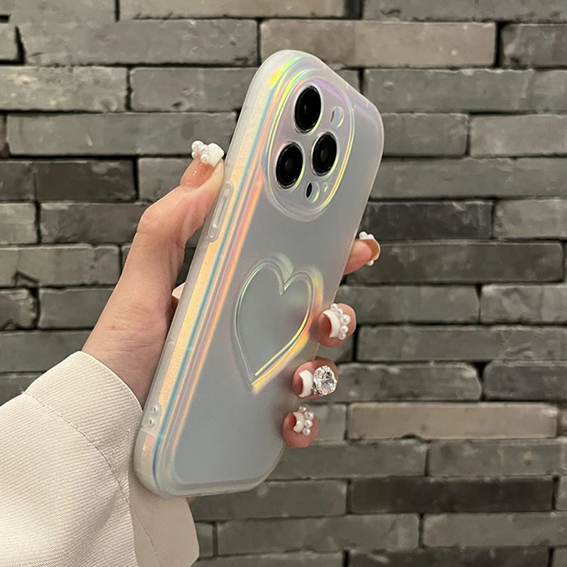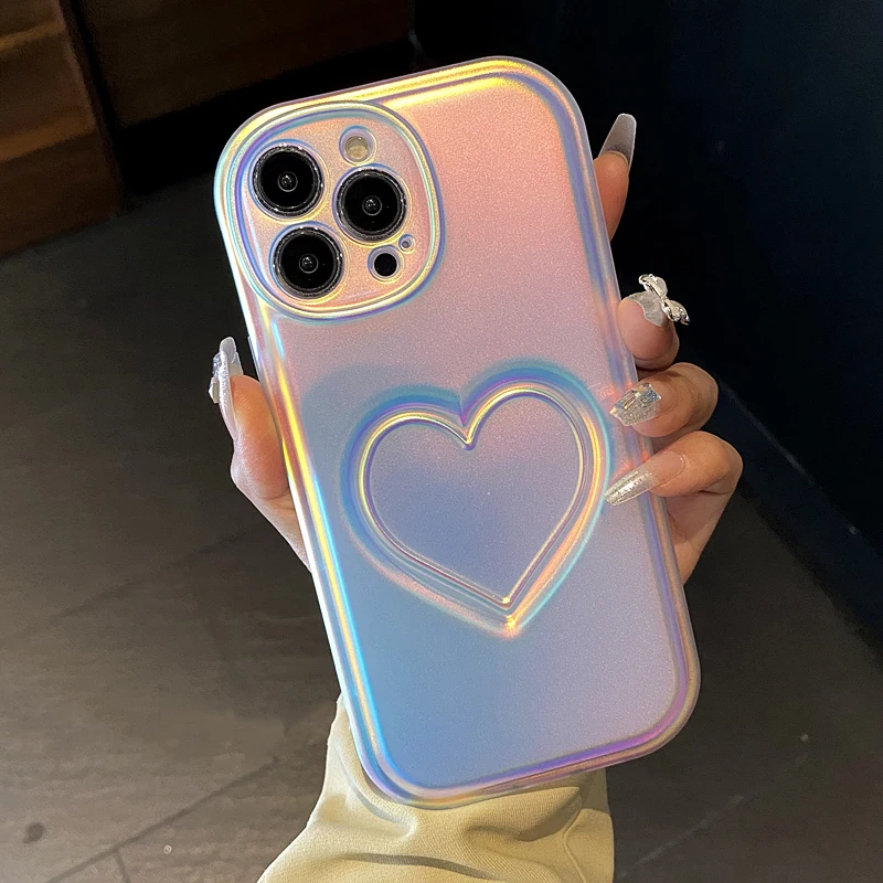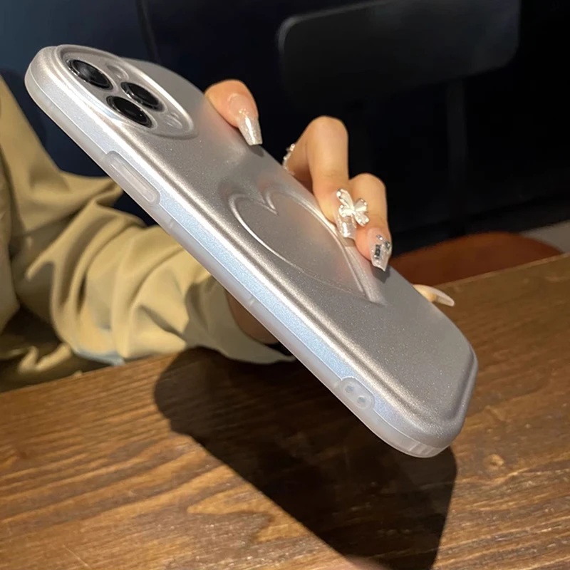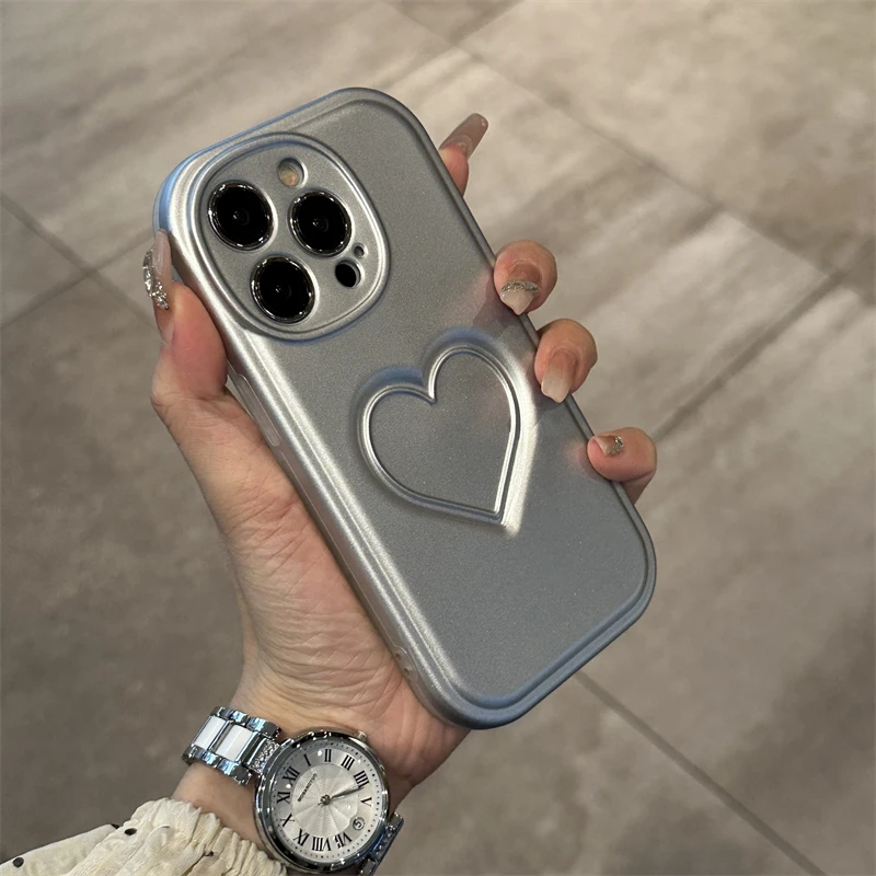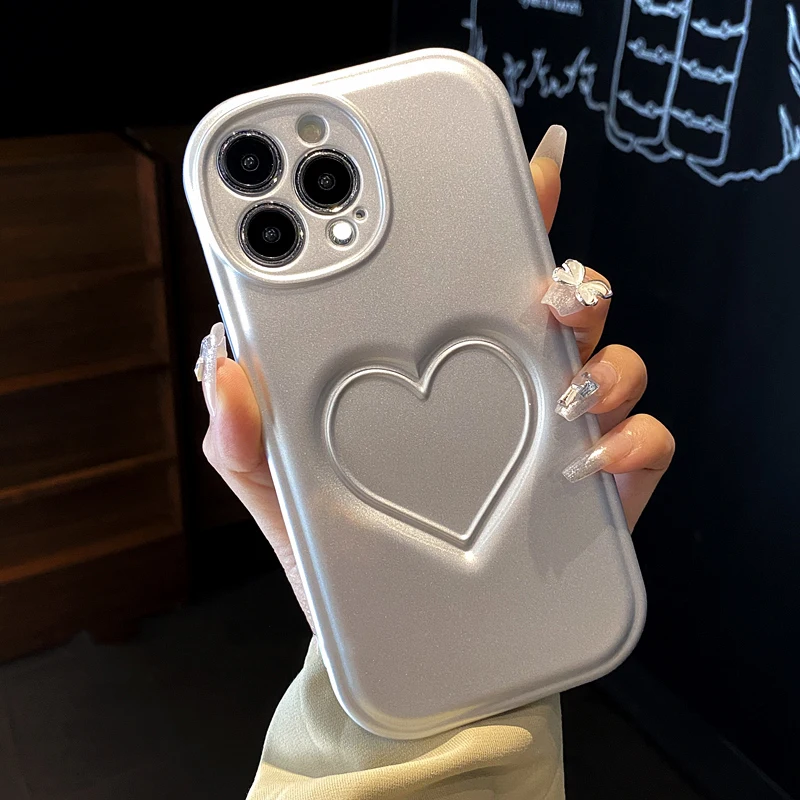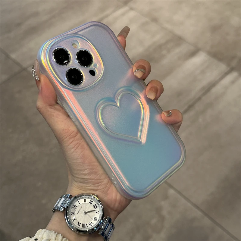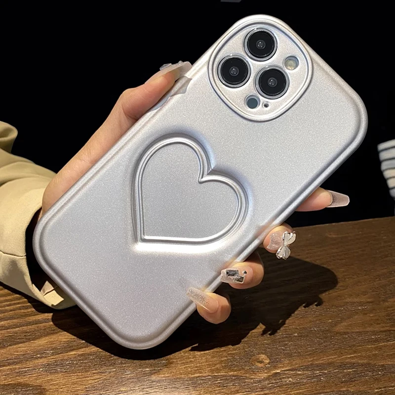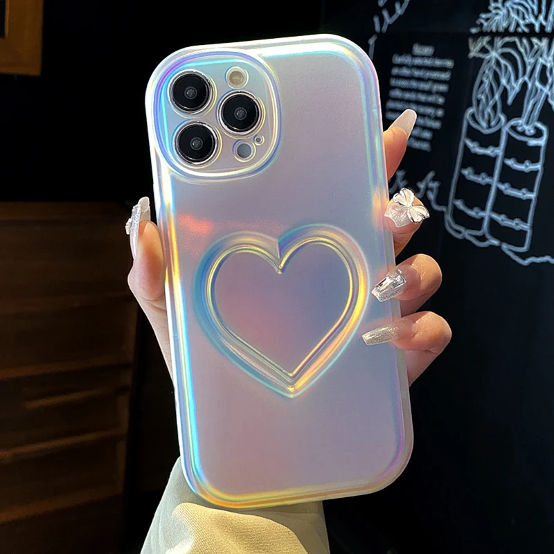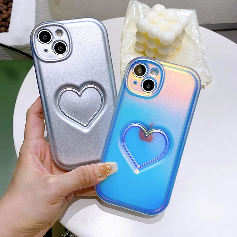 Estética 3D en relieve amor corazón láser brillo chapado plata caso para iPhone 15 Pro Max 14 13 11 12 moda borde redondeado cubierta