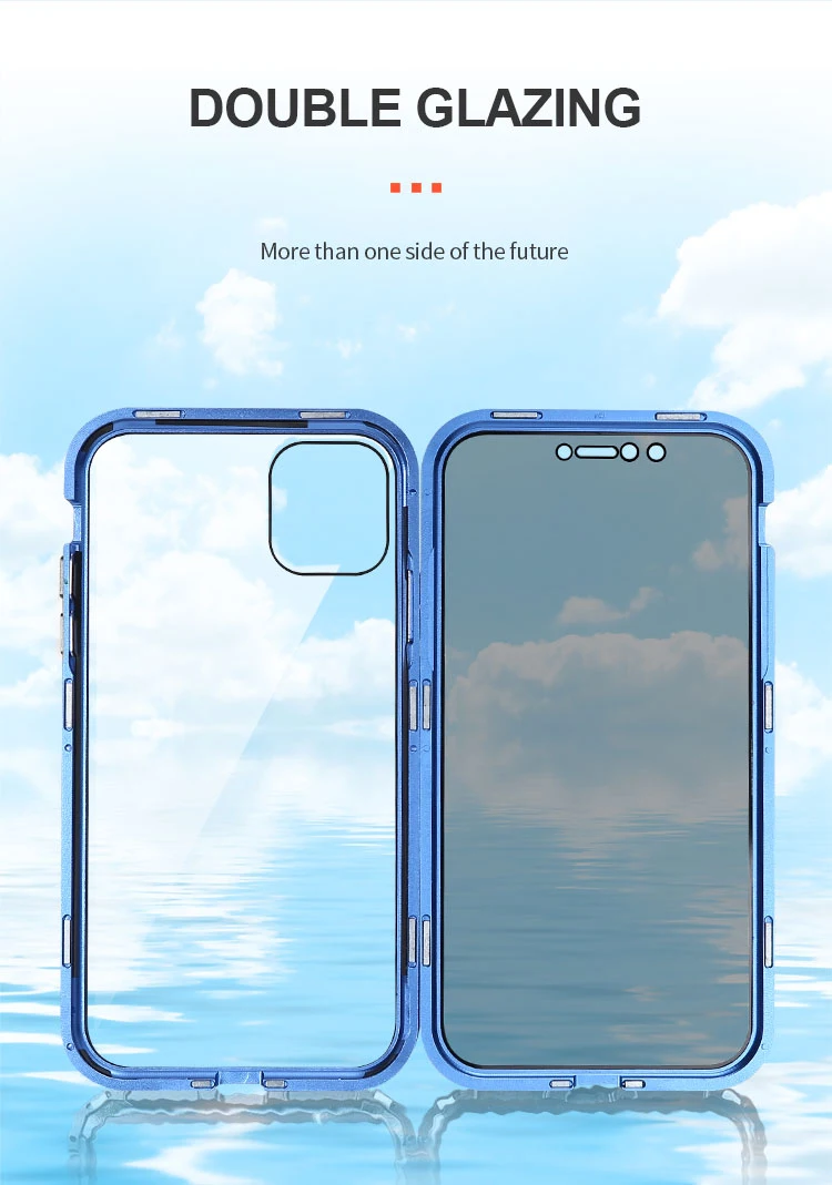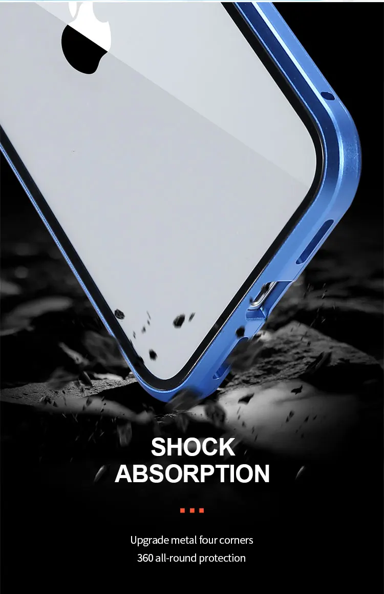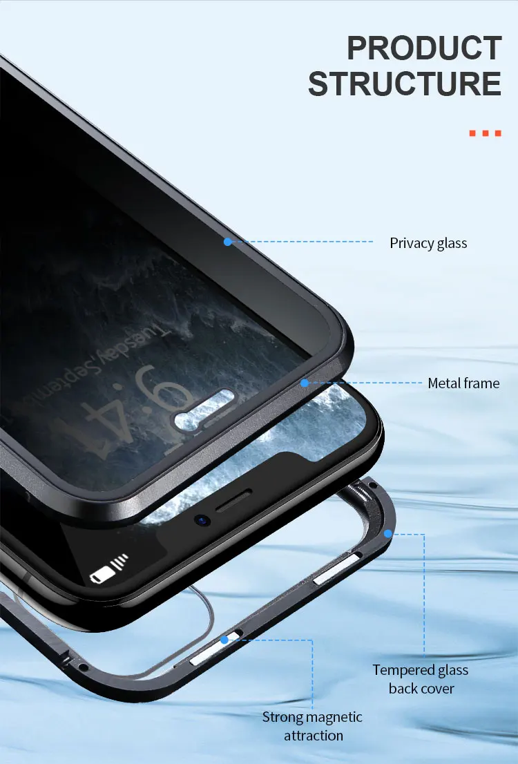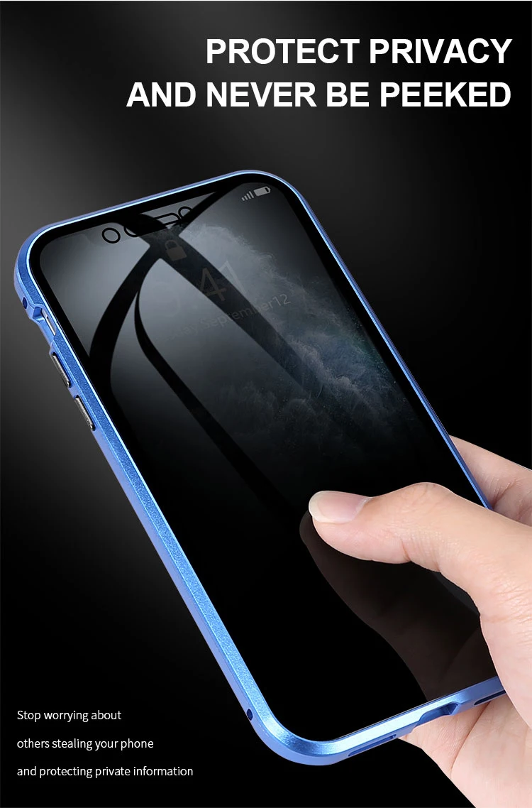 Características: [Tecnología de adsorción magnética]: Los múltiples puntos y la fuerte tecnología de adsorción magnética hacen que la carcasa sea perfecta y siempre fácil de sacar su teléfono. [Vidrio templado 9H delante y detrás]: La parte delantera y trasera están hechas de vidrio templado 9H para mostrar el diseño original del teléfono y preservar el aspecto natural del teléfono. [Marco metálico de cuerpo completo]; Las fundas de metal delgadas y ligeras de 2 piezas proporcionan protección contra caídas, golpes, golpes, manchas y arañazos. [Cortes precisos]: Es súper perfecto cuando los marcos metálicos se cierran magnéticamente, las cubiertas delgadas se ajustan bien a su dispositivo y facilitan el acceso a todos los puertos, altavoces, cargadores y todas las funciones del teléfono. Especificaciones: Material: vidrio templado + marco de metal Estilo: funda de teléfono de vidrio templado con adsorción magnética antiespionaje Paquete: 1 funda magnética de vidrio templado antiespionaje