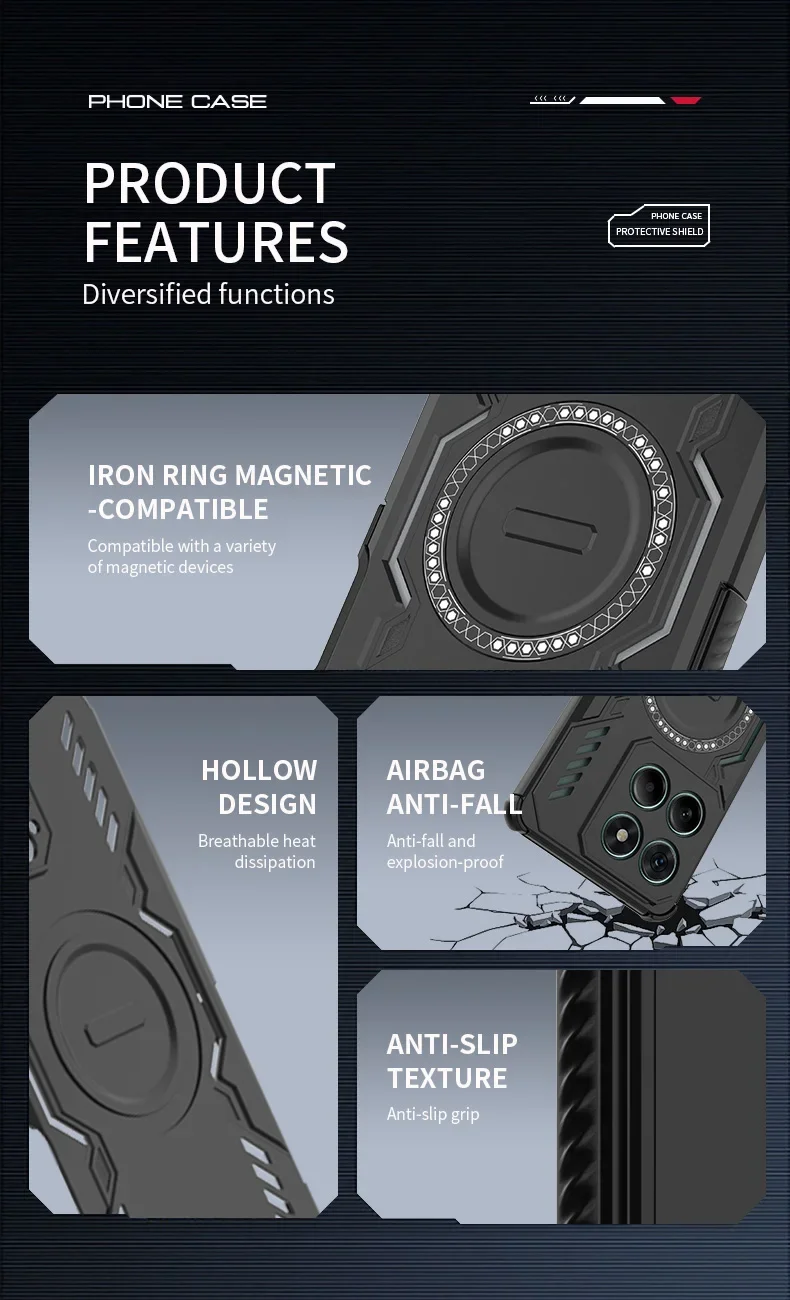Características: - Material duradero: hecho de material de PC, resistente y duradero. - El diseño hueco del panel posterior facilita la mejora de la velocidad de disipación de calor. - Fuerte magnético: seguro para conducir, admite soporte magnético para automóvil MagSafe - Admite carga inalámbrica: módulos magnéticos Magsafe integrados, que se pueden conectar de forma inteligente entre sí mediante magnetismo.Los imanes se alinean automáticamente con el cargador Magsafe para una carga rápida y sencilla. - Protección de pantalla y cámara: los bordes elevados protegen la pantalla y la cámara contra rasguños y caídas. - Agarre cómodo: resistente a golpes, desgarros, rayones, resbalones y acumulación de polvo - Fácil de usar: diseño fácil de colocar/desmontar, perfecto para la instalación - Recortes precisos de acceso completo: recortes precisos para altavoz, puerto de carga, puerto de audio y botones. Todos los puertos y botones son fácilmente accesibles sin quitar la funda.