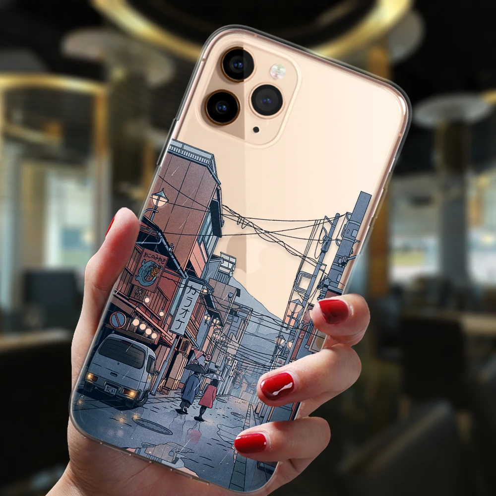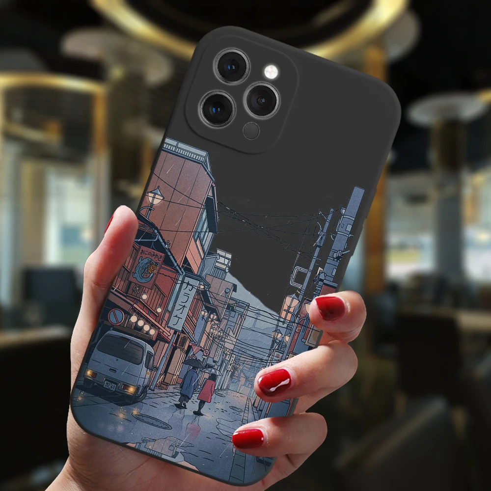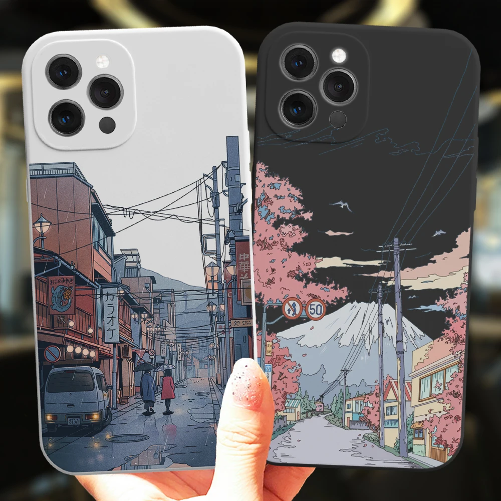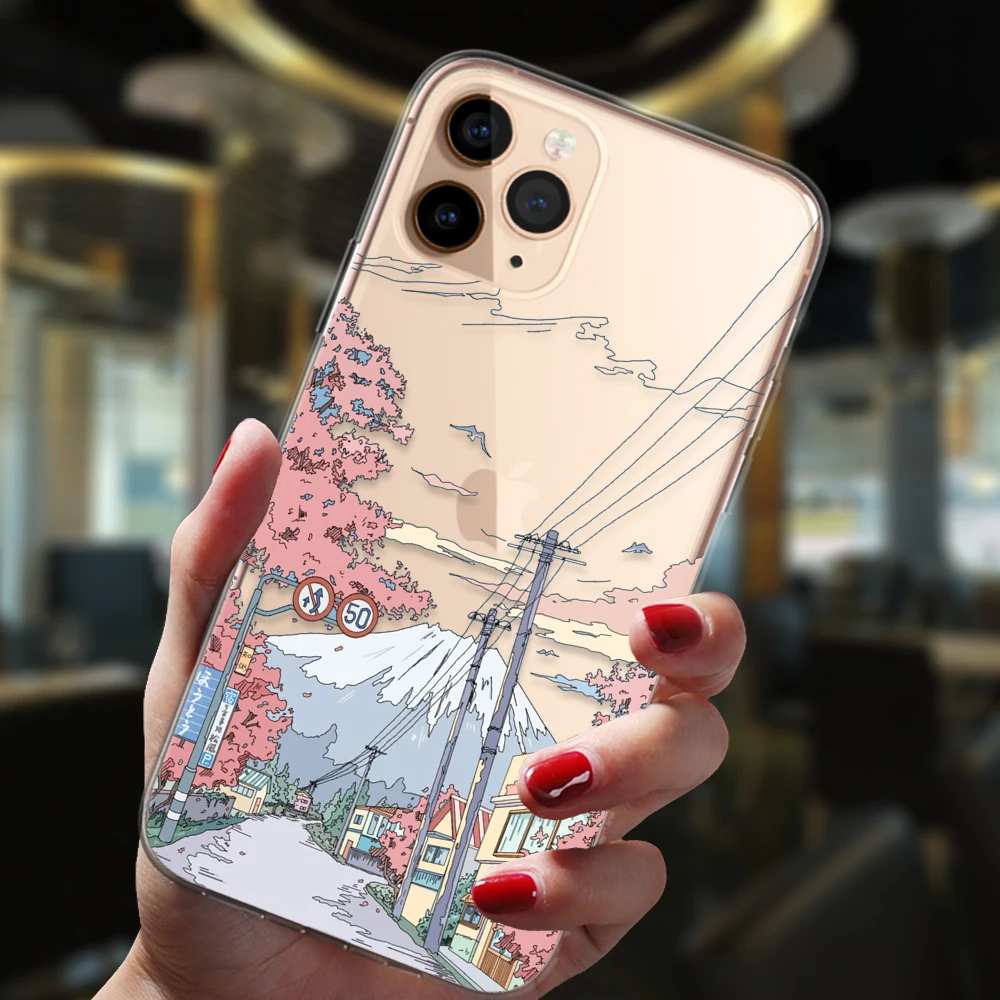 Para iPhone 13 11 12 14 Pro Max Mini 14Plus funda protectora moda Japón coreano puesta de sol paisaje Popular Candy cubierta de silicona
