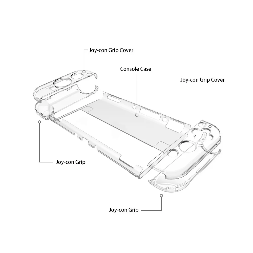 Características:1. Perfectamente compatible con Switch Oled.2. El diseño transparente y simple realza su belleza más natural.3. Recortes de precisión para facilitar el acceso a todos los puertos/botones.4. Una funda delgada que no añadirá tamaño o peso innecesario.5. La superficie lisa te hace sentir cómodo.6. El diseño inferior es perfecto para el soporte.7. El material de PC de carcasa dura antiarañazos ofrece la máxima protección.8. Las Esquinas reforzadas protegen contra golpes, caídas, polvo y huellas dactilares.9. Resistente y duradero.10. El estuche está dividido en 5 partes, no tienes que separar el estuche para quitar el Joy-Con.