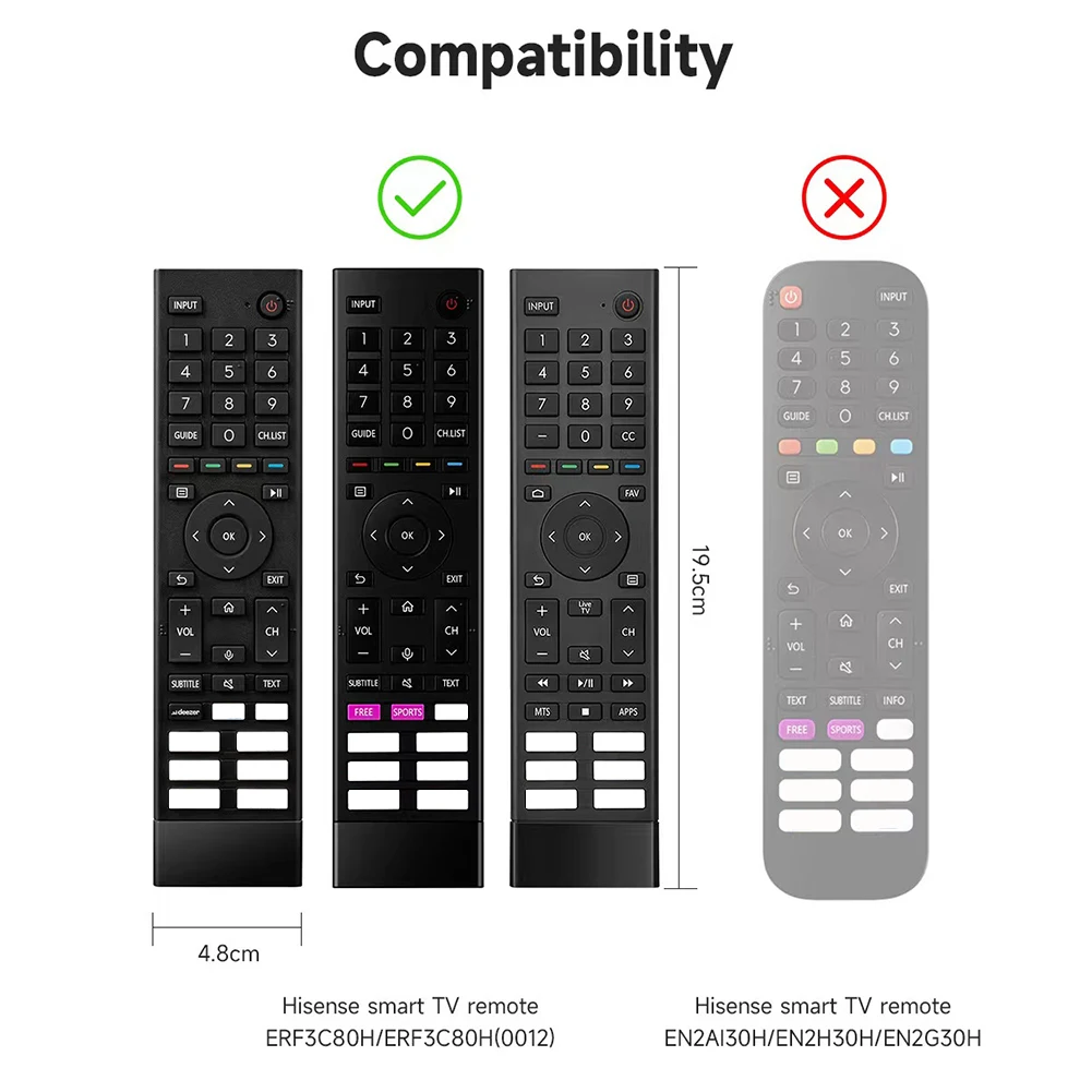 5. Precautions: Package content: 1 remote control protective cover (only the housing, excluding the remote control). Before purchasing, please check the model of the Hisense remote control housing to ensure that your Hisense smart TV remote control is identical to the remote control shown in the figure, especially the location of the buttons and the shape of the remote control.