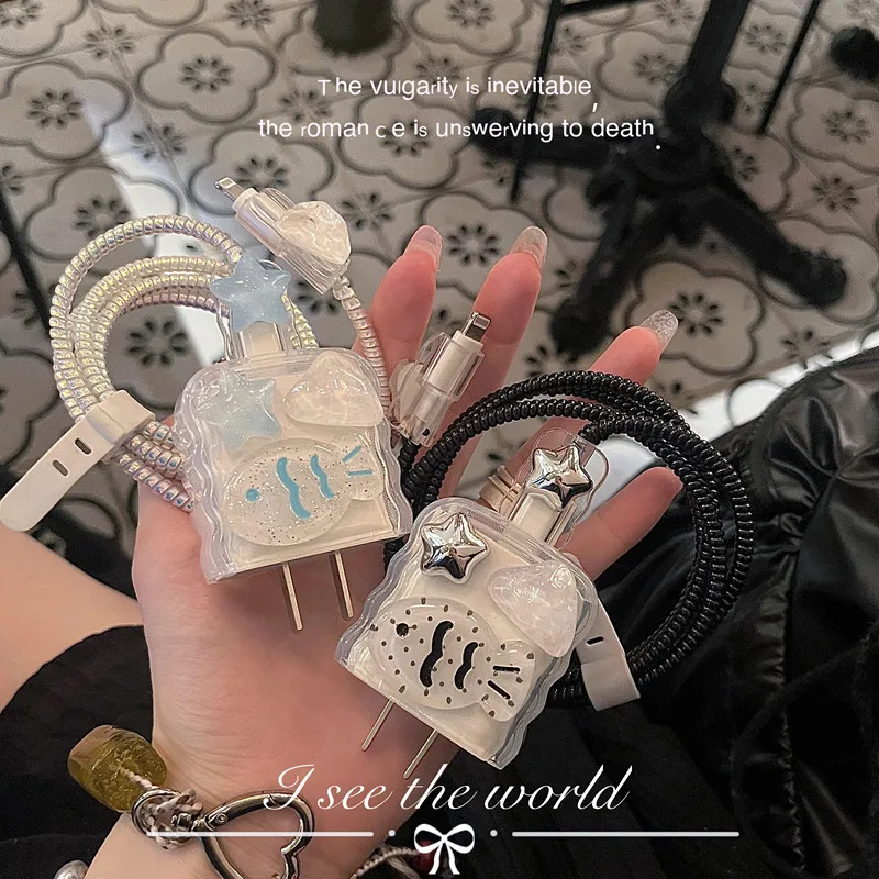 Funda protectora USB transparente con borde de onda de estrella de pez, carcasa 3D Kawaii para iPhone de 18W/20W, cable de cabeza de línea de datos, funda de carga rápida