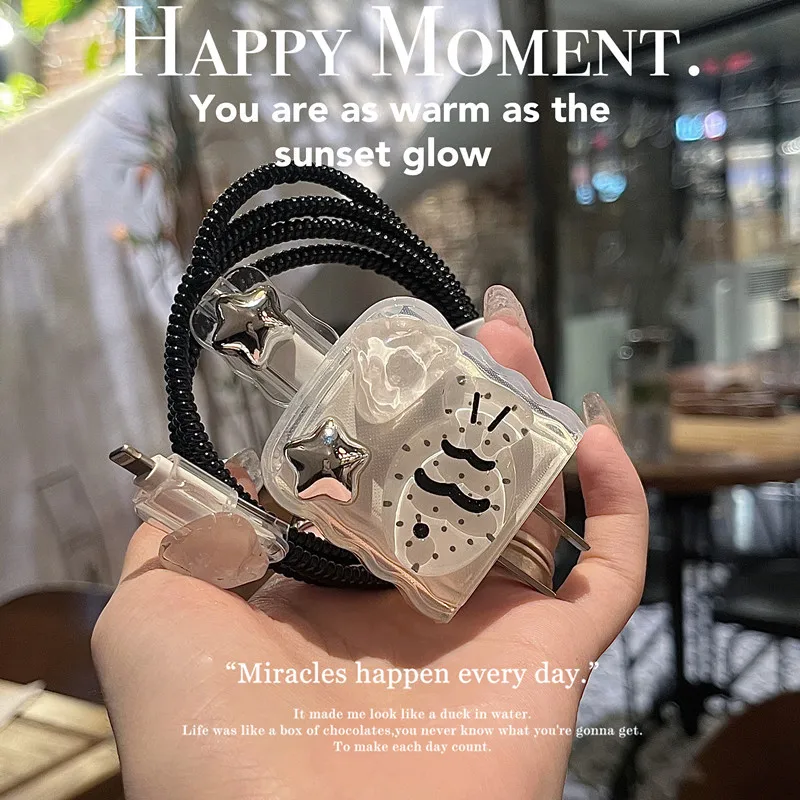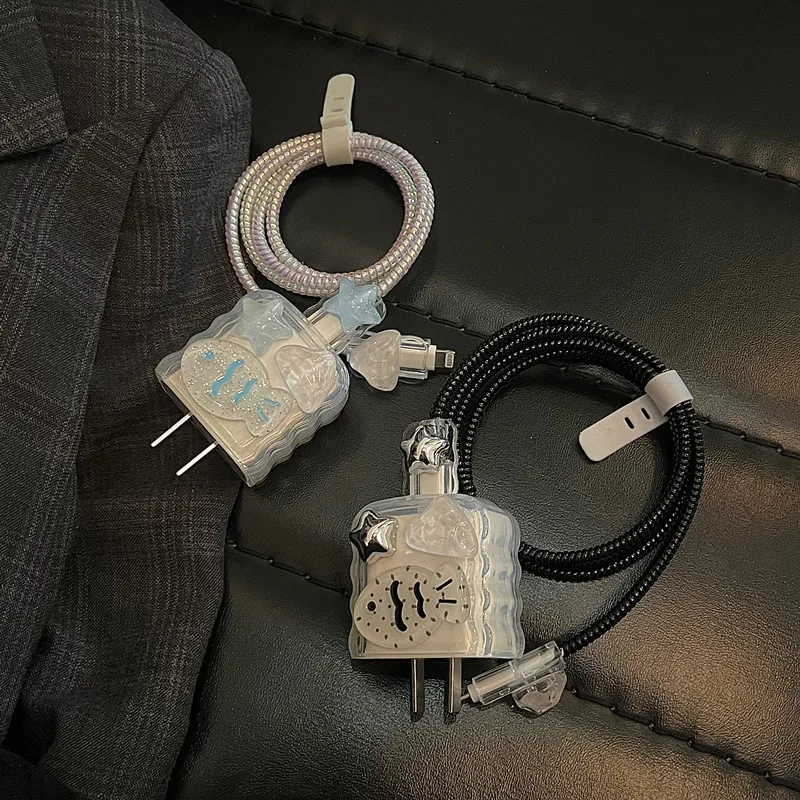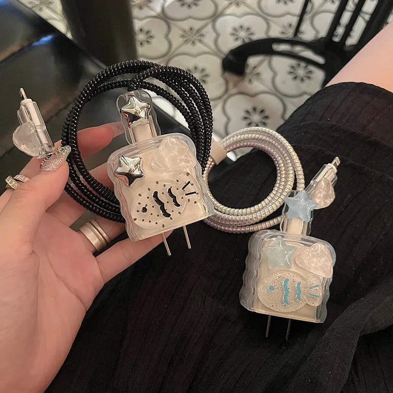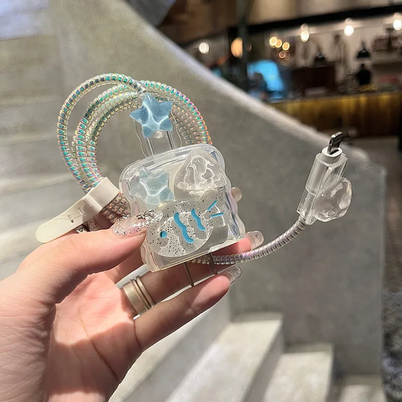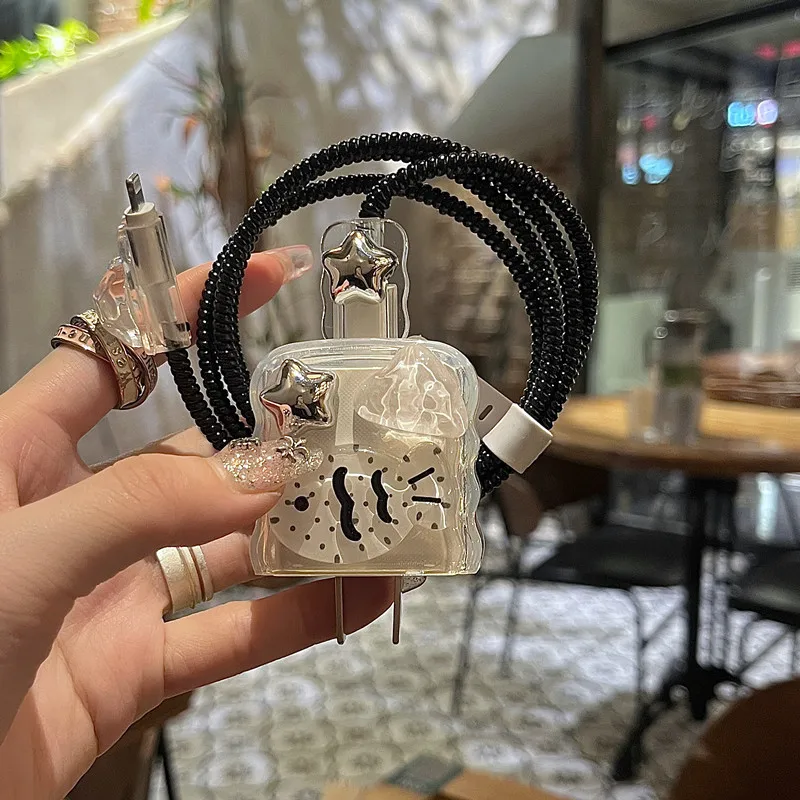 Comprar Funda protectora USB transparente con borde de onda de estrella de pez, carcasa 3D Kawaii para iPhone de 18W/20W, cable de cabeza de línea de datos, funda de carga rápida