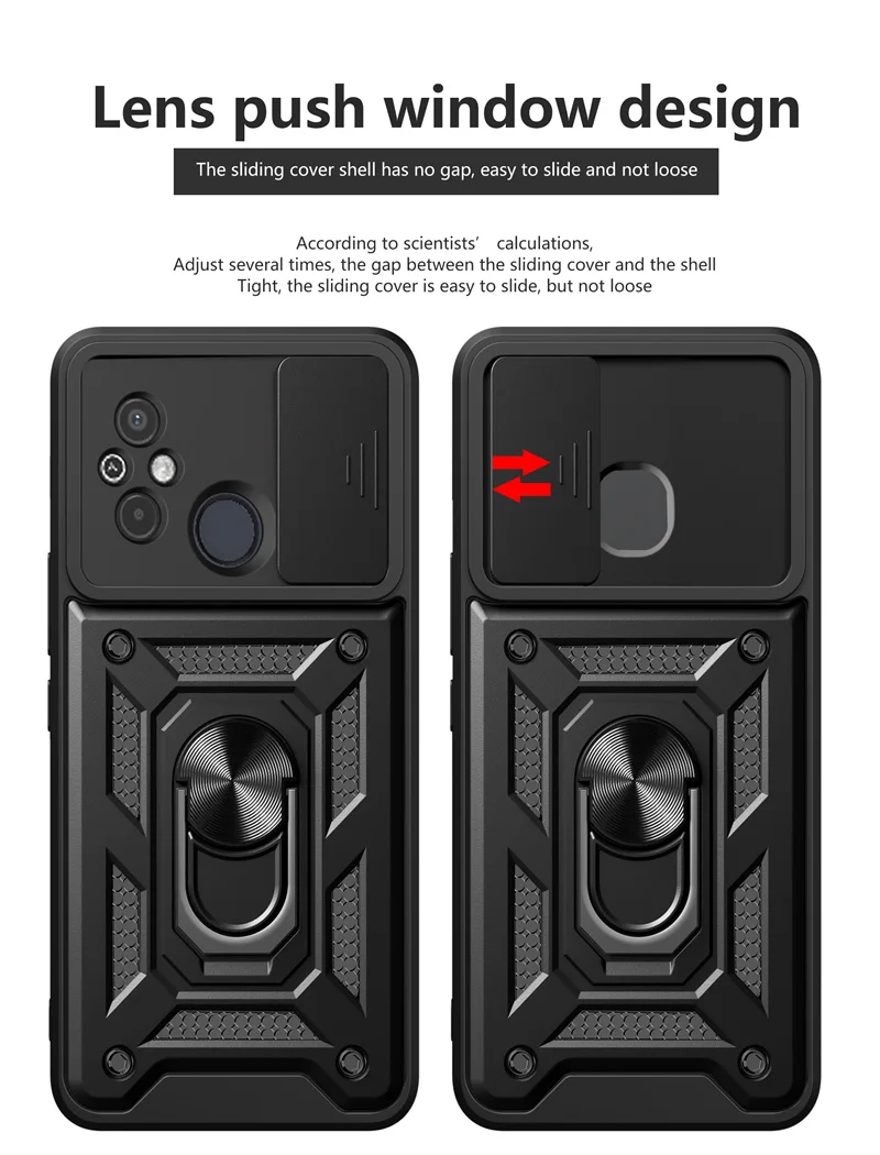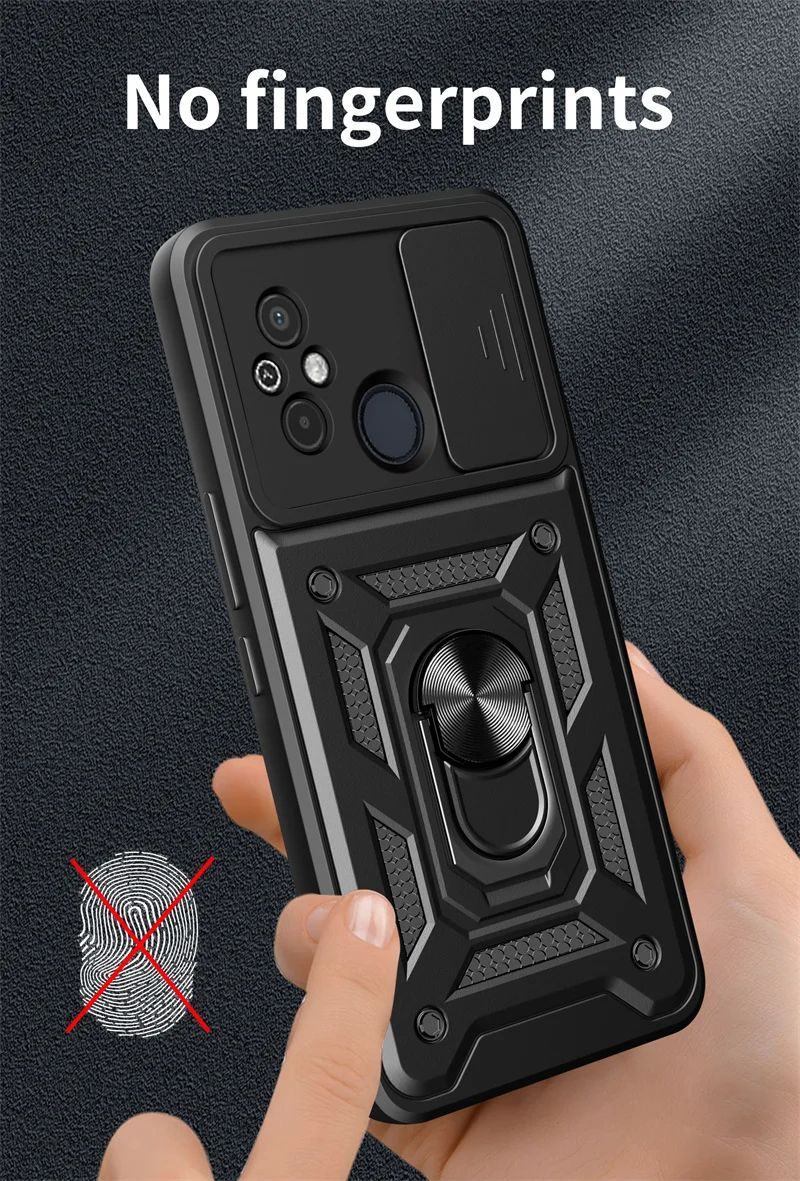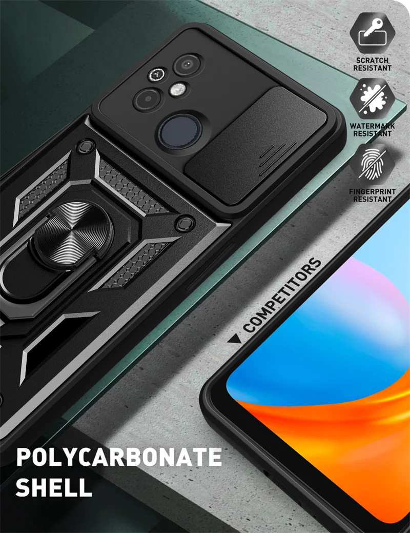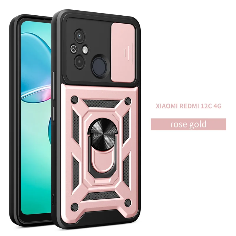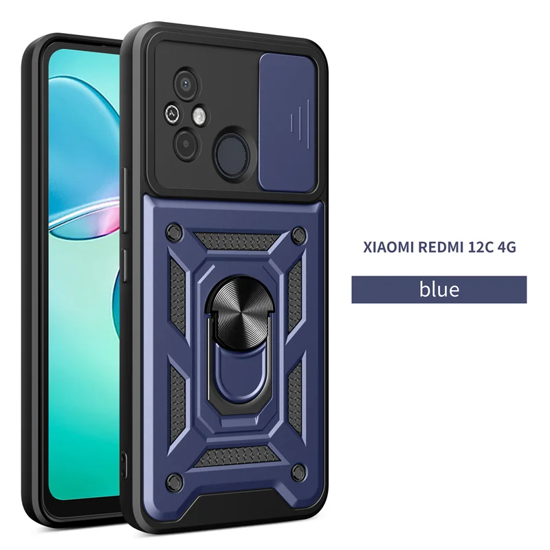 Comprar Funda protectora para Xiaomi Redmi 12C, carcasa a prueba de golpes con soporte de anillo, protector de lente deslizante