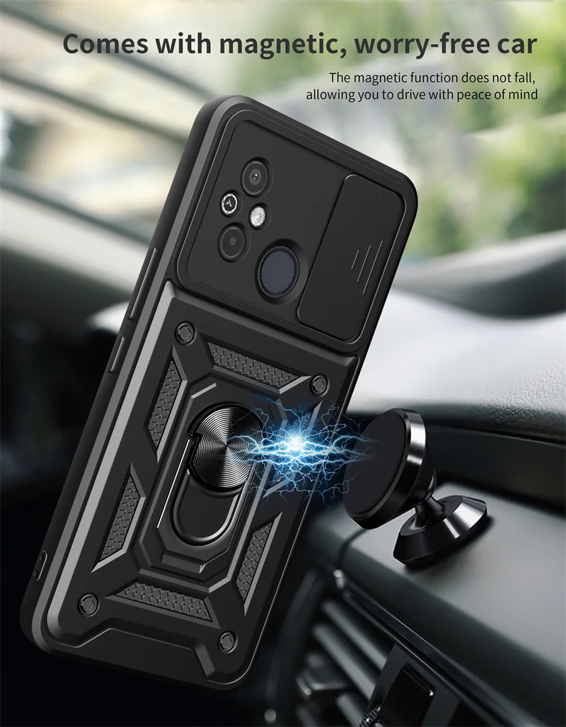 Comprar Funda protectora para Xiaomi Redmi 12C, carcasa a prueba de golpes con soporte de anillo, protector de lente deslizante