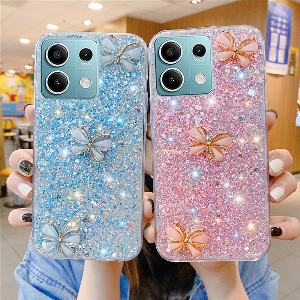 Funda con purpurina de mariposa 3D de cristal para Xiaomi Redmi Note 14 Pro Plus 4G 5G 14C 14T Pro POCO X7 X6 Pro funda de silicona suave para teléfono