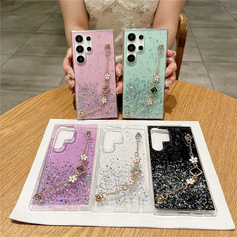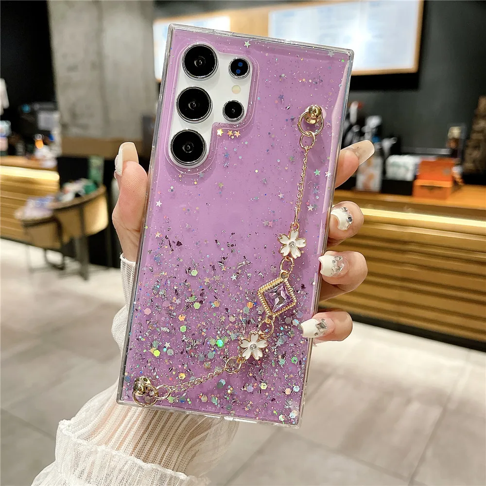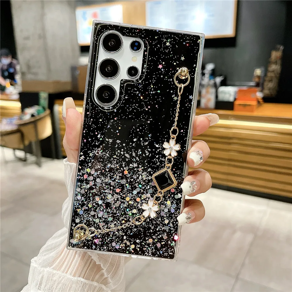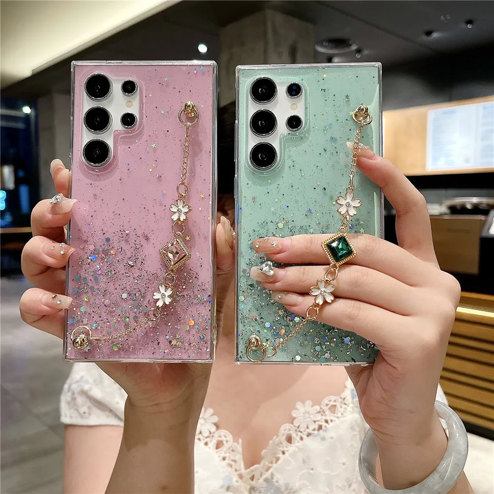 Funda con purpurina y pulsera de flores a la moda para Samsung Galaxy S24 S23 S22 S21 S20 FE Ultra Plus S10 Note 20 funda de silicona Ultra suave