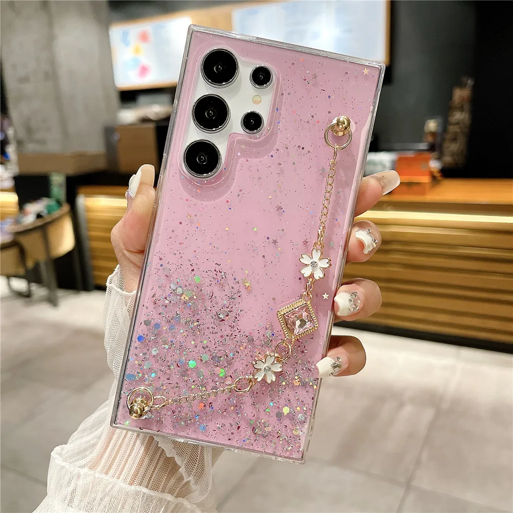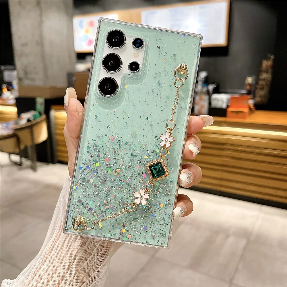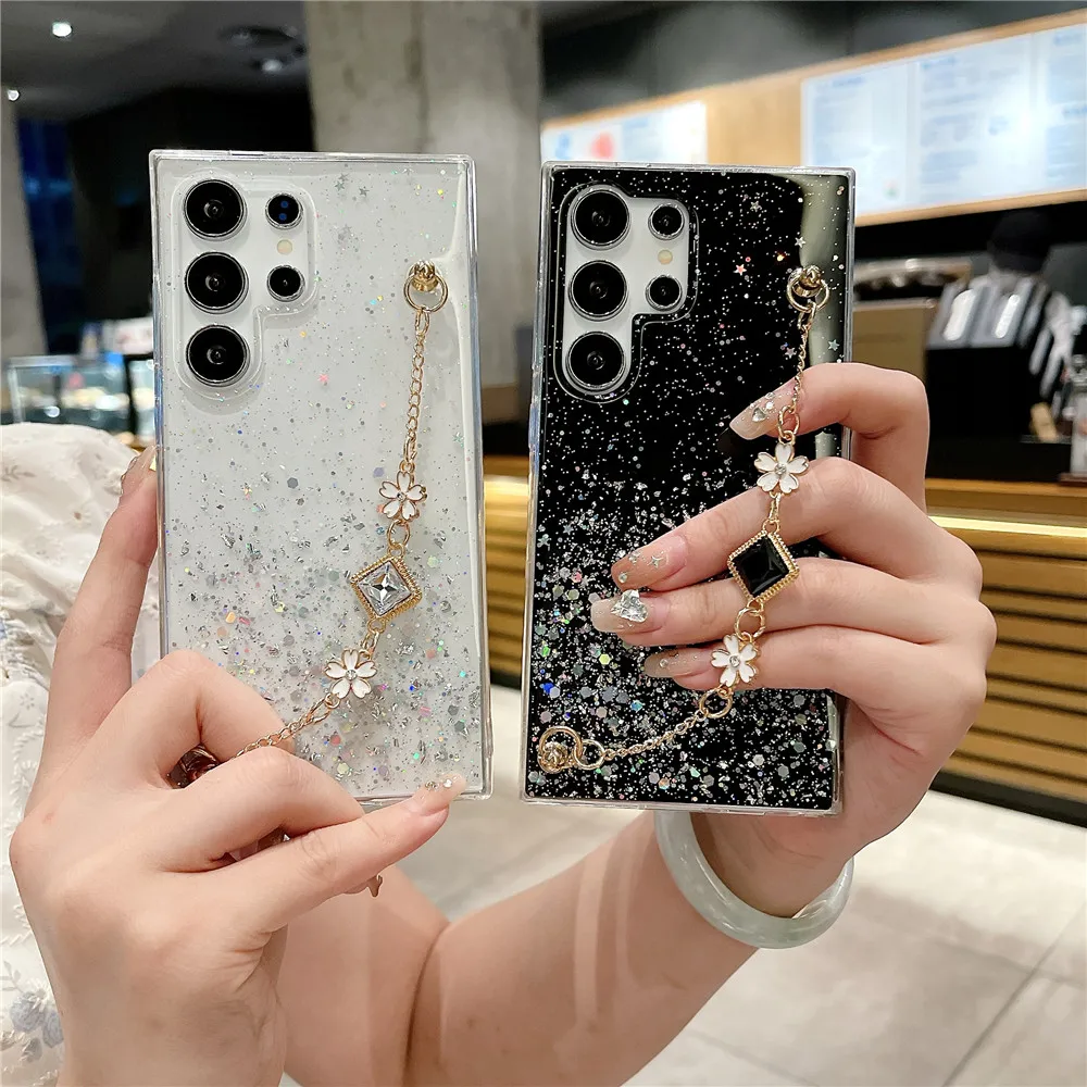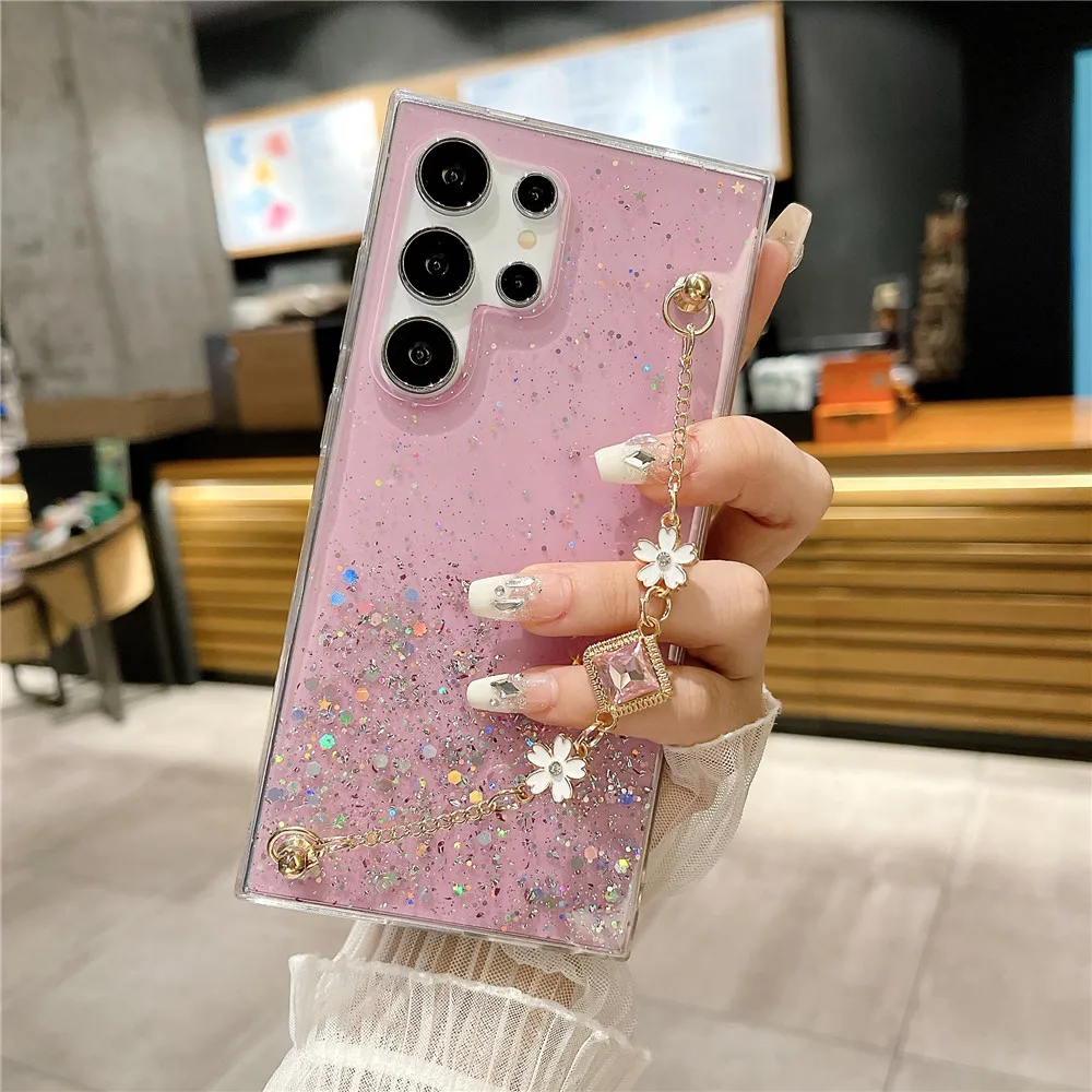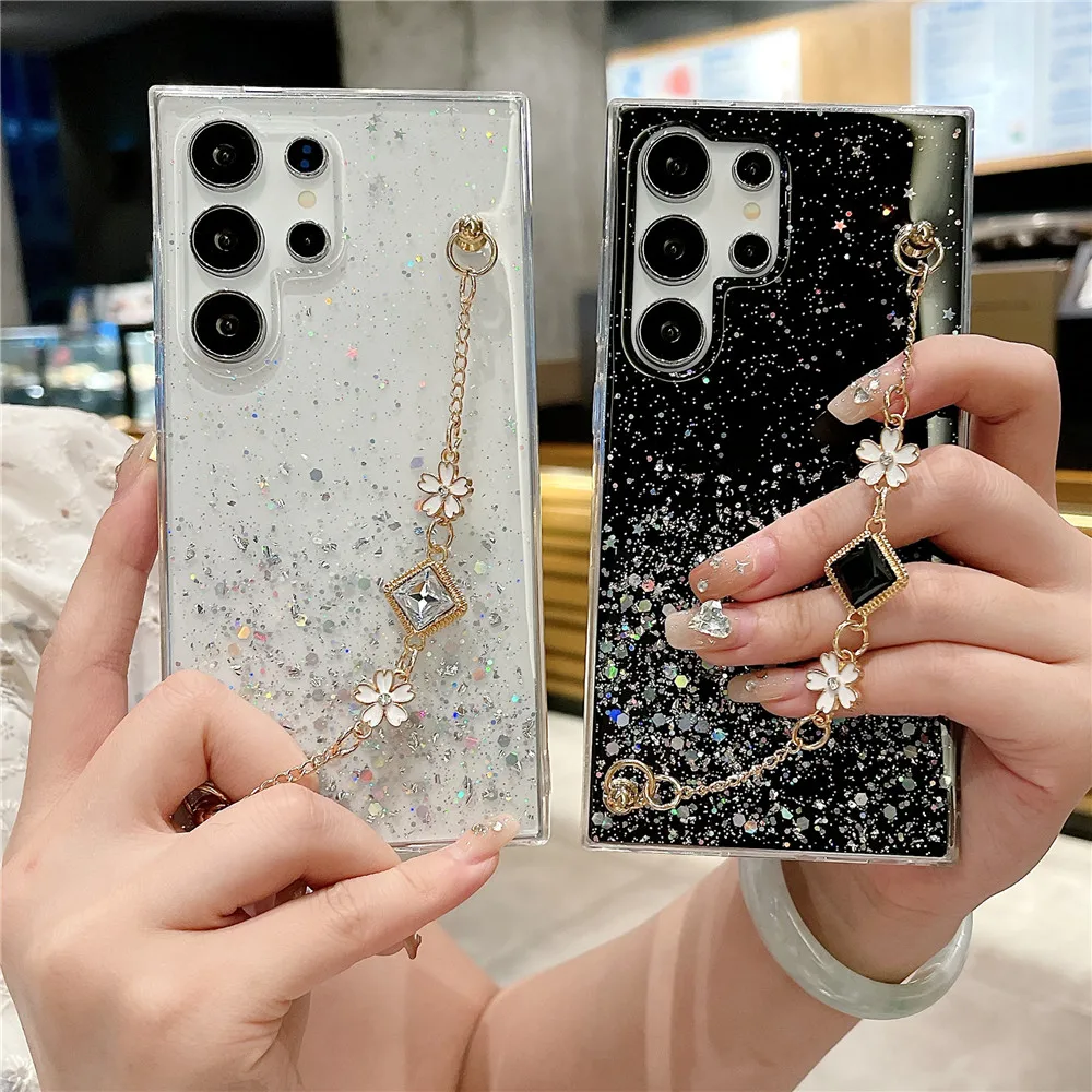 Funda con purpurina y pulsera de flores a la moda para Samsung Galaxy S24 S23 S22 S21 S20 FE Ultra Plus S10 Note 20 funda de silicona Ultra suave