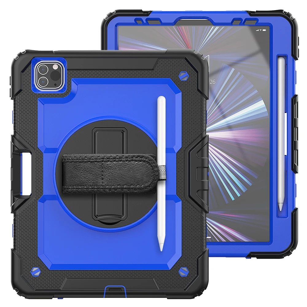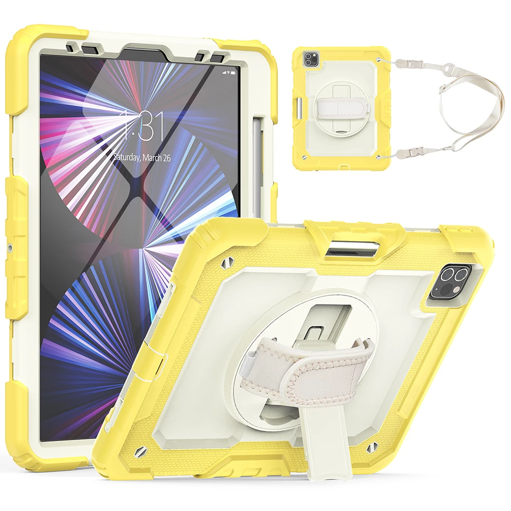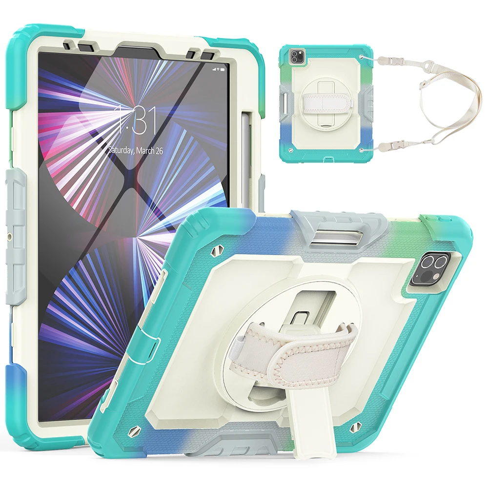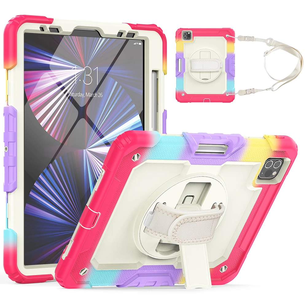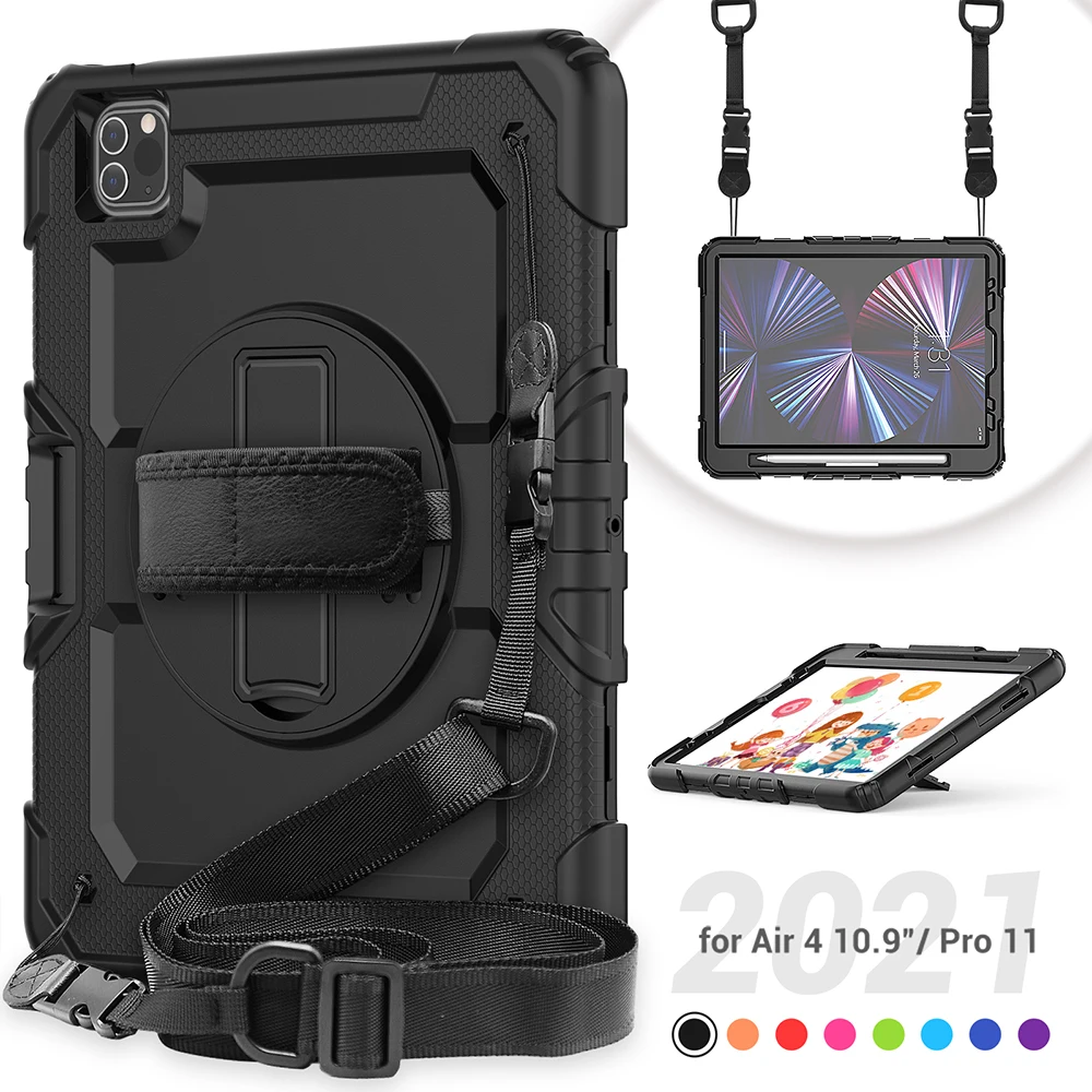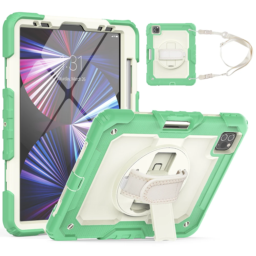 -360°Rotatable Built-in Kickstand and Adjustable hand strap & Adjustable shoulder strap for multiple possibilities,an extension strap is placed on the back to place your Apple Pencil.