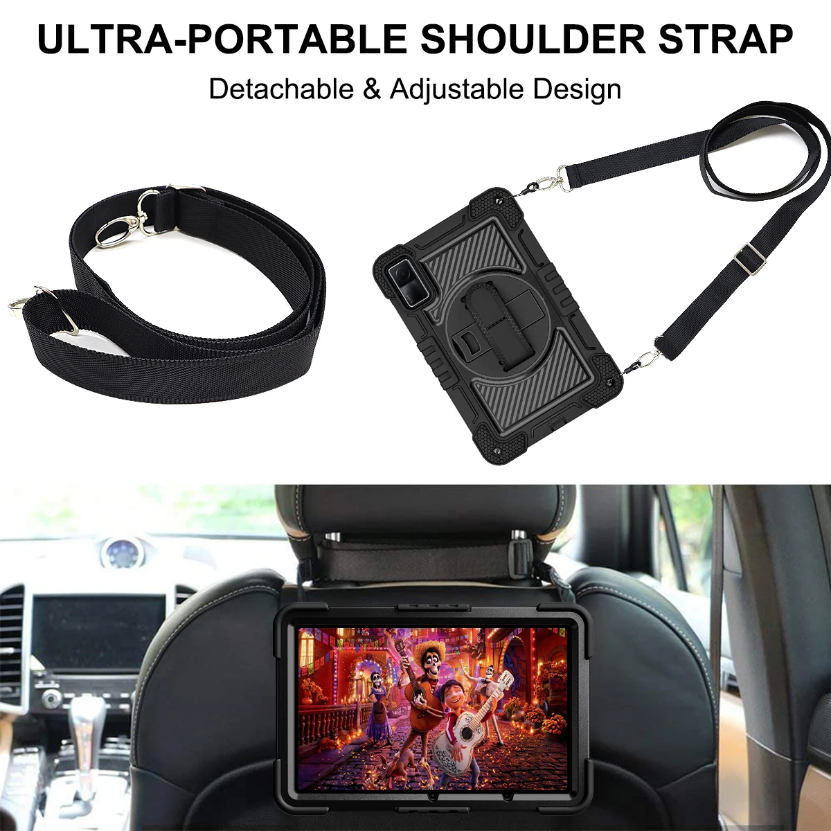 Acerca de este producto: 1.Correas de mano y correas de hombro: Las correas de mano ajustables brindan un agarre fácil y un agarre cómodo; Las correas de hombro ajustables hacen que sea más conveniente llevar su tableta en viajes de negocios o actividades al aire libre.También se puede colgar en el reposacabezas del coche para el entretenimiento de los pasajeros del asiento trasero. 2.Soporte giratorio: este estuche con portalápices tiene un soporte giratorio de 360 grados.Y se puede girar mediante el ángulo de visión y el ángulo de escritura.Libera tus manos para facilitar la hora de la cara/videoconferencia, mira vídeos.(⚠️Tenga en cuenta: ¡El lápiz no está incluido!)