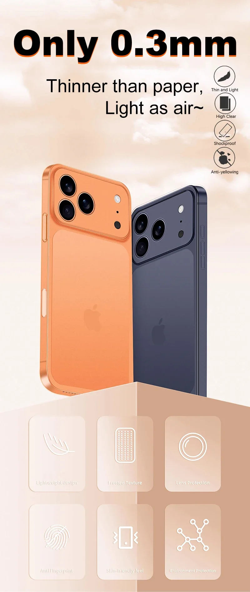 Funda rígida ultrafina de PP transparente mate de 0,3 mm para iPhone 17 pro Max, carcasa suave transparente naranja, Compatible con iPhone AIR