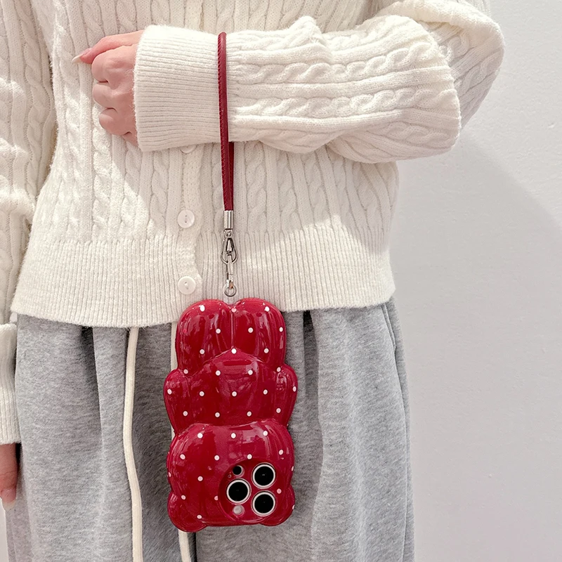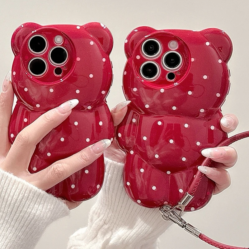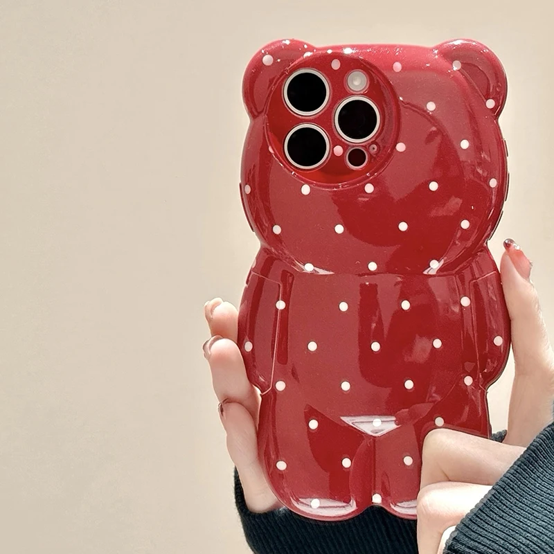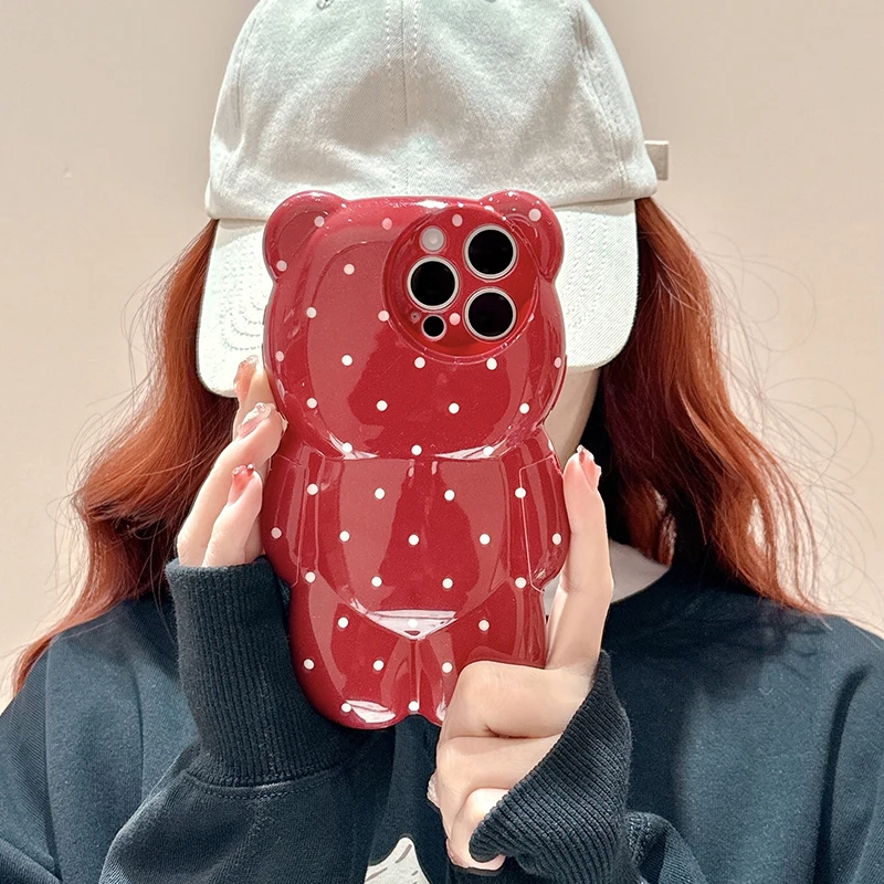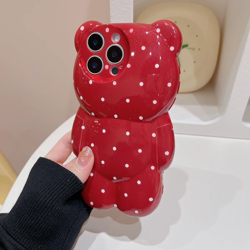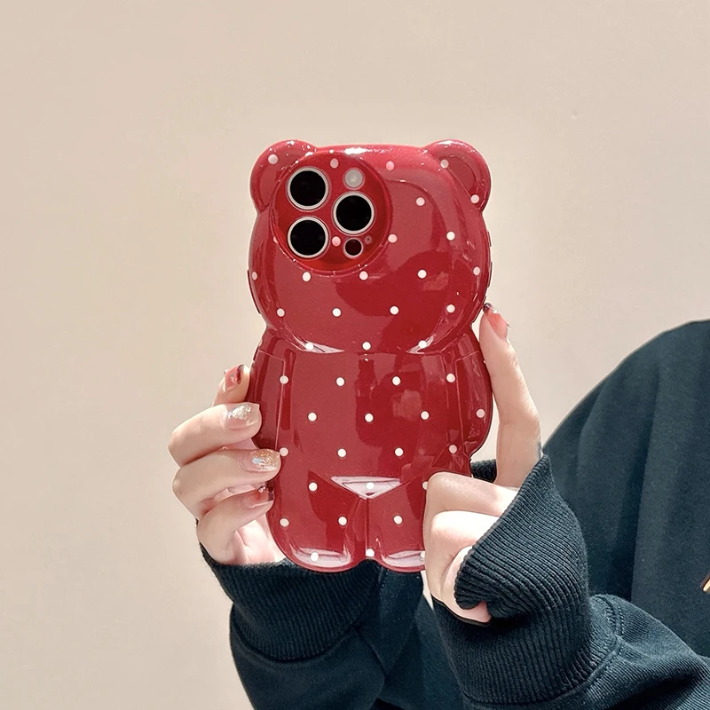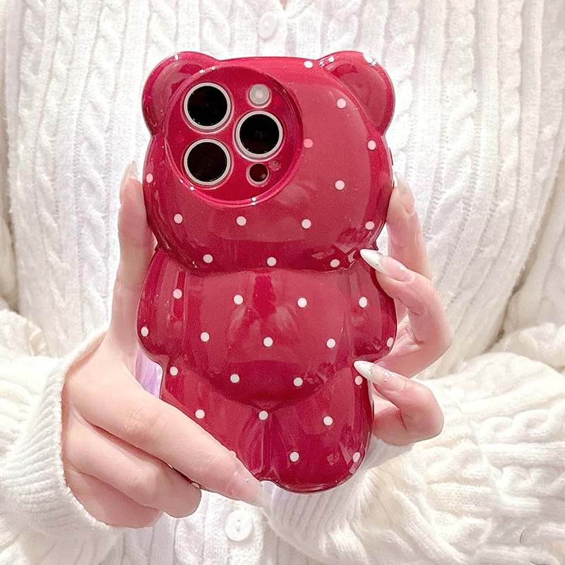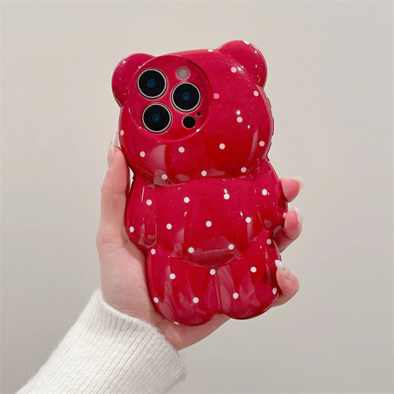 Cute 3D Circular Dots Red Bear Glossy Silicone Case For iPhone 16 15 13 14 12 11 Pro Max Soft TPU Shockproof Phone Back Cover