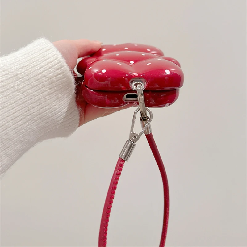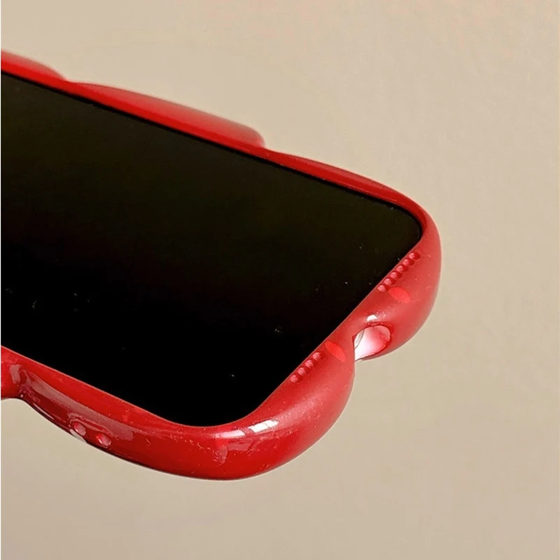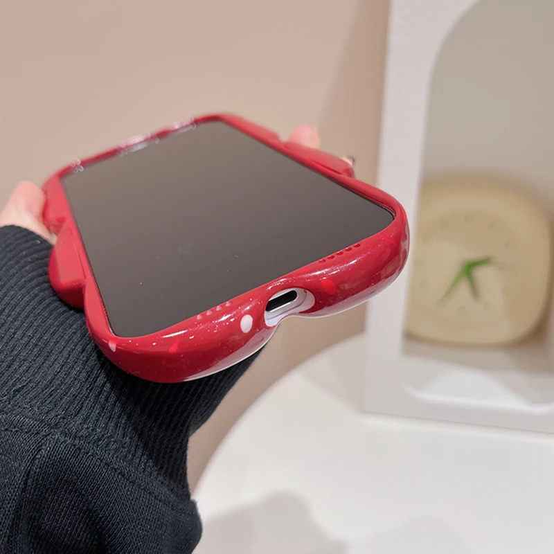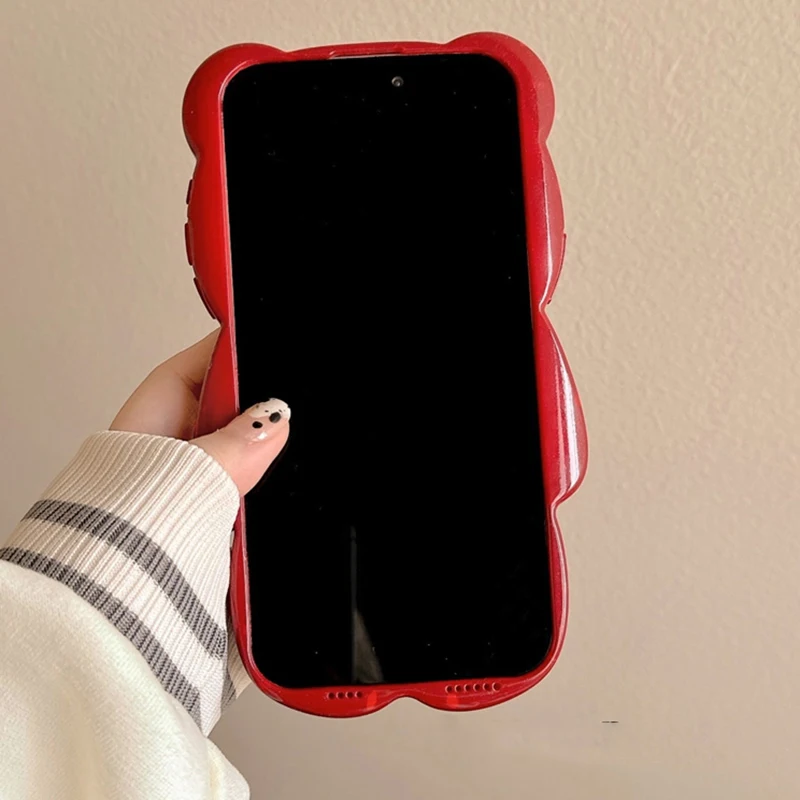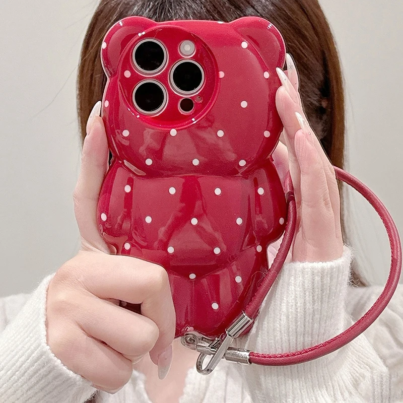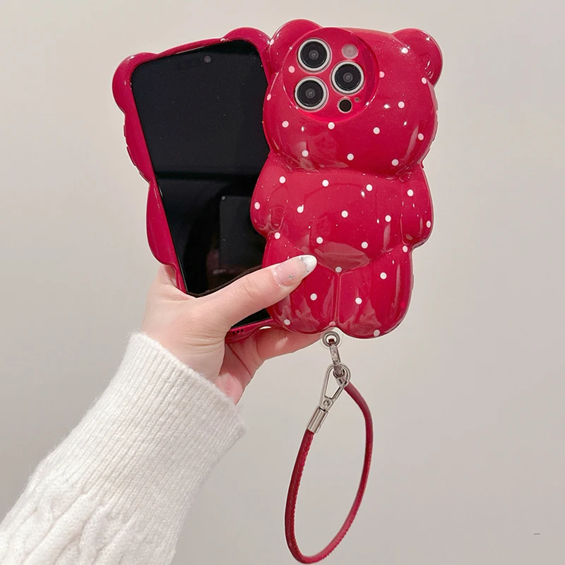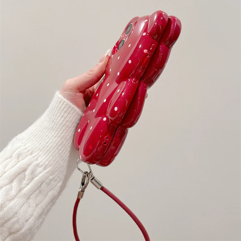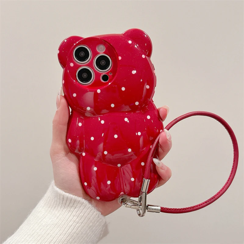 Cute 3D Circular Dots Red Bear Glossy Silicone Case For iPhone 16 15 13 14 12 11 Pro Max Soft TPU Shockproof Phone Back Cover