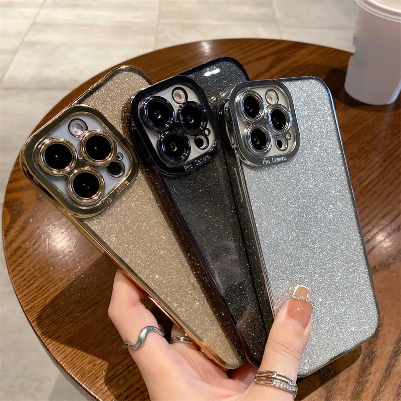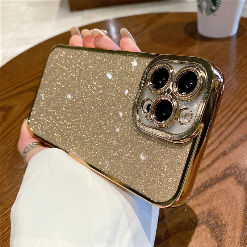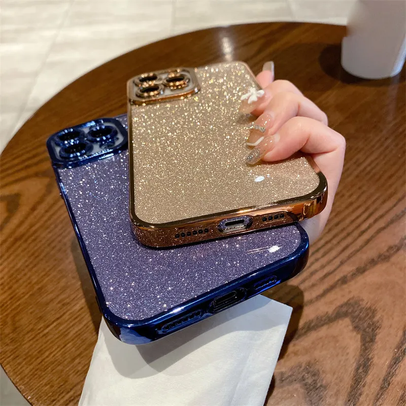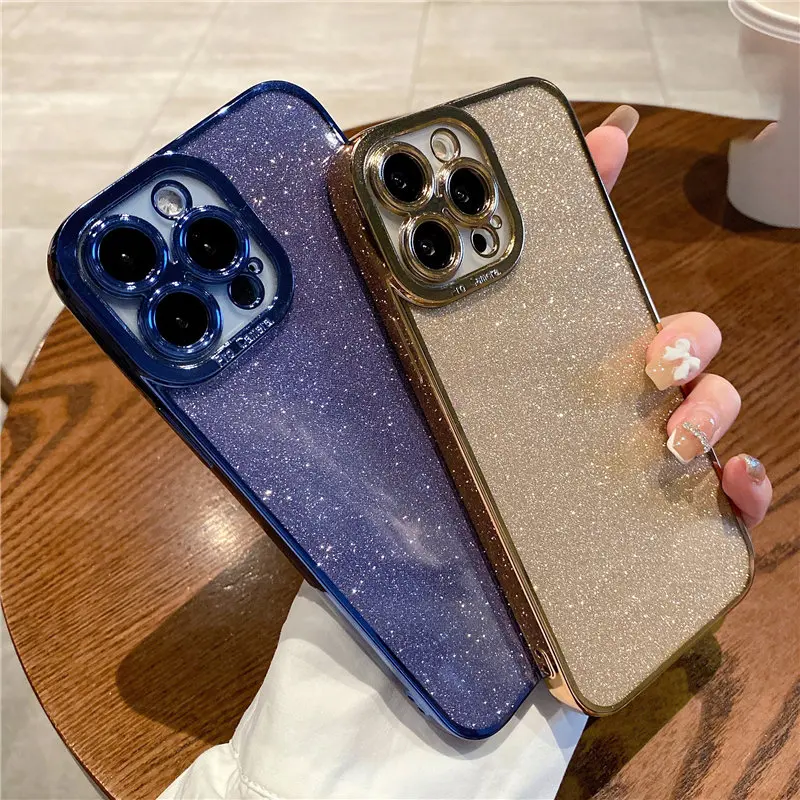 Funda de silicona con brillo ostentoso chapado de lujo para iPhone, 11, 13, 14 Pro, X, Xr, Xs, Max 12, protección de lente en SE2, 7, 8 Plus, funda de lentejuelas