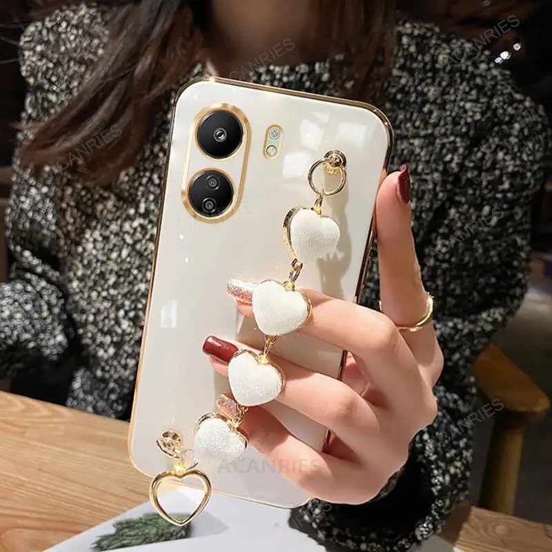 Redmi13c Love Heart Wrist Chain Silicone Case On For Xiaomi Redmi 13c 12c 12 10 Redmi10 4g 10a 10c 9c 10a Luxury Plating Cover