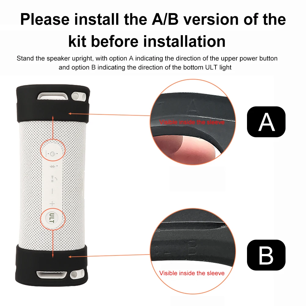 5.Funda protectora para altavoz fácil de usar:La funda protectora del altavoz viene en versiones A/B, con A para la dirección del botón de encendido superior y B para la dirección de luz ULT inferior.La funda es fácil de instalar y quitar sin necesidad de herramientas.Su diseño suave y flexible permite una instalación y extracción sin complicaciones.