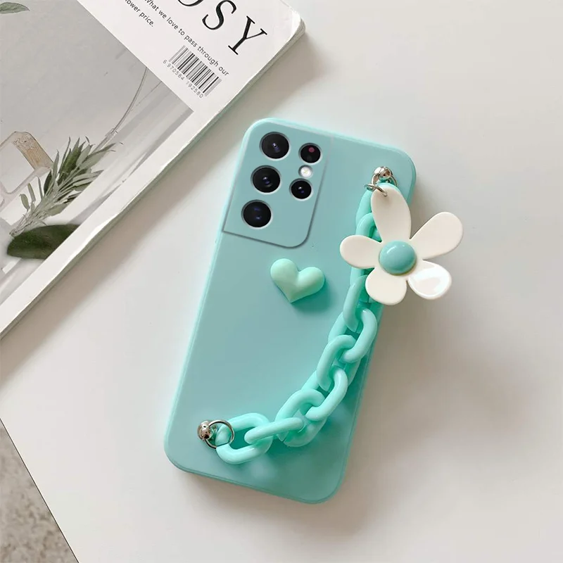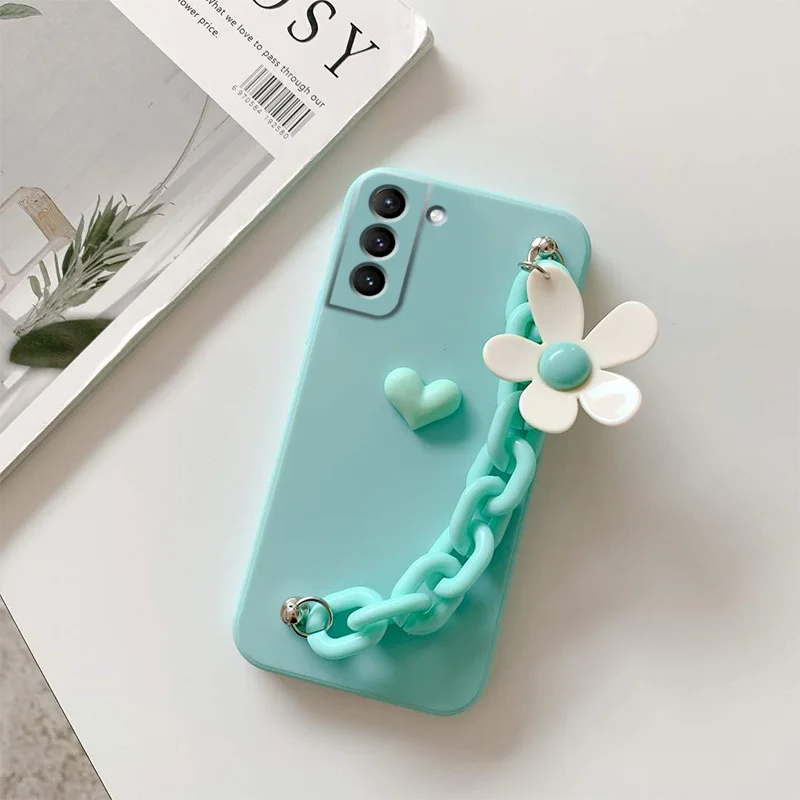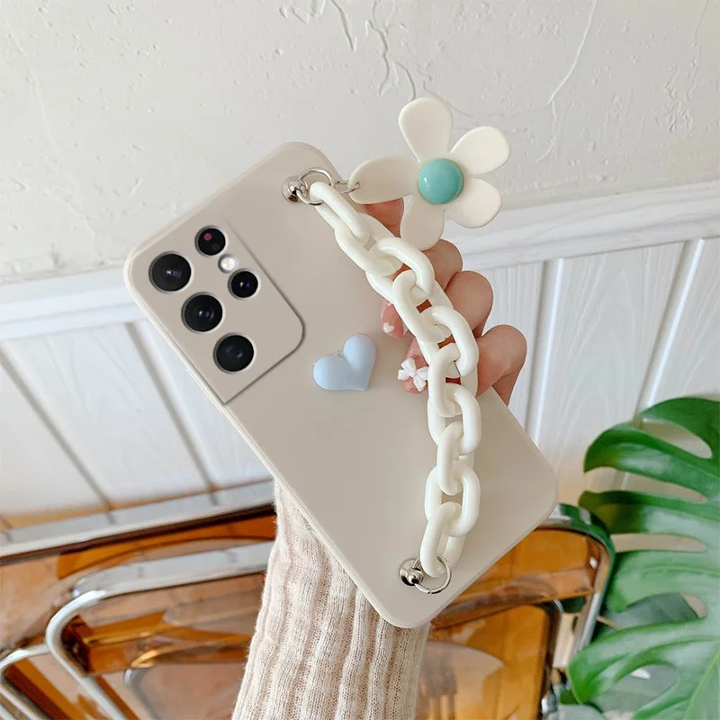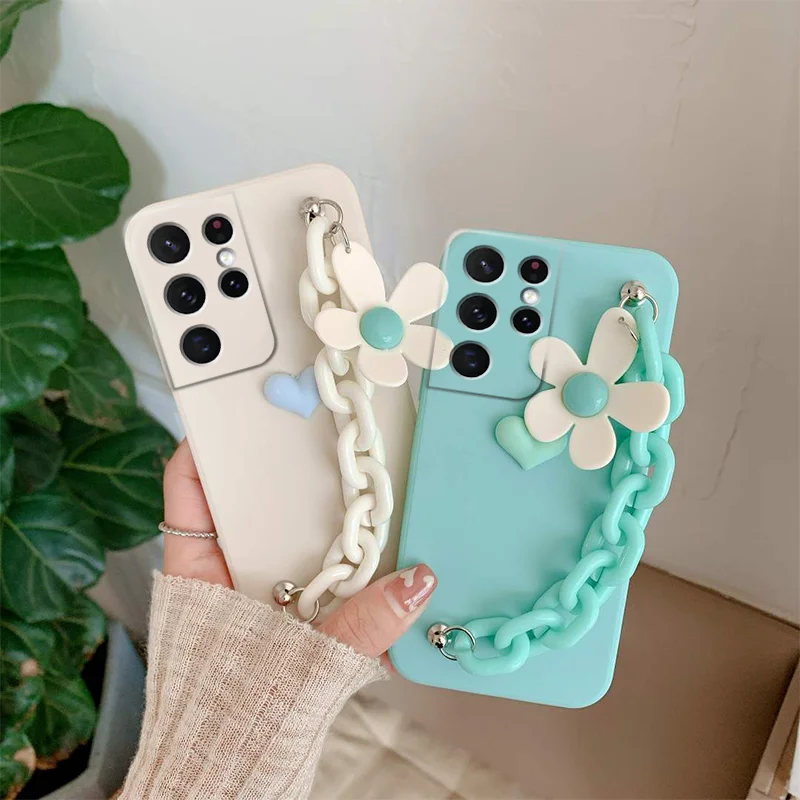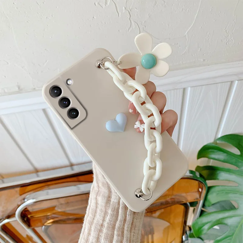 Love Flower Bracelet Chain Phone Case for Samsung Galaxy S22 S21 S20 Ultra FE S10 Plus Lite Wrist Strap Silicone Cover