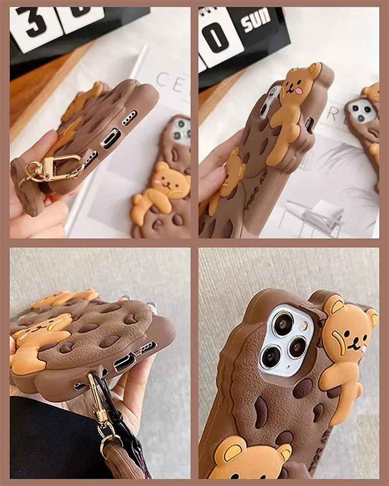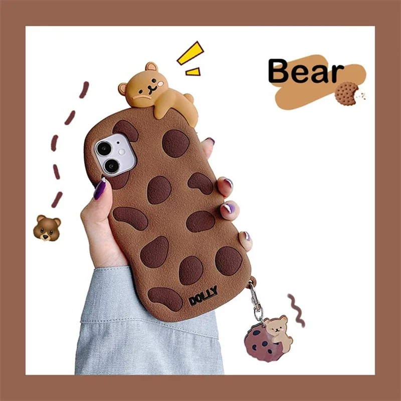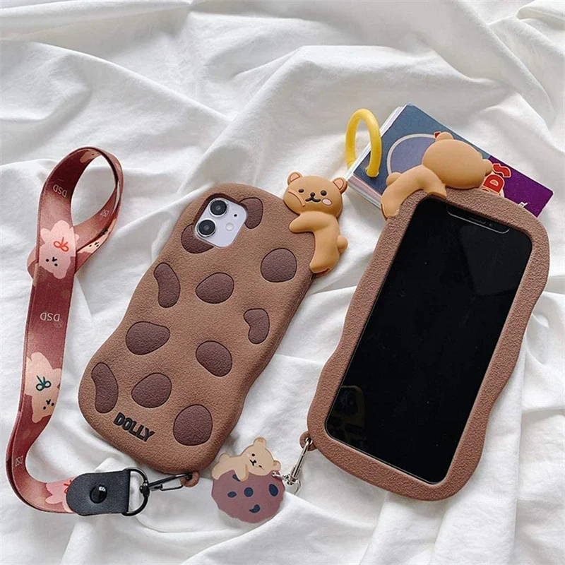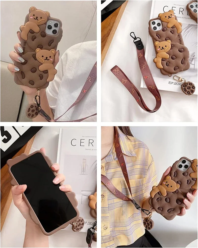 Funda de silicona con bonito dibujos animados Kawaii Cookie Bear para IPhone 14 13 11 12 15 Pro Max Plus XS XR X 15Pro con funda de llavero con cordón