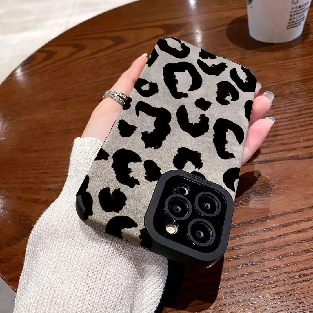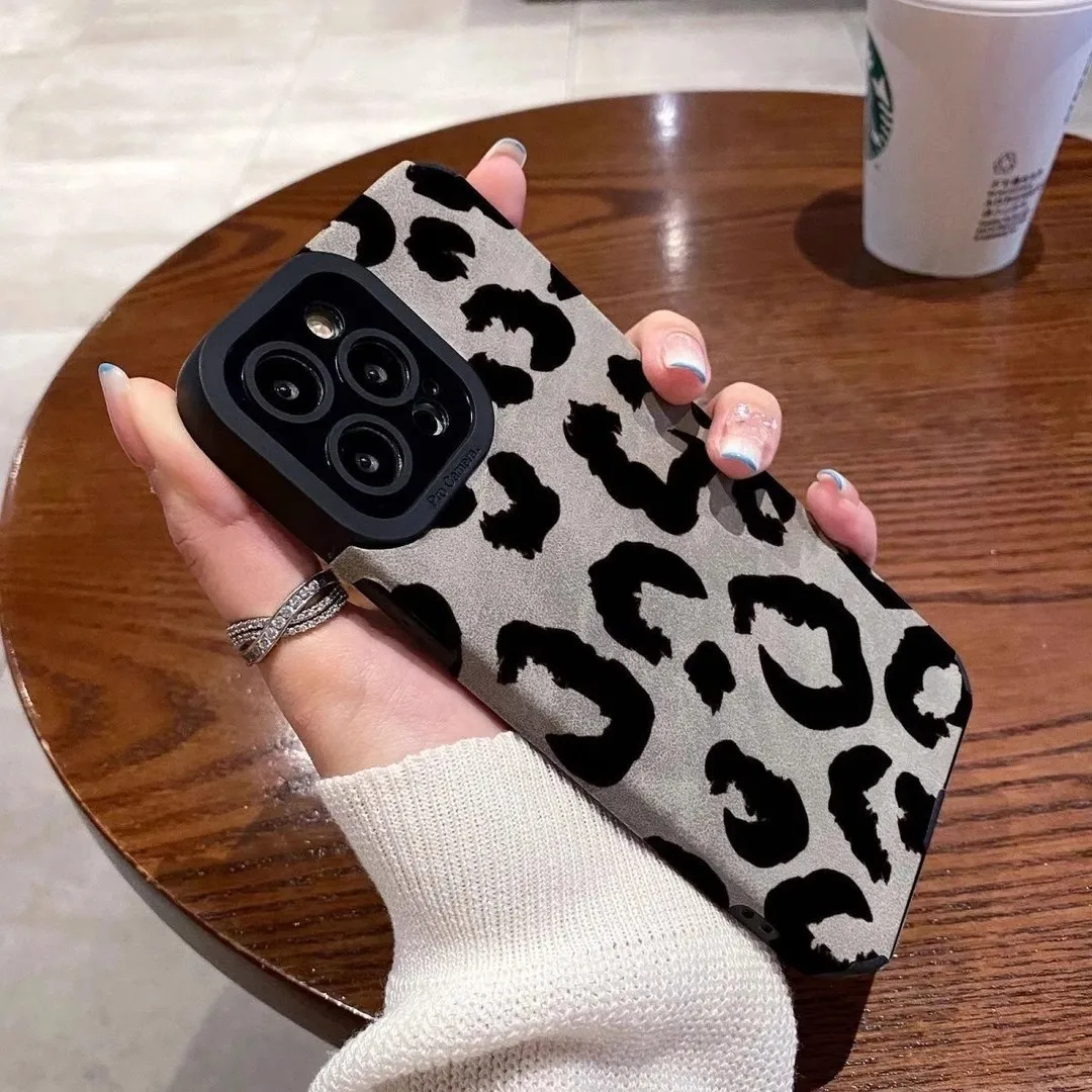 Funda de silicona con estampado de leopardo de cuero gris a la moda para iPhone 15 14 16 Pro Max Plus 13 11 12 Mini XR XS X funda de teléfono mate suave