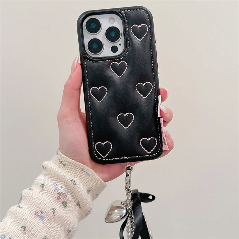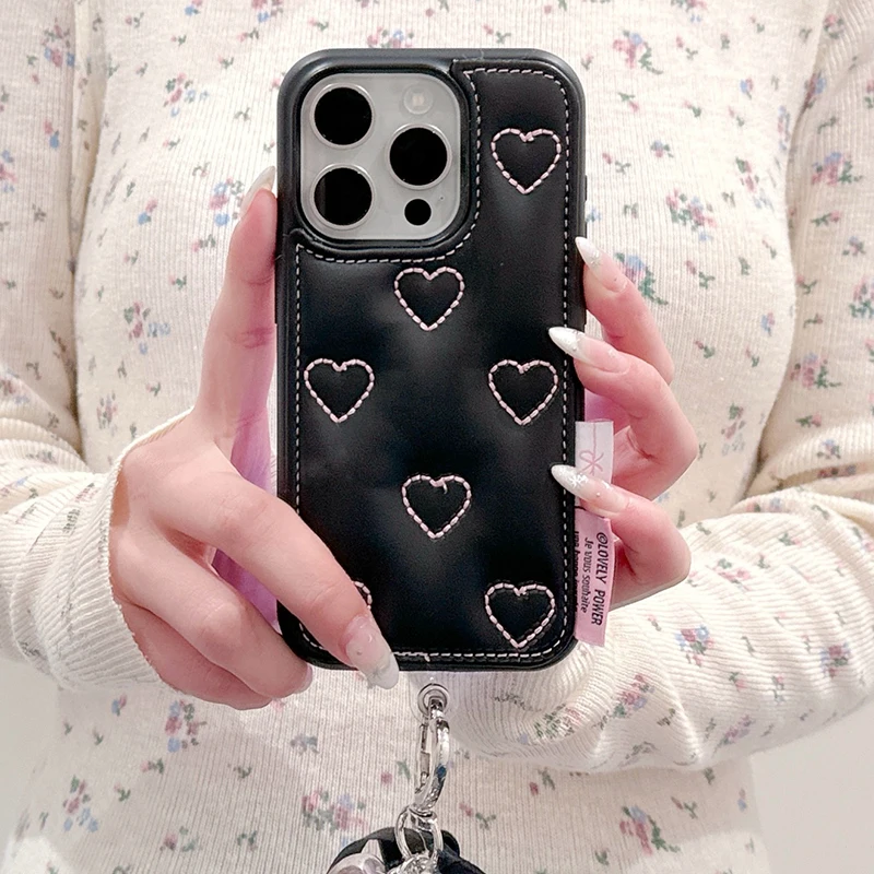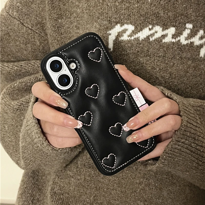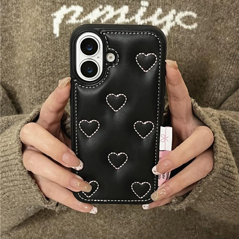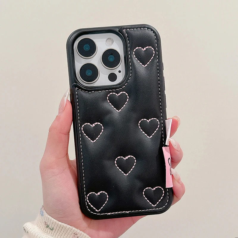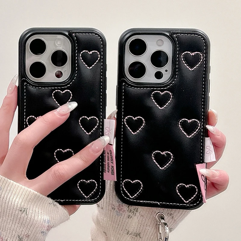Stylish Love Heart Leather Down Jacket Silicone Case For iPhone 13 14 15 16 Pro Max Soft Shockproof Phone Back Cover