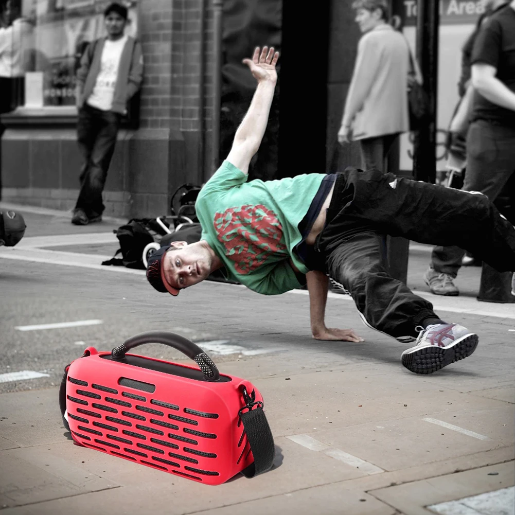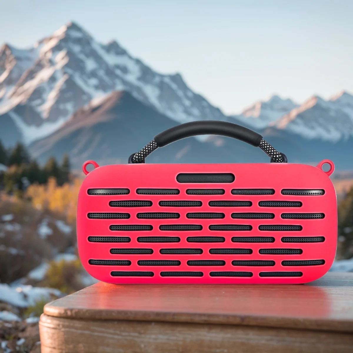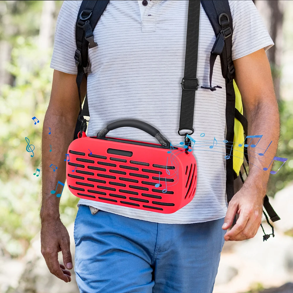 4. Ultraportátil y práctico:La carcasa exterior de silicona es fácil de instalar y quitar, y viene con una correa de hombro desmontable. La correa de 1,3 metros es lo suficientemente larga y está equipada con ganchos extraíbles, lo que le permite ajustarla al estilo de un solo hombro o bandolera según sus preferencias. También se puede transportar mediante el asa integrada del altavoz, lo que garantiza la comodidad incluso durante salidas largas.