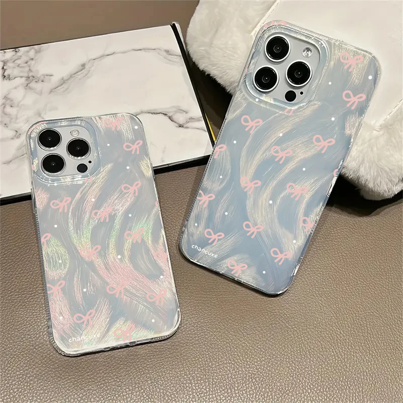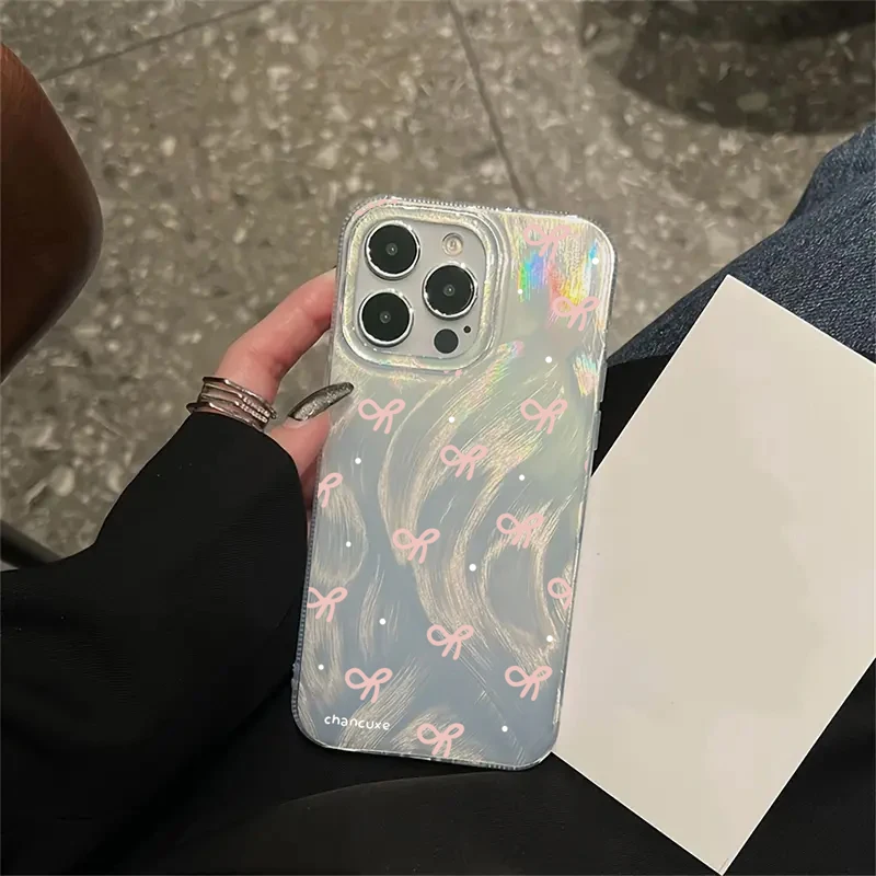Comprar Funda de silicona con gradiente plateado láser y nudo de lazo de lujo para iPhone 16 15 fundas iPhone 14 13 12 11 Pro Max XS X XR 7 8 Plus 15