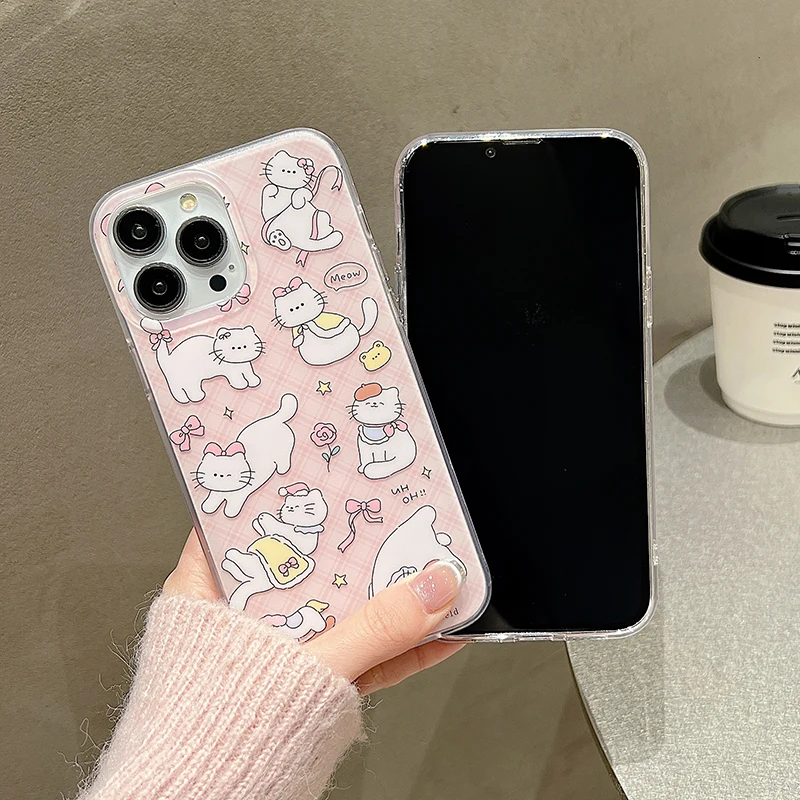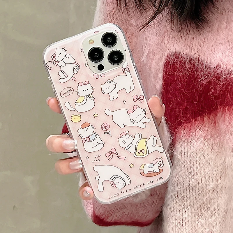 Lovely White Cat Pink IMD Funda de silicona para iPhone 11 12 13 14 15 Pro Max 15 Plus Funda de teléfono a prueba de golpes