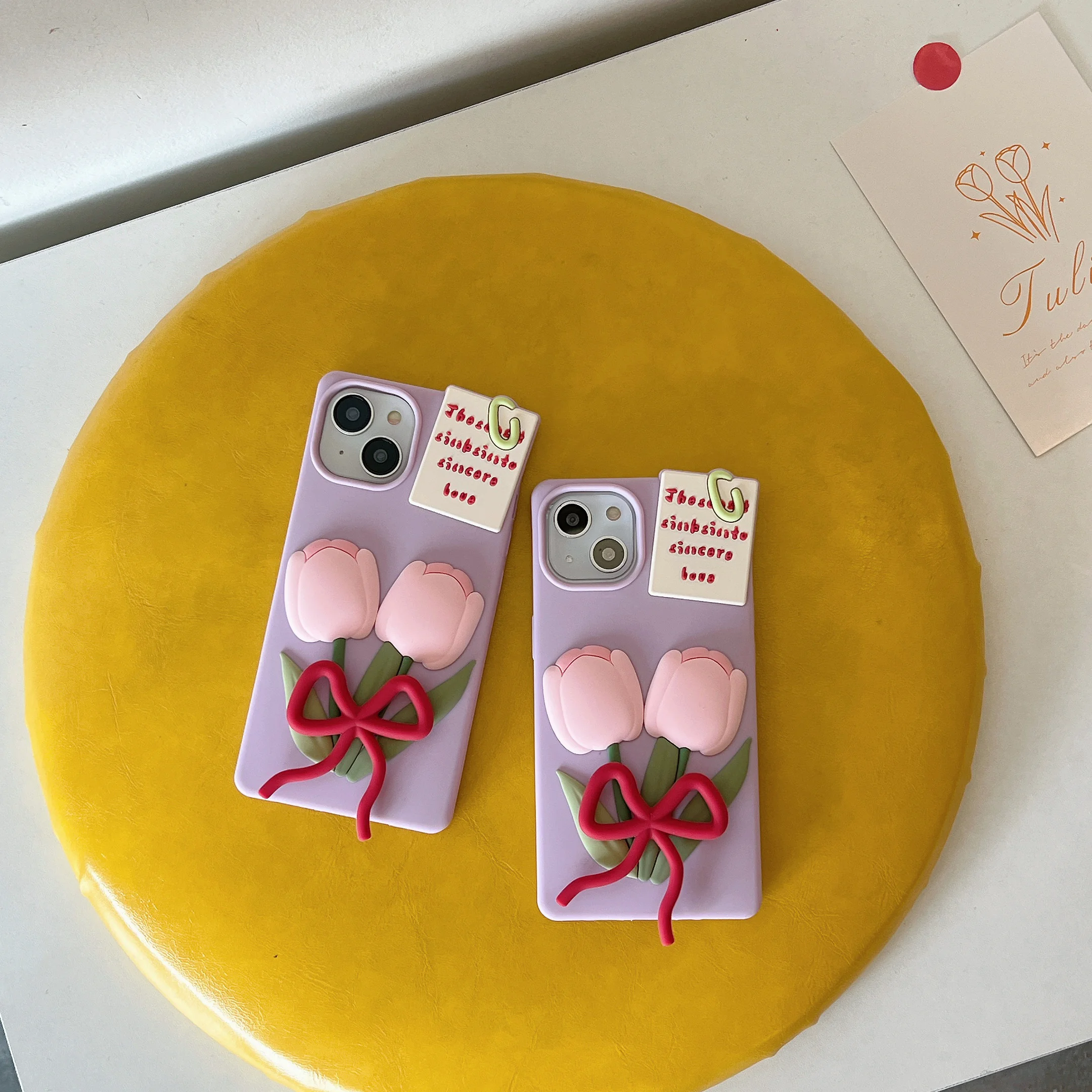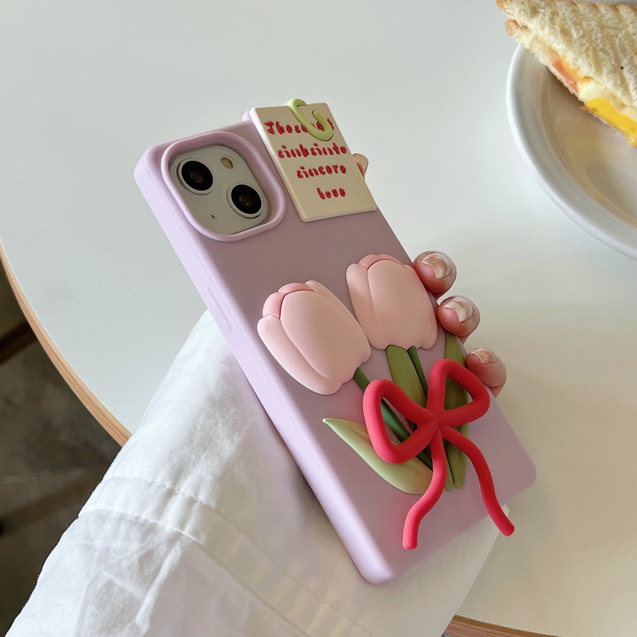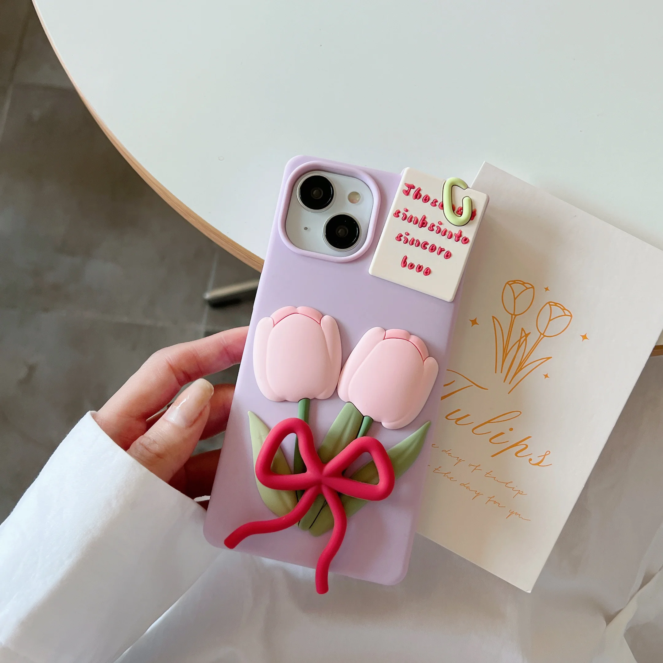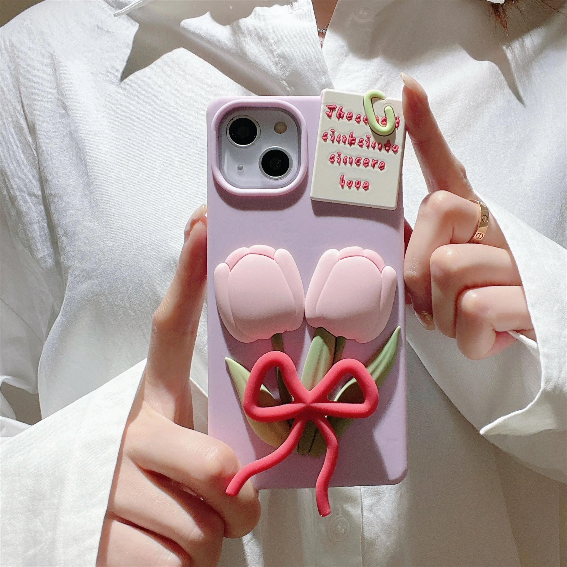 Comprar Funda de silicona con lazo de tulipán en 3D para Iphone, carcasa para Iphone 11, 13, 12, 12Pro, 13Pro, 13pro Max, 14, 14Pro, 14pro Max