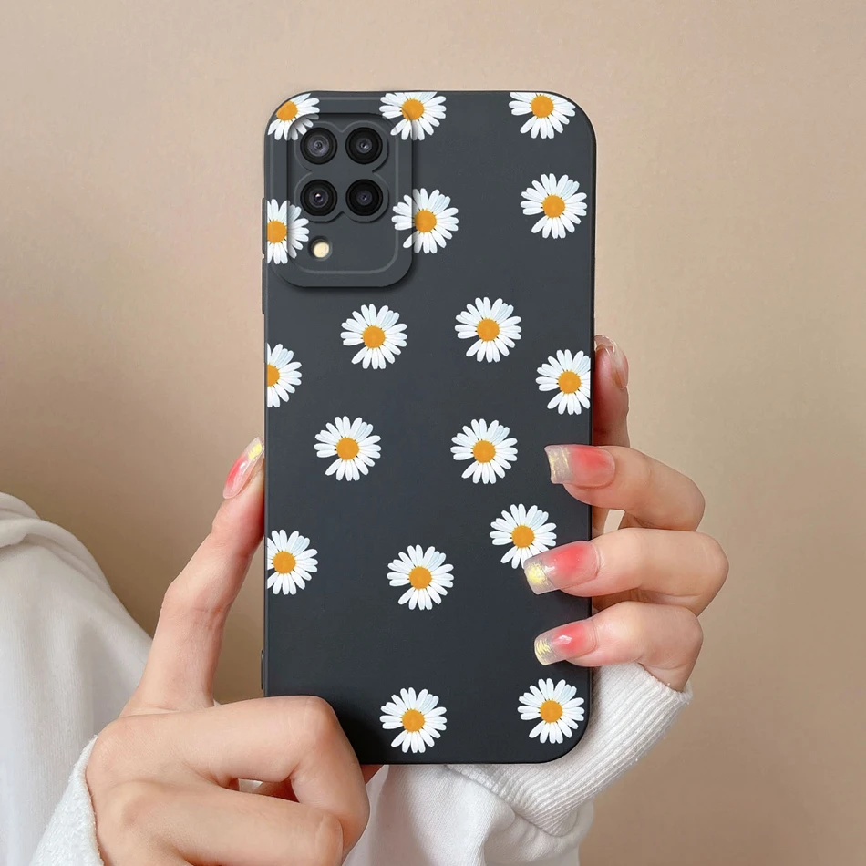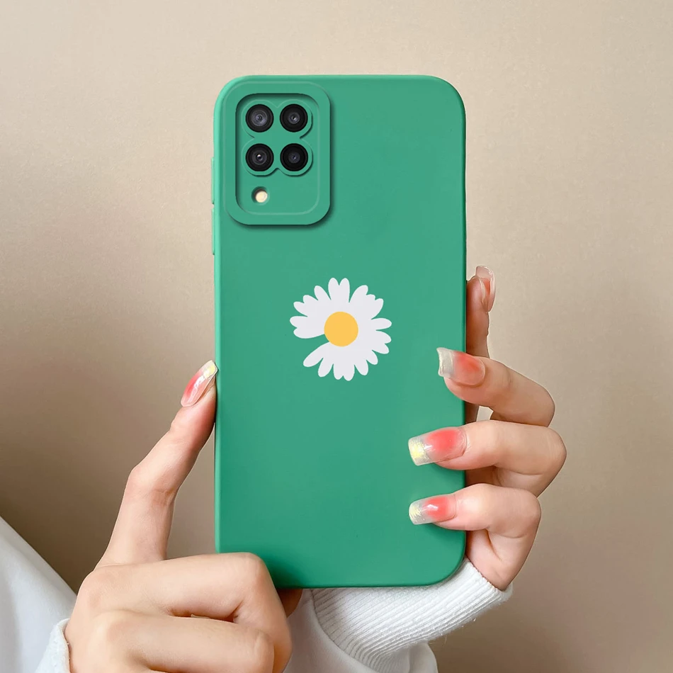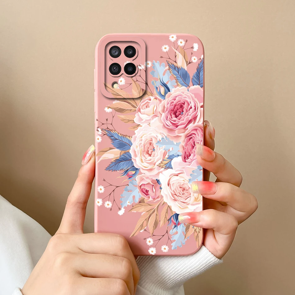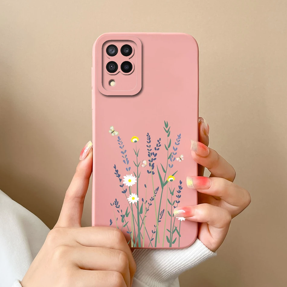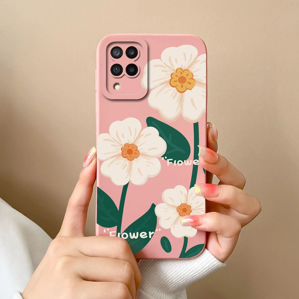 Comprar Funda de silicona líquida con flores pintadas para Samsung M22 M32, protección de lente, cubierta trasera de teléfono para Galaxy M 32 M 22